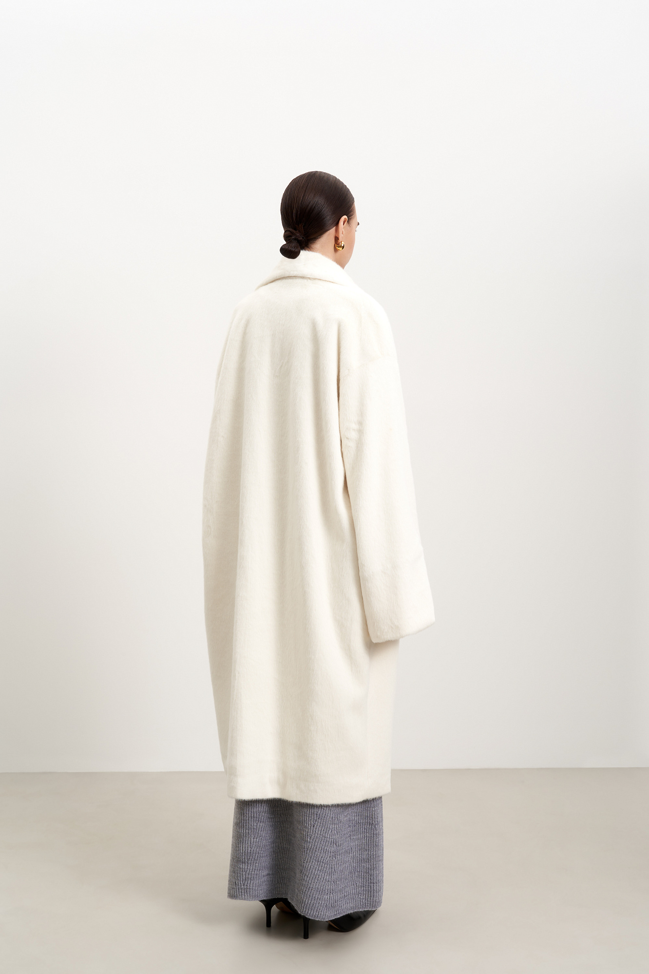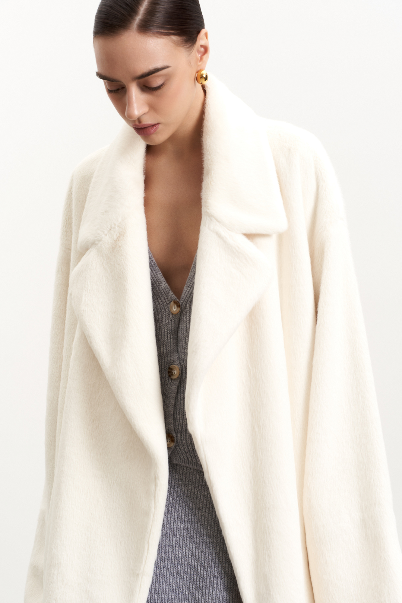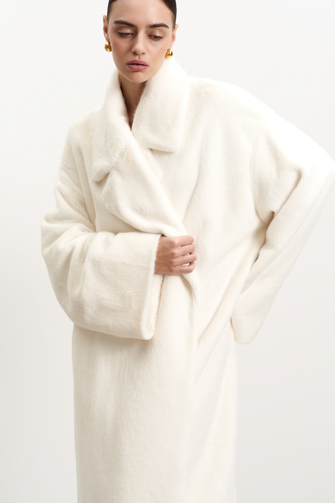 Шуба из экомеха на запах. Удобный вариант для повседневного городского стиля. Классический крой, английский воротник и длинный пояс. Легко впишется в базовый гардероб.