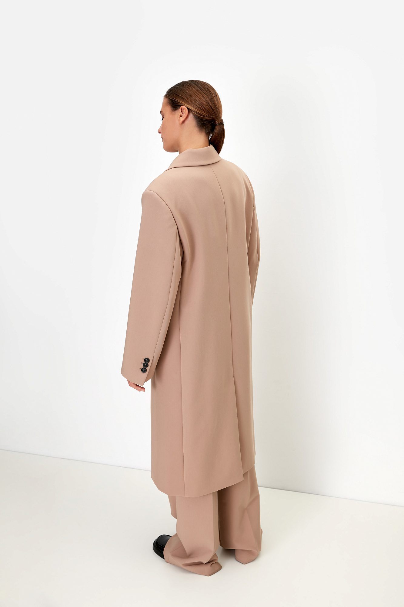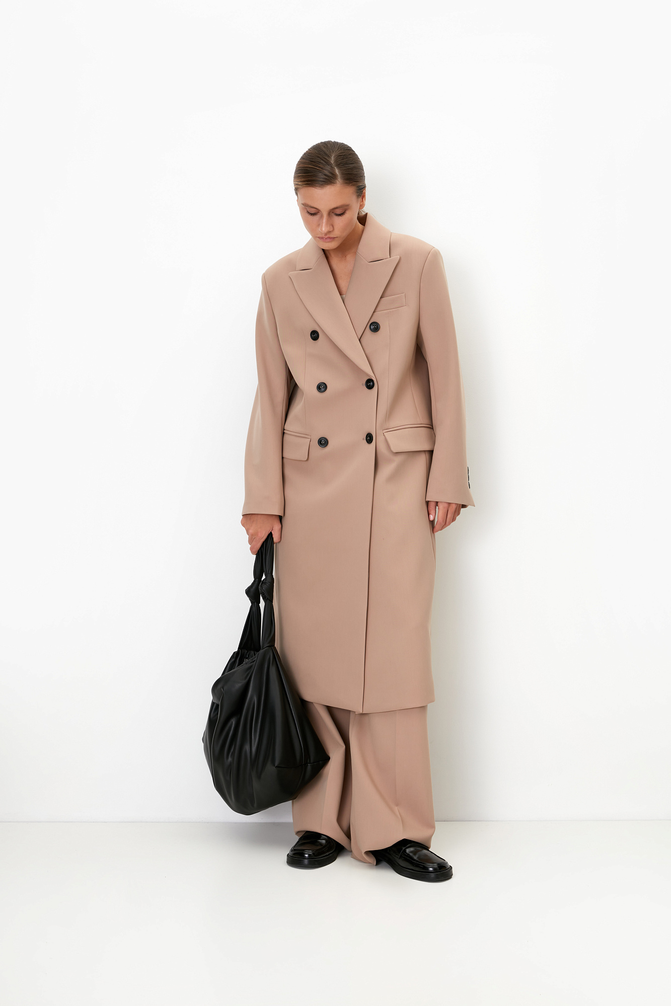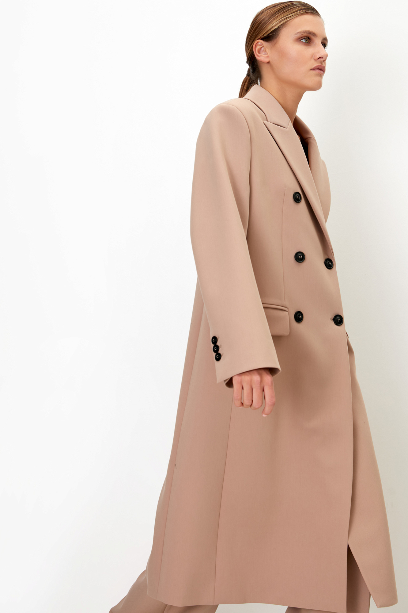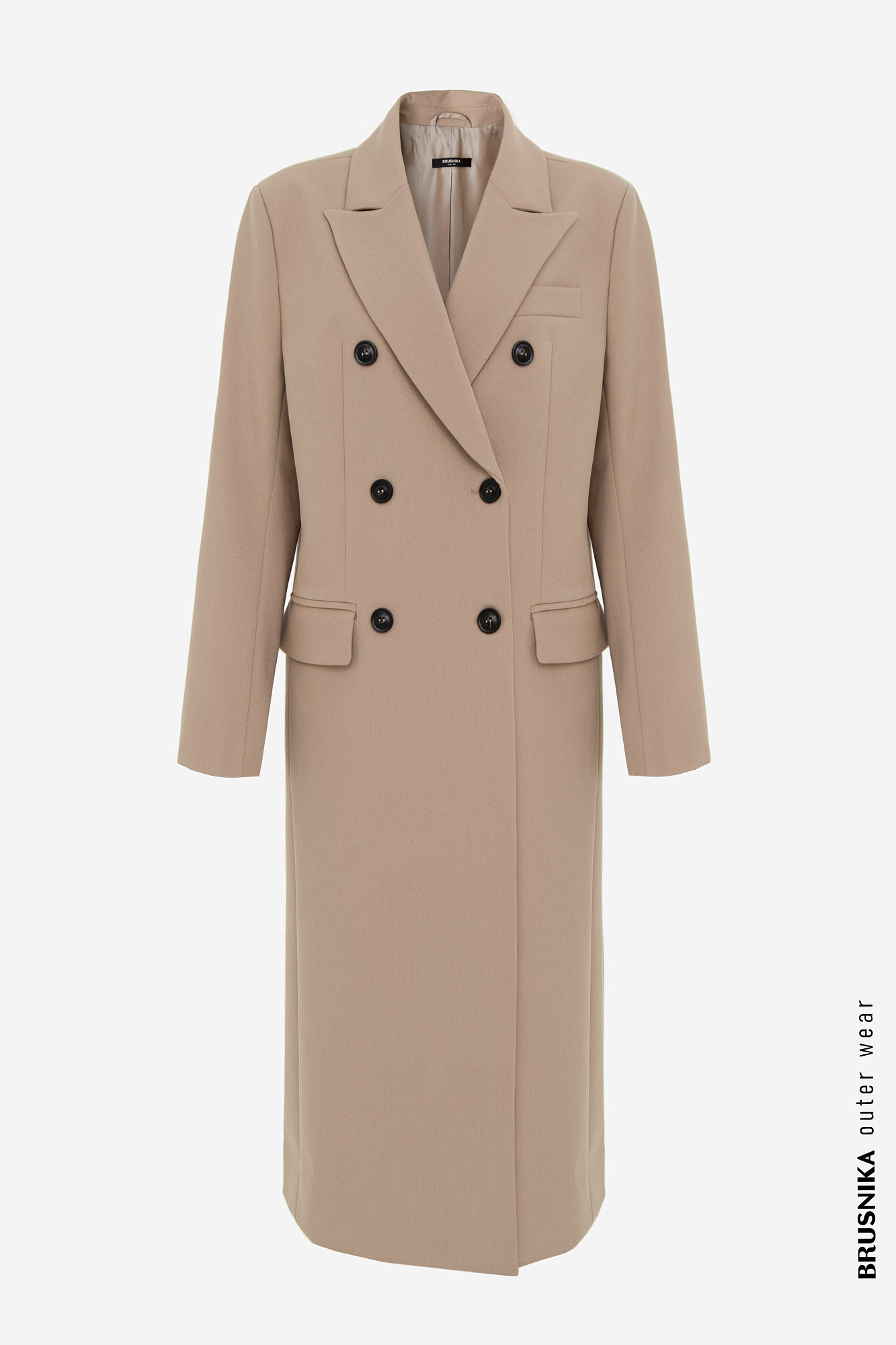 Двубортное, тонкое пальто из поливискозы с карманами по бокам. Застежка на пуговицах
