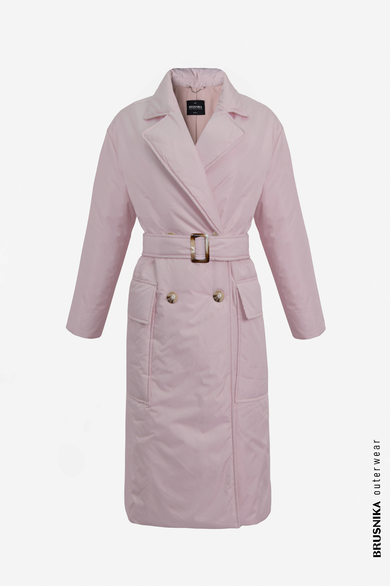 Двубортное утепленное пальто. Модель прямого кроя дополнена поясом в тон,воротник с лацканами, застежка на пуговицы, два больших накладных кармана.