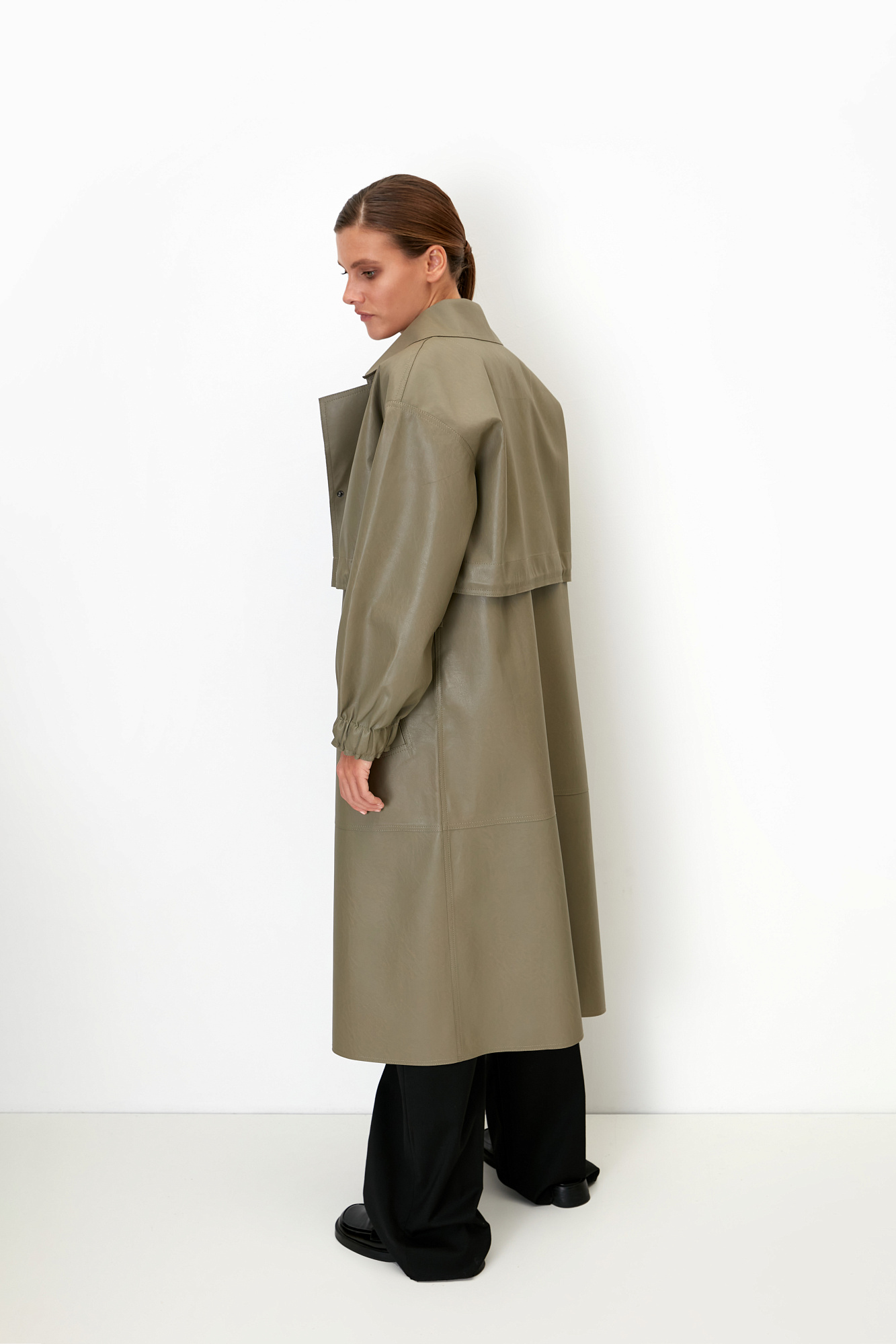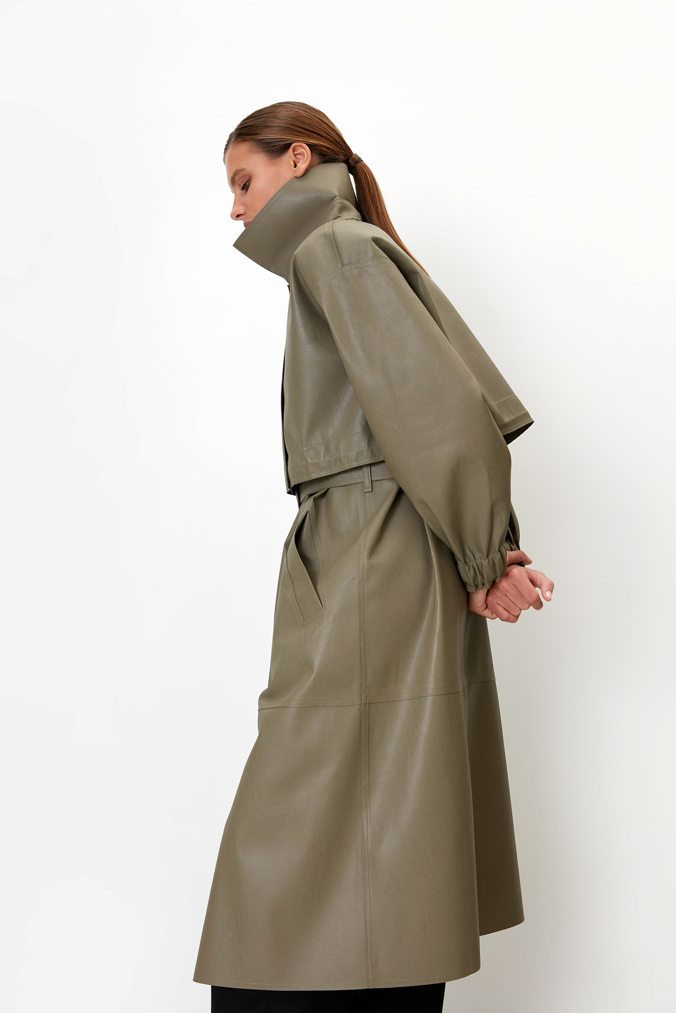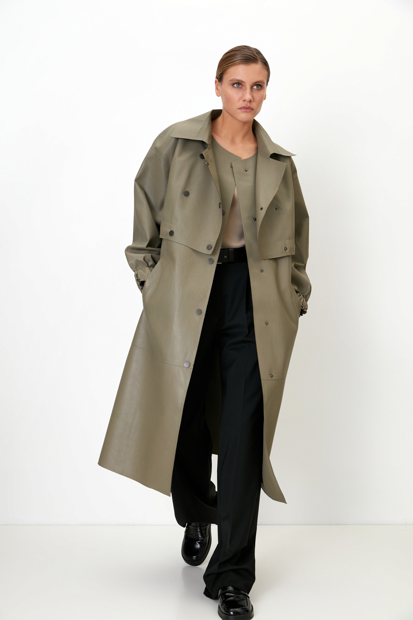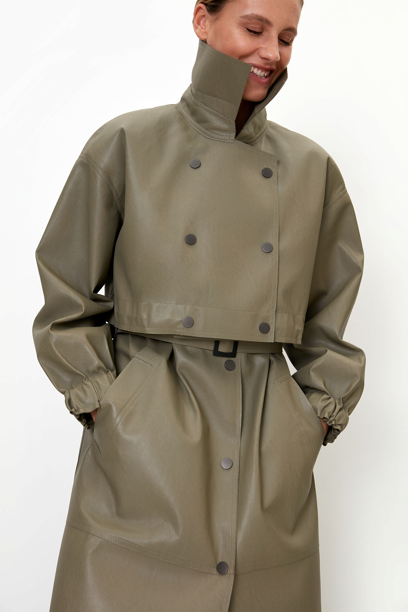 Двойной плащ из экокожи трансформируется в короткую куртку и длинный жилет. Модель свободного кроя, пояс с пряжкой в тон, шлица сзади, застежка на кнопках.