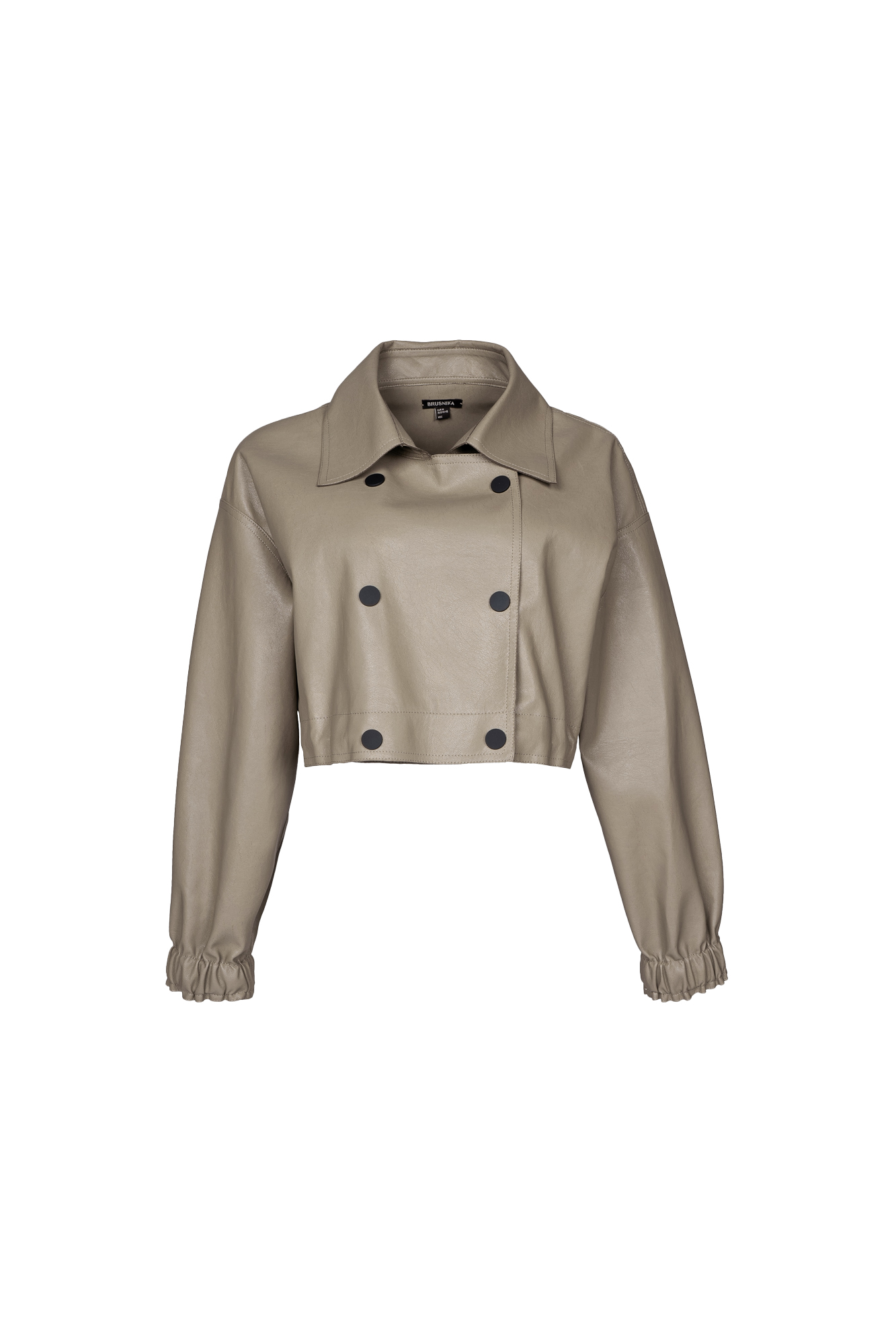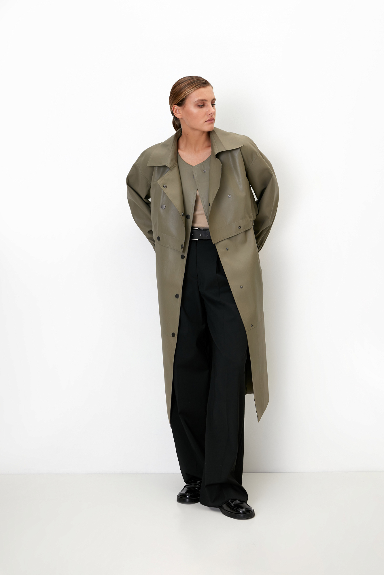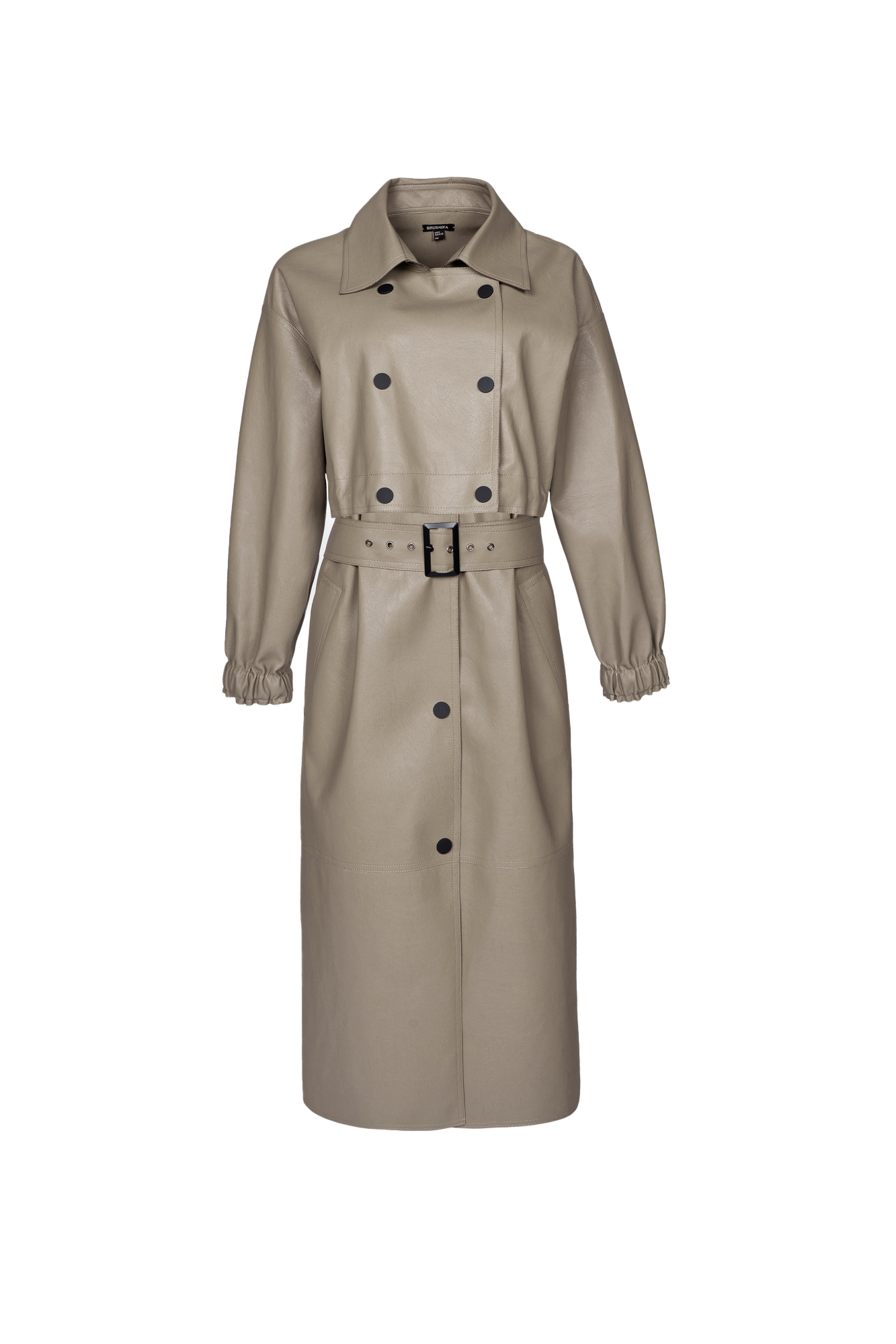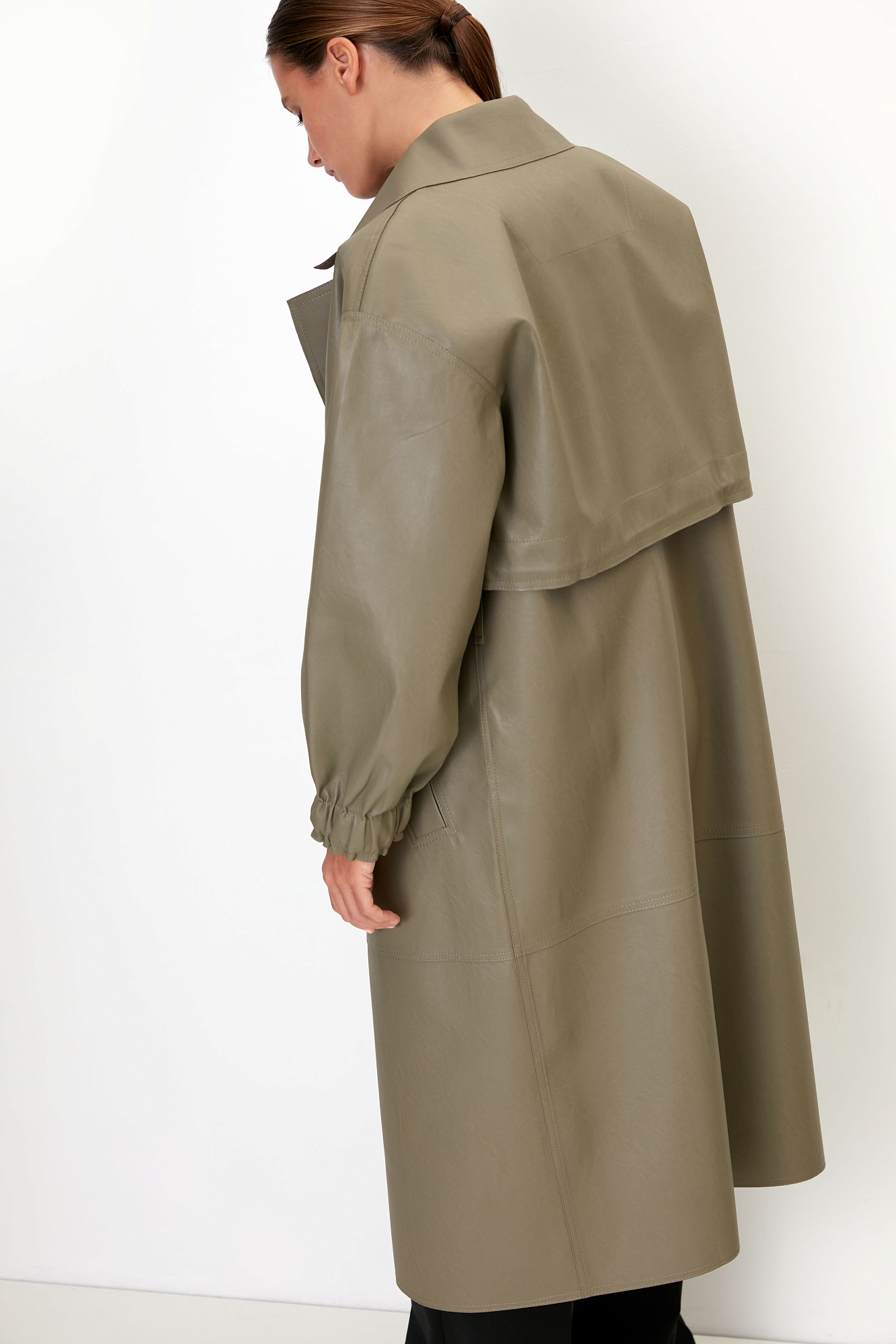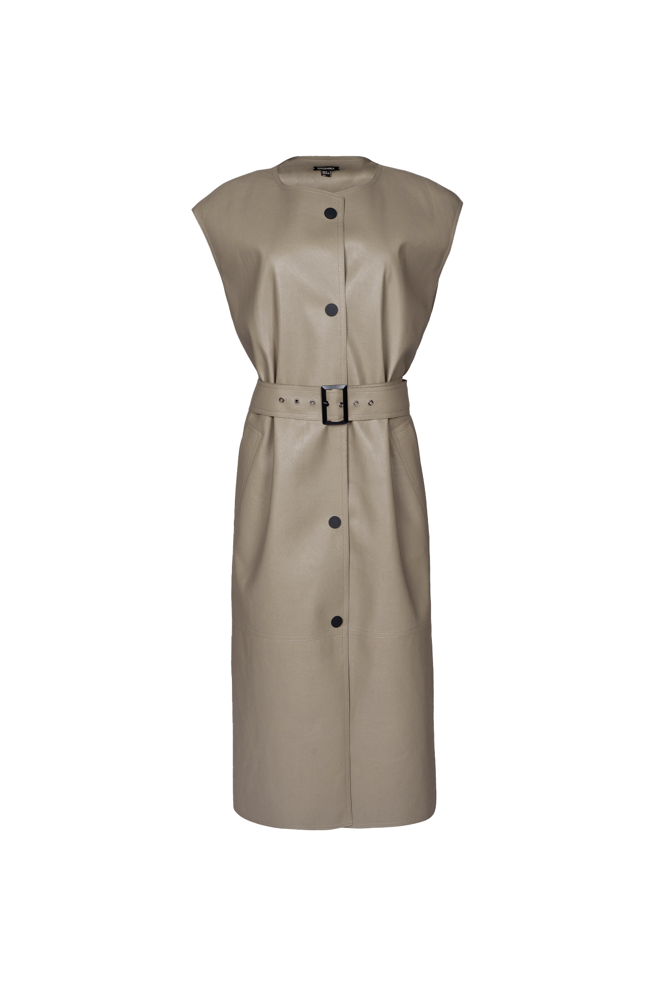Двойной плащ из экокожи трансформируется в короткую куртку и длинный жилет. Модель свободного кроя, пояс с пряжкой в тон, шлица сзади, застежка на кнопках.