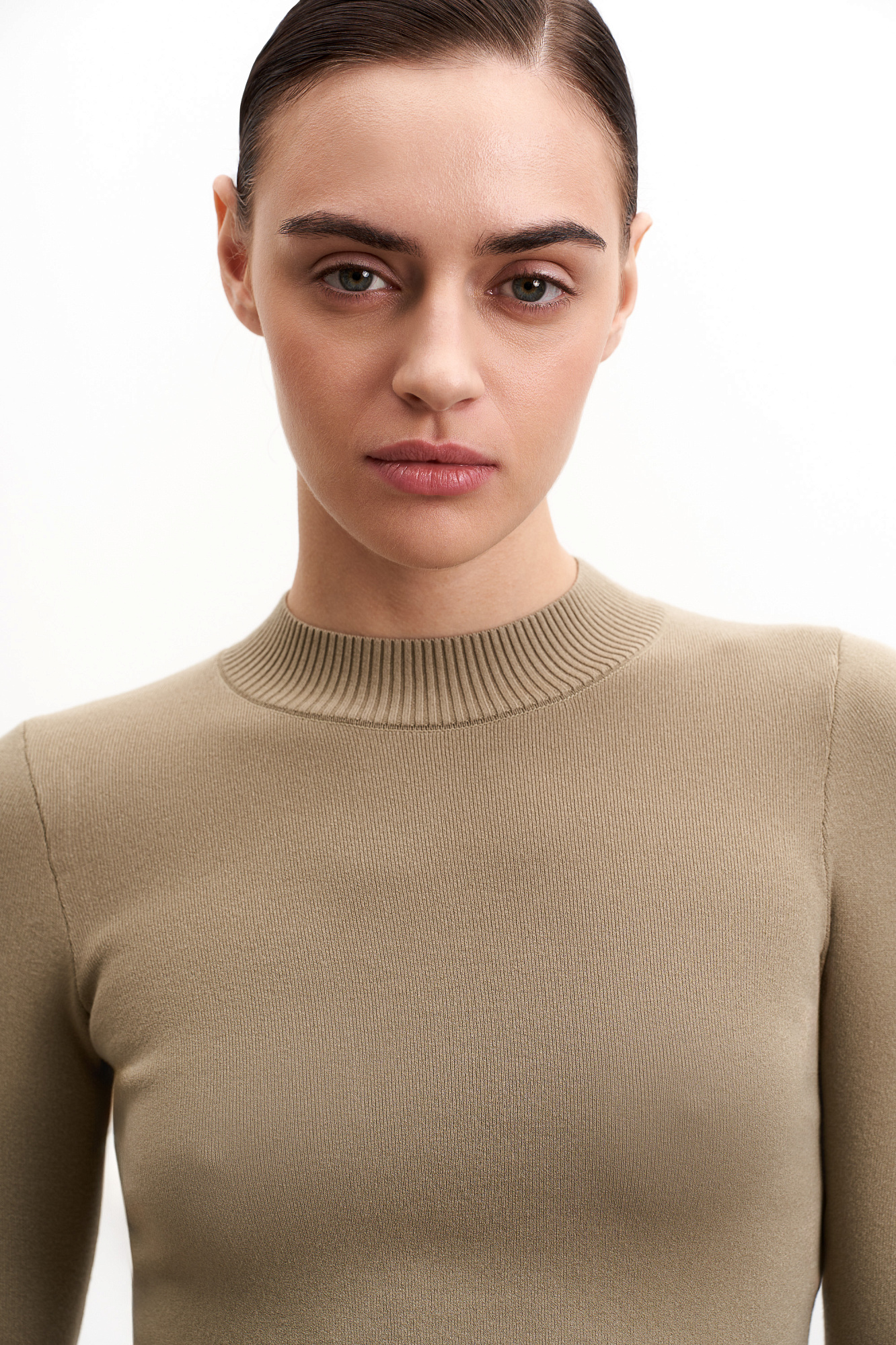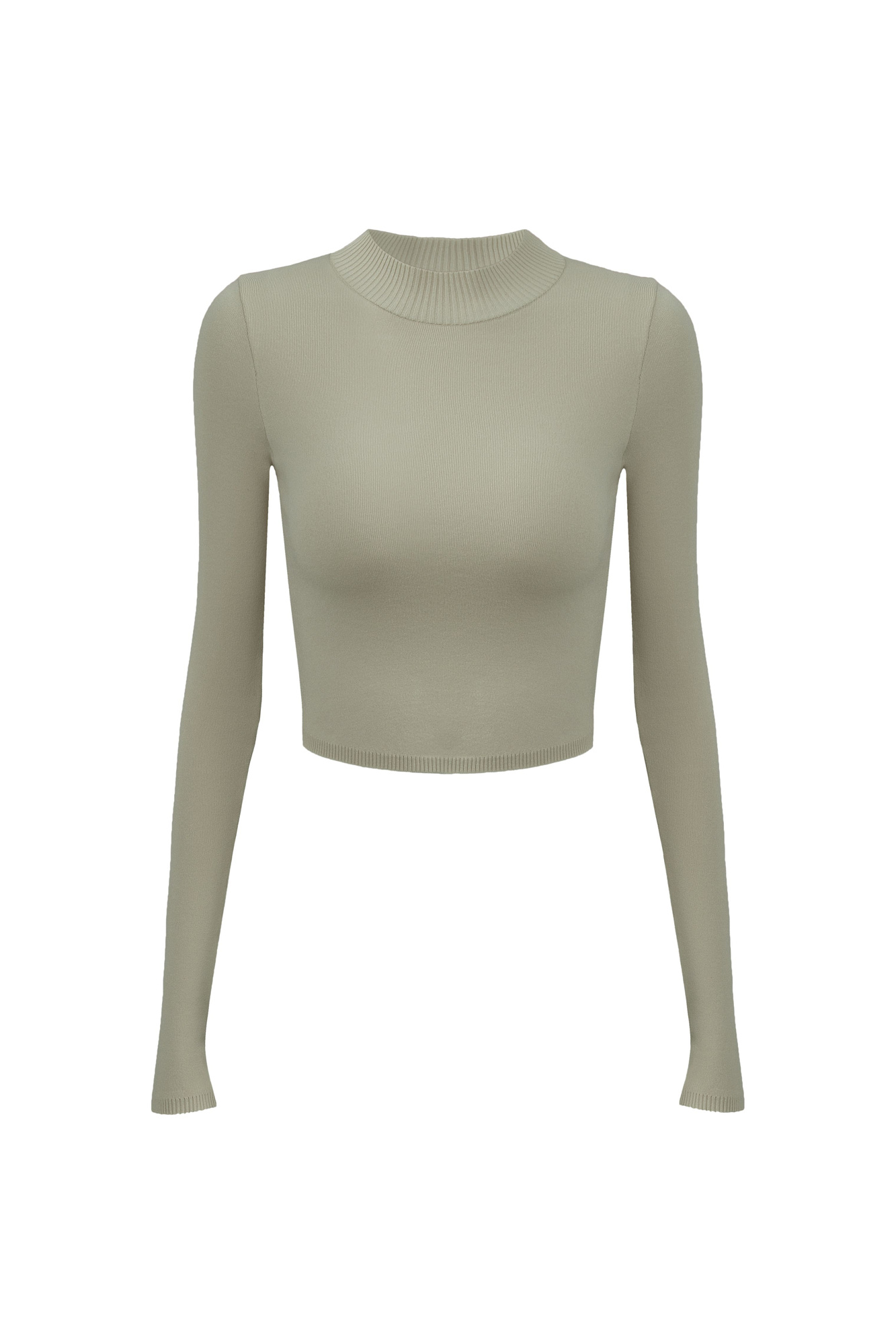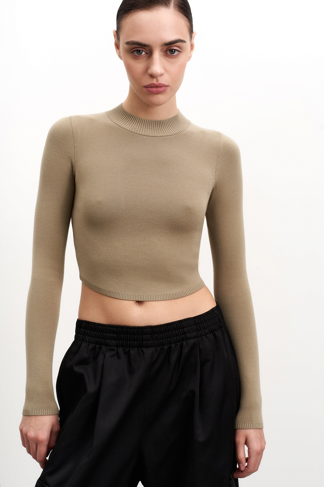 Трикотажный кроп-топ из вискозы с длинным рукавом, круглым вырезом горловины и фигурным низом. Края изделия выполнены в рубчик.