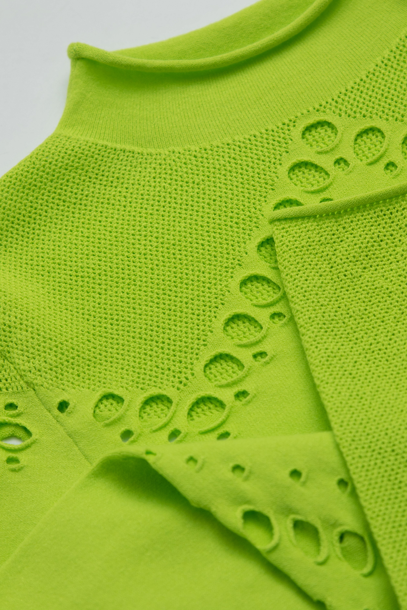 Трикотажная укороченная водолазка из тонкой эластичной вискозы. Модель облегающего силуэта, с длинными рукавами и невысоким воротником-стойкой. Изделие выполнено в комбинированной технике вязки, сочетающей гладь и сетку. Водолазка декорирована вырезами, создающими геометрический узор.