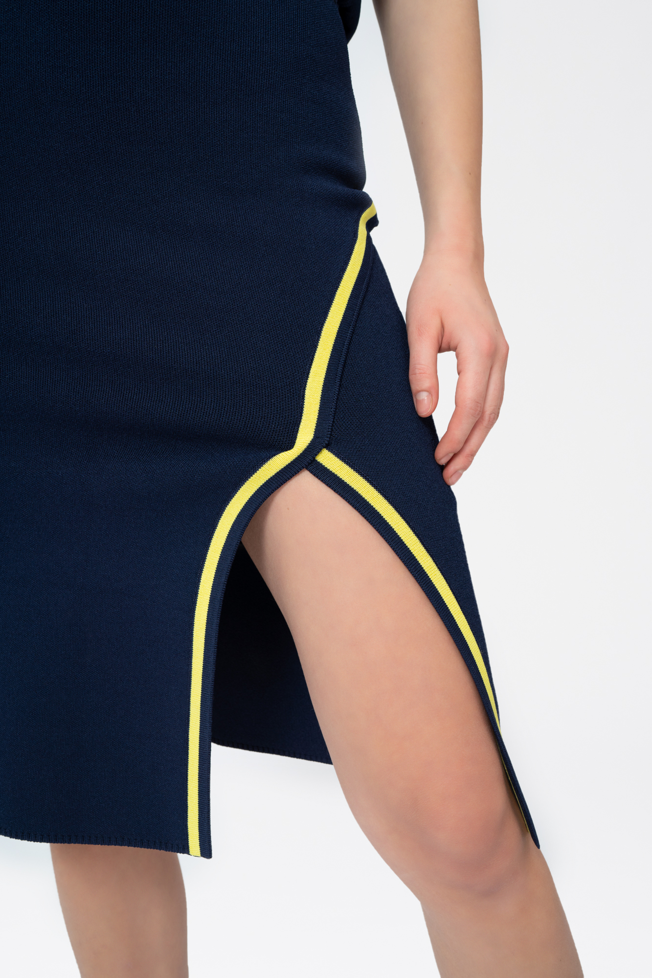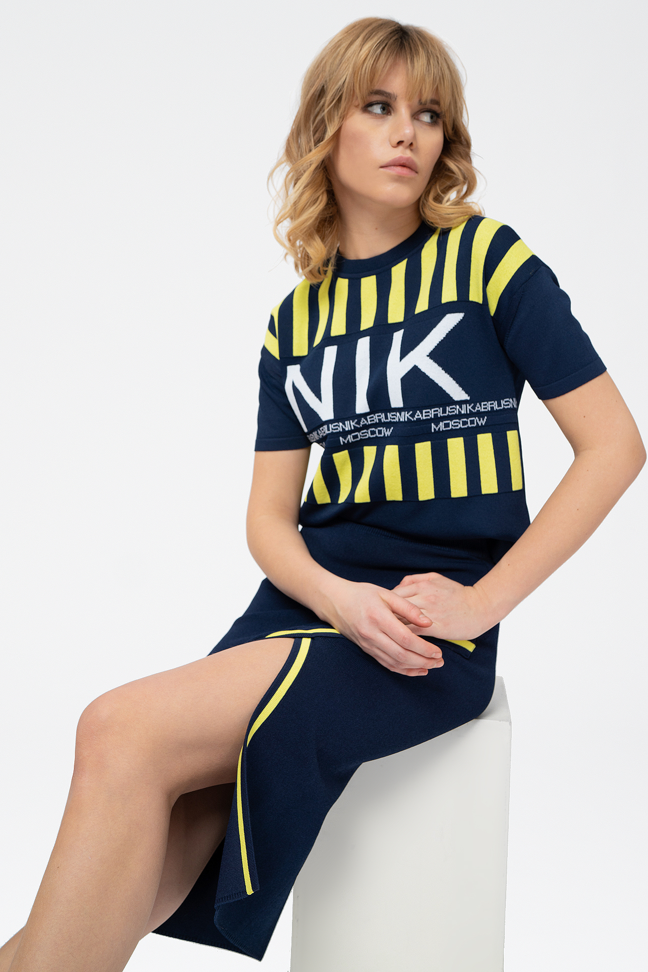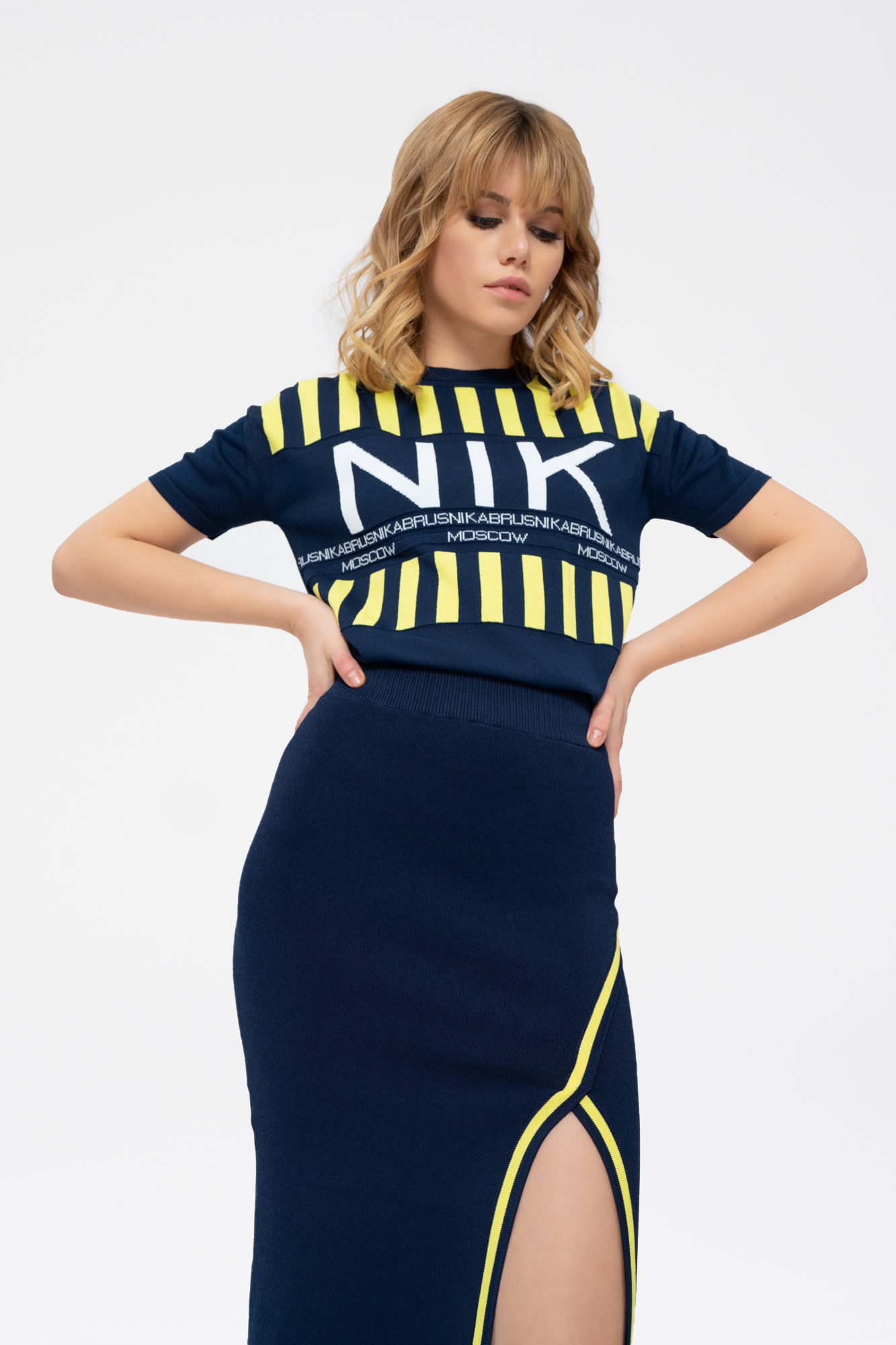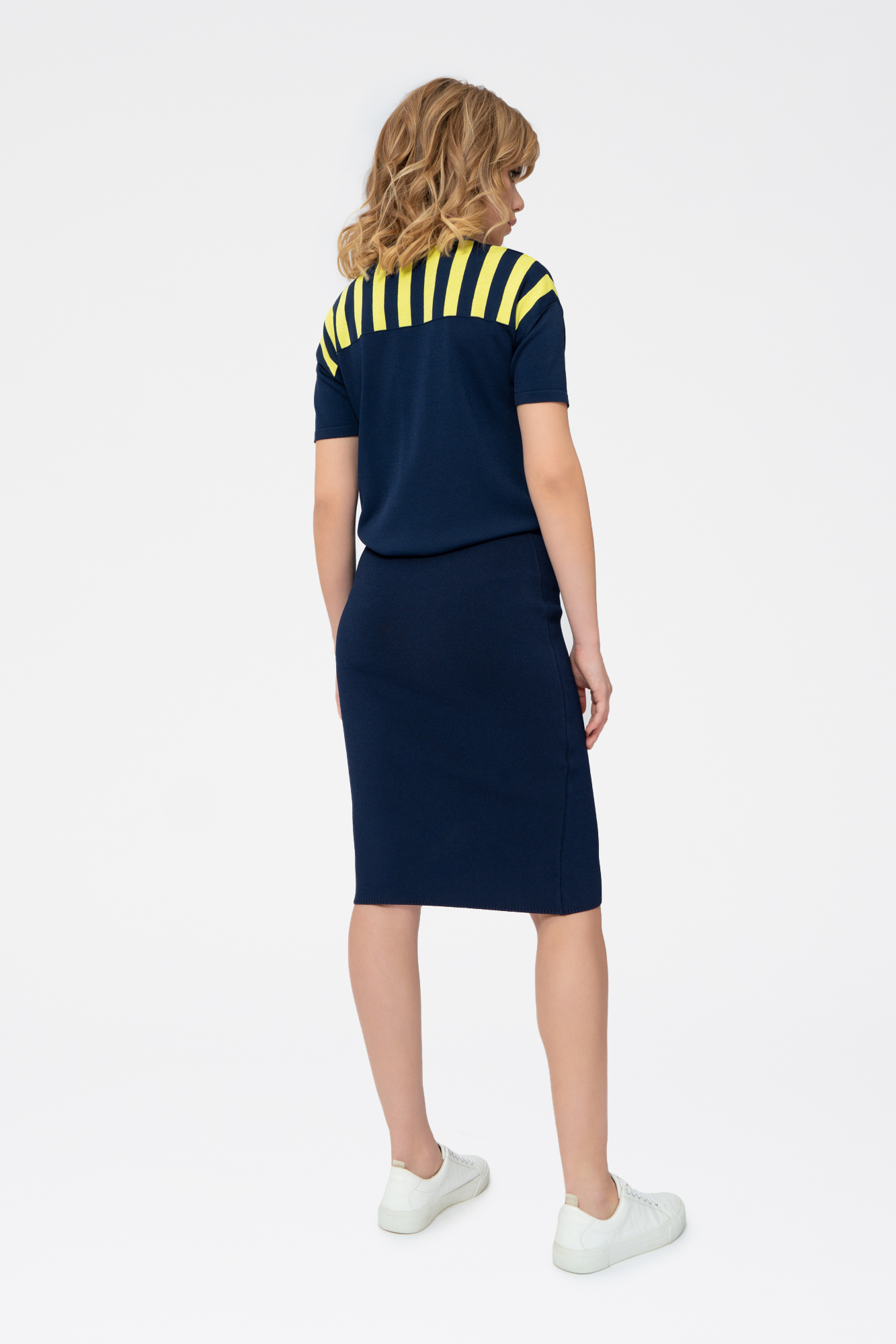 Вязаная юбка. Длина: до колена. С разрезом спереди и контрастными вывязаными лампасами. Фиксируется на талии.