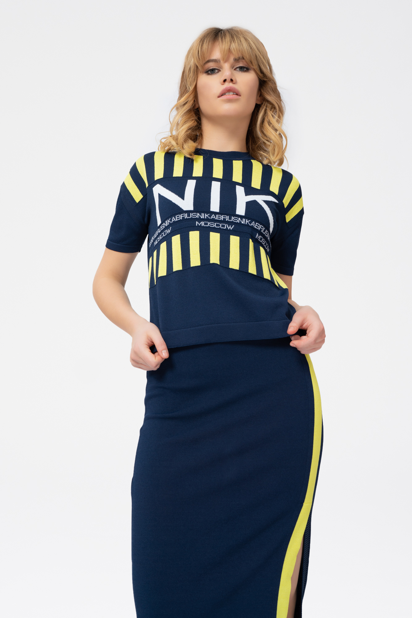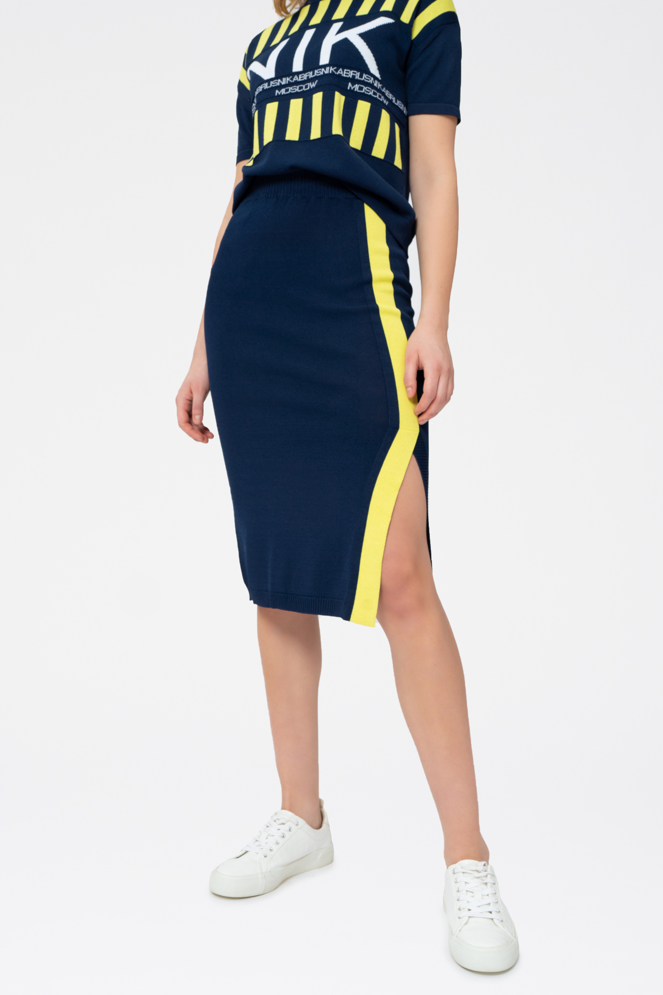 Юбка - миди приталенной формы, с декортивным разрезом и контрастным лампасом сбоку.