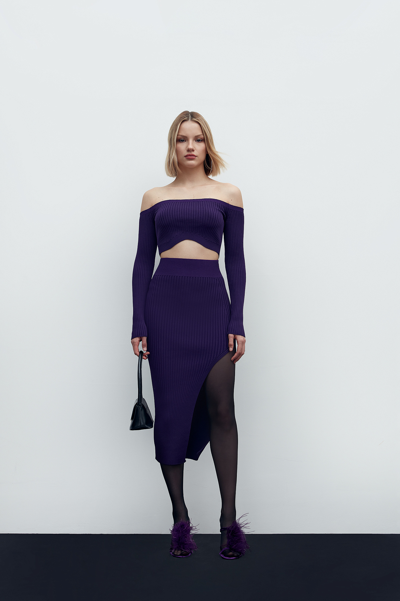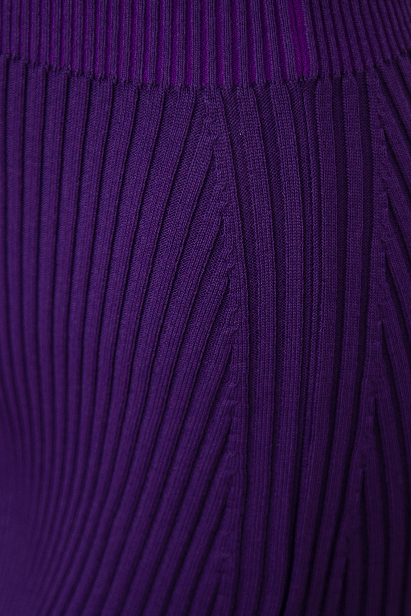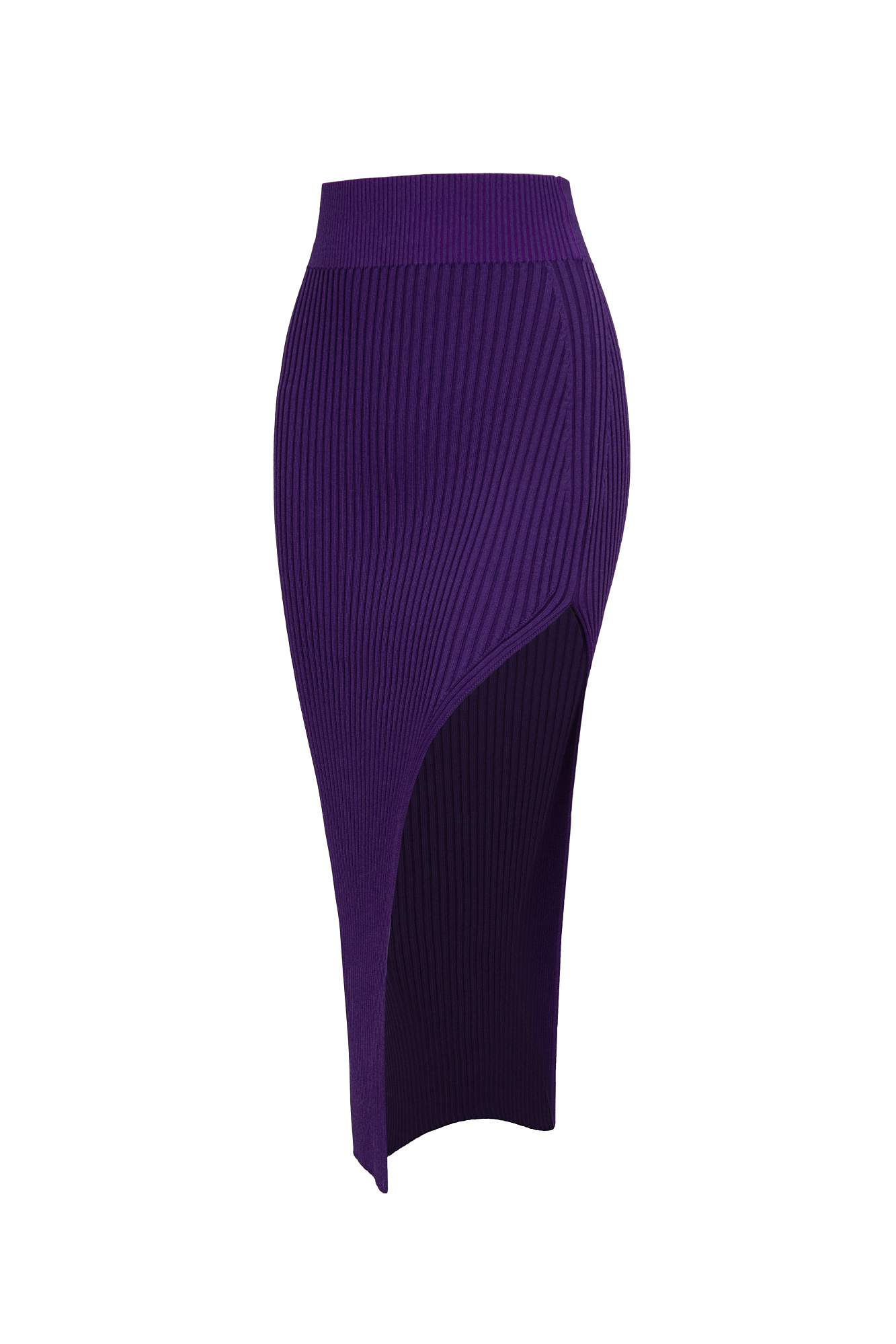Трикотажная юбка в рубчик, повторяющая изгибы с боковым разрезом и широким эластичным поясом.