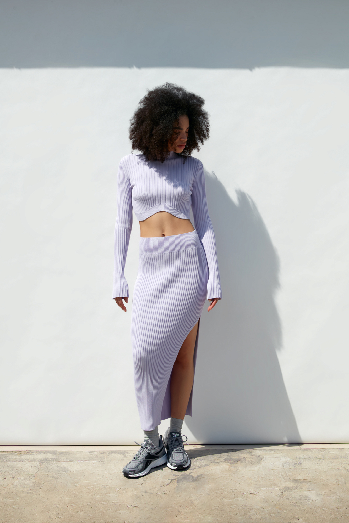 Трикотажная юбка в рубчик, повторяющая изгибы с боковым разрезом и широким эластичным поясом.
