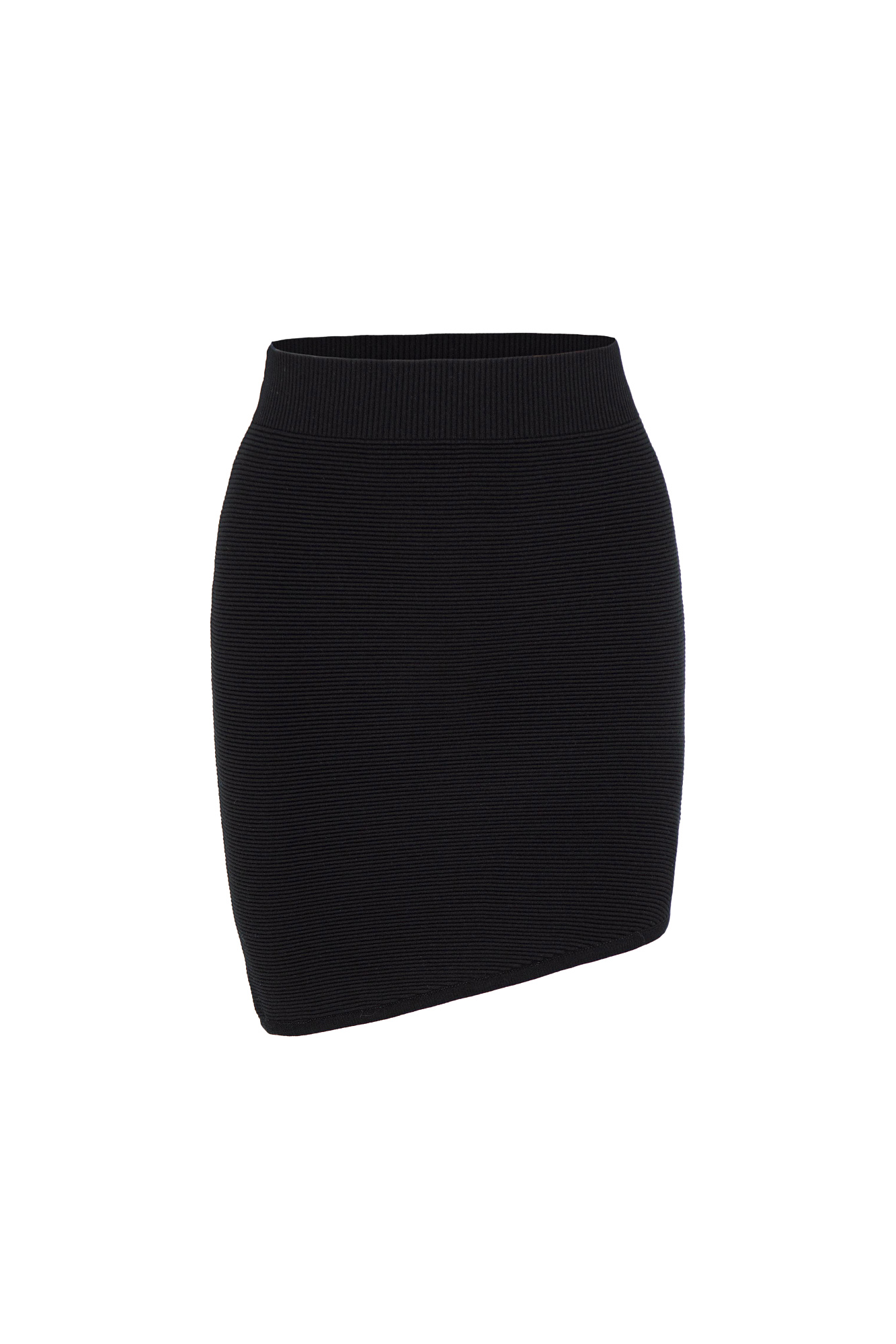 Трикотажная юбка длины мини из вискозы с эластичным поясом и асимметричным низом.