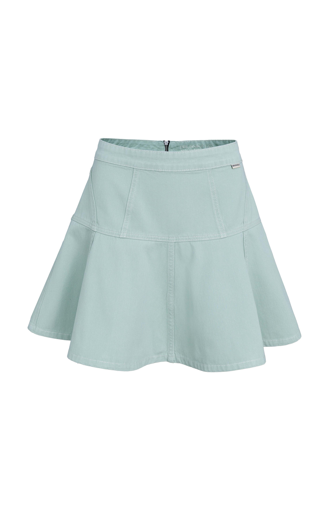 Джинсовая юбка длины мини с брендированным ярлыком на поясе и застежкой на молнию сзади. Дополнить образ можно бомбером.