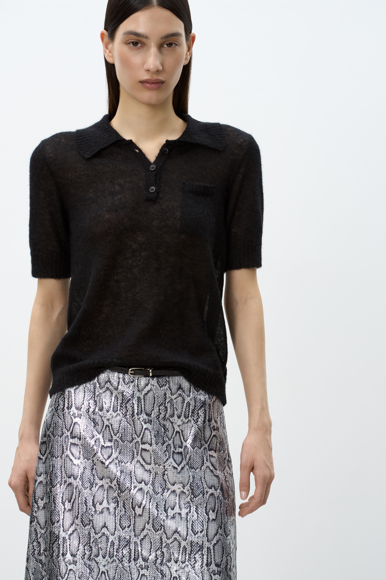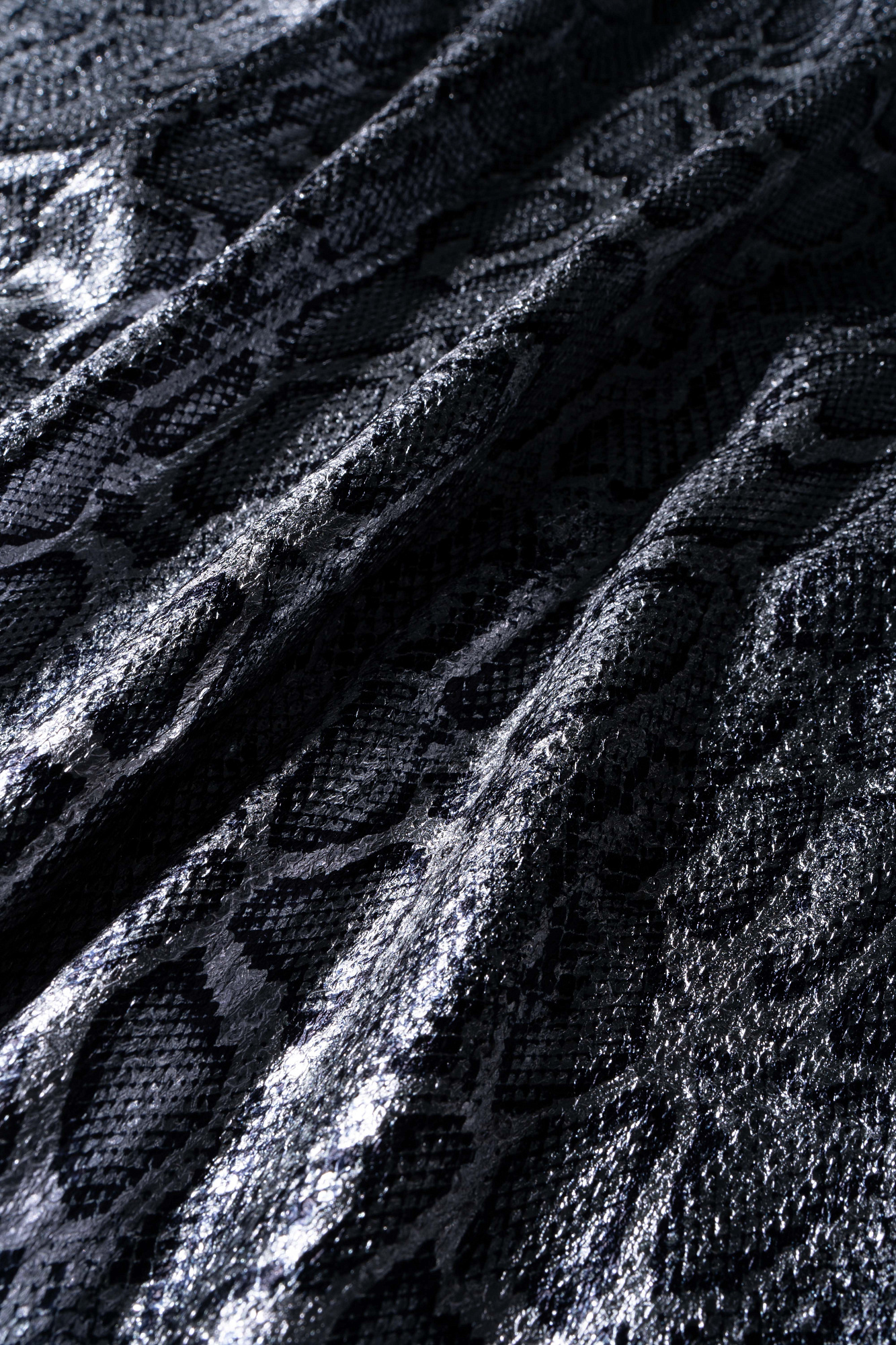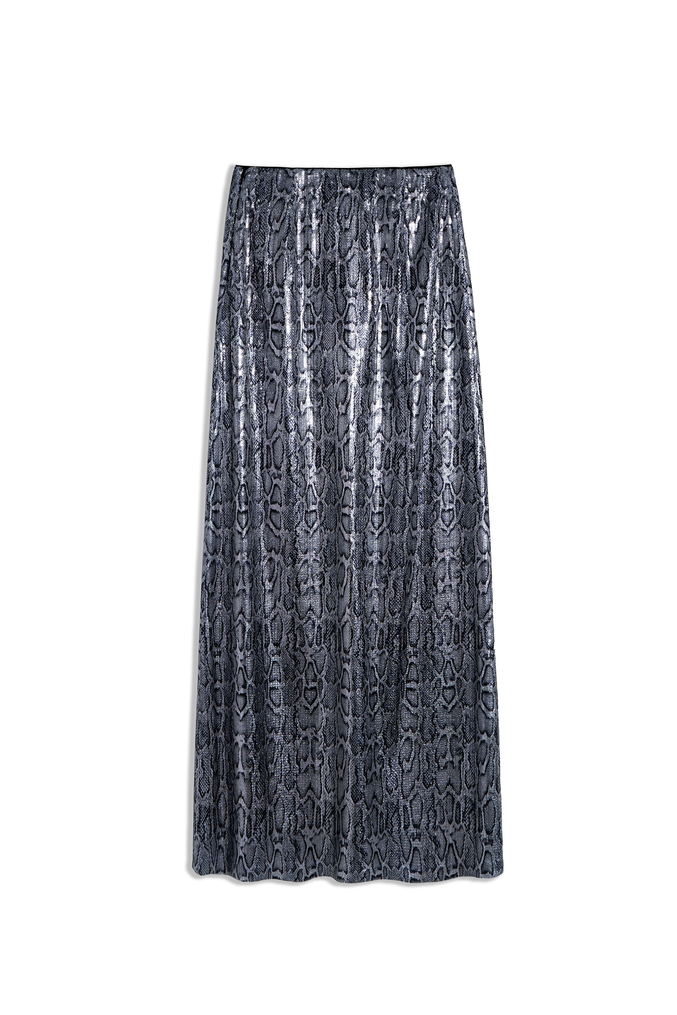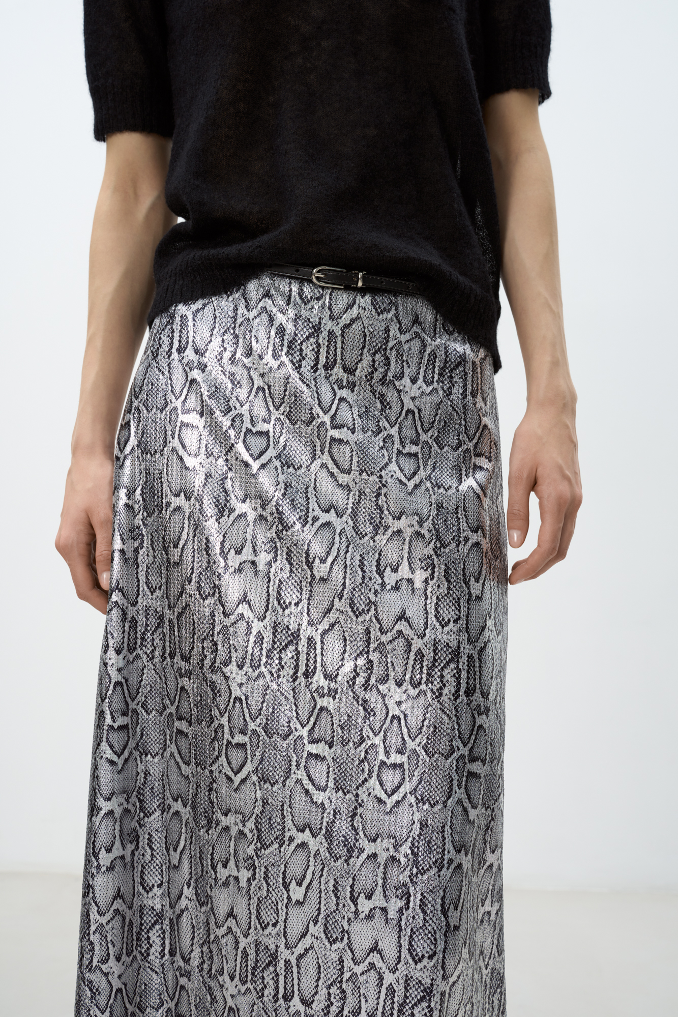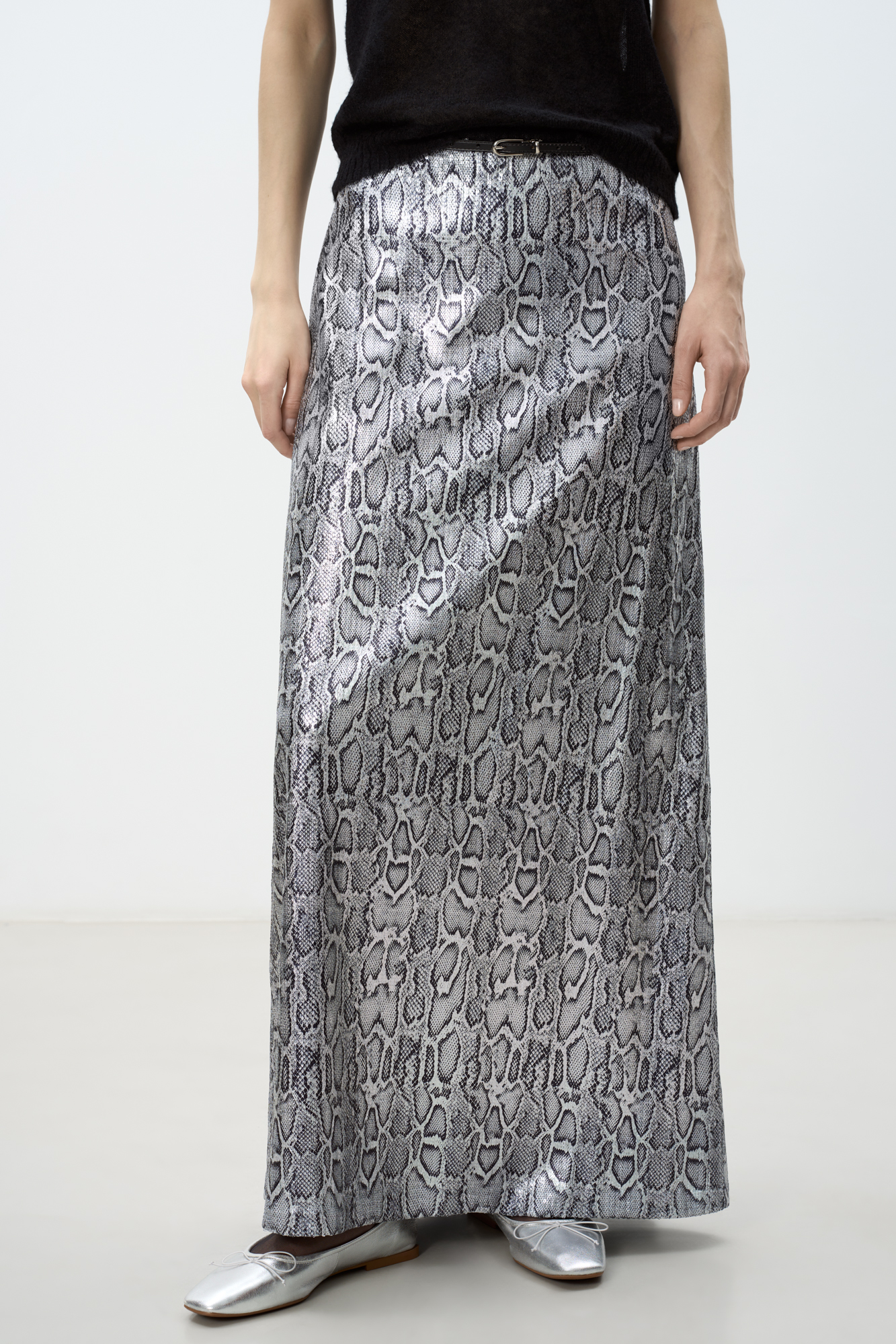 Юбка длины макси из текстурной ткани с анималистичным принтом, имитирующим чешую змеи. Изделие декорировано небольшими пайетками. Модель прямого силуэта. Застежка на молнию. На подкладке.