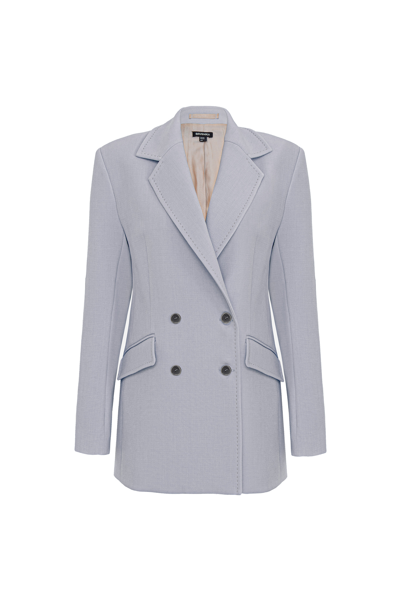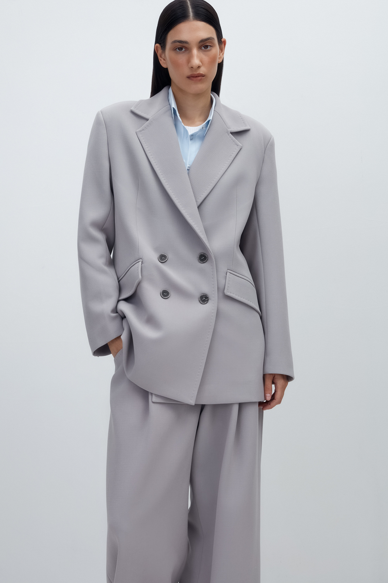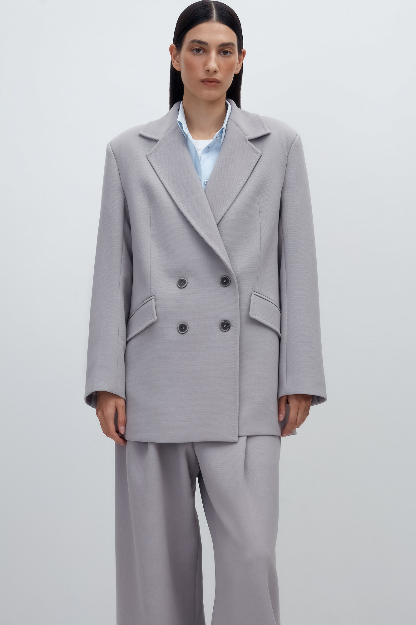 Приталенный двубортный жакет из вискозы с отстрочой и боковыми карманами. Дополнить образ можно брюками и жилетом.