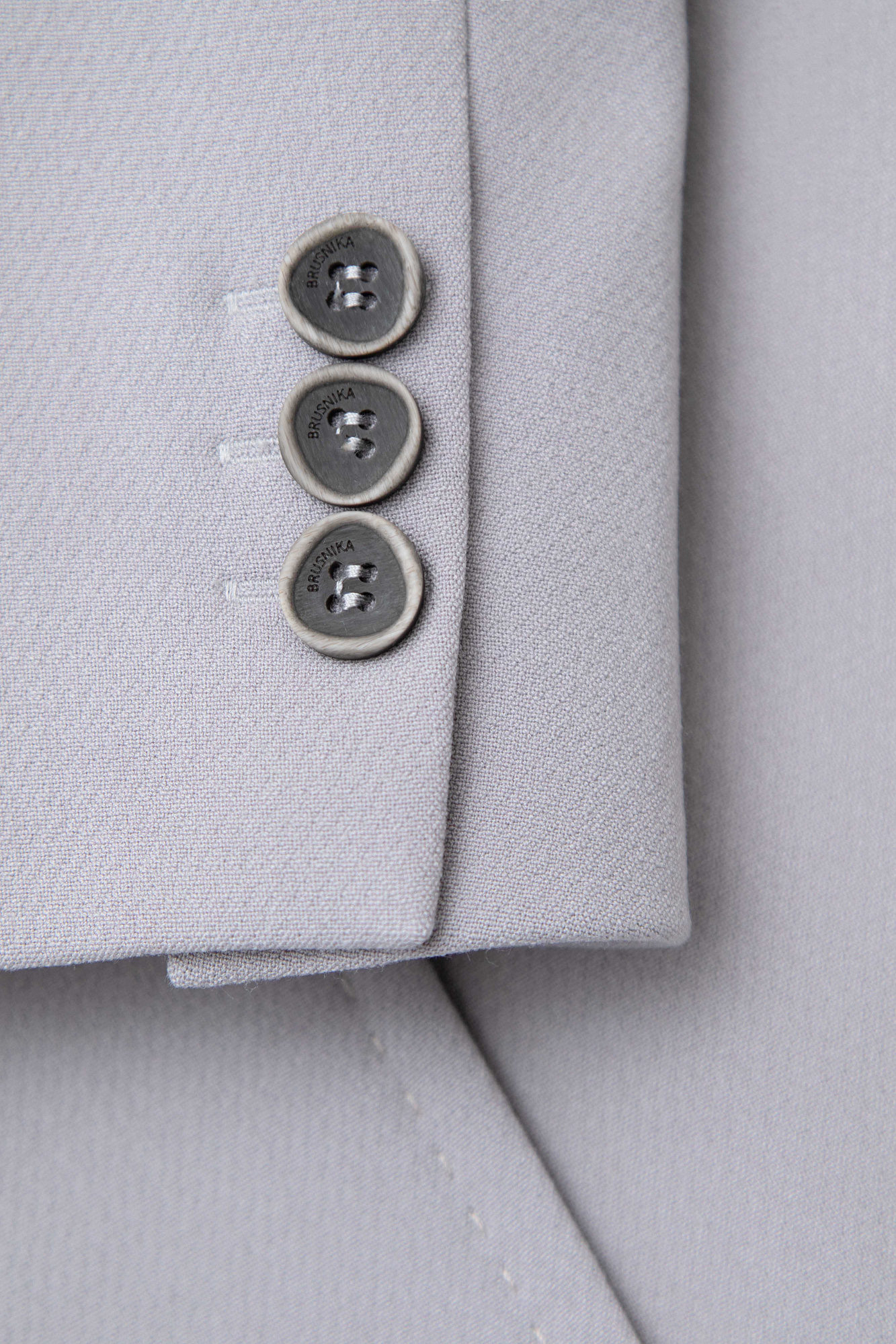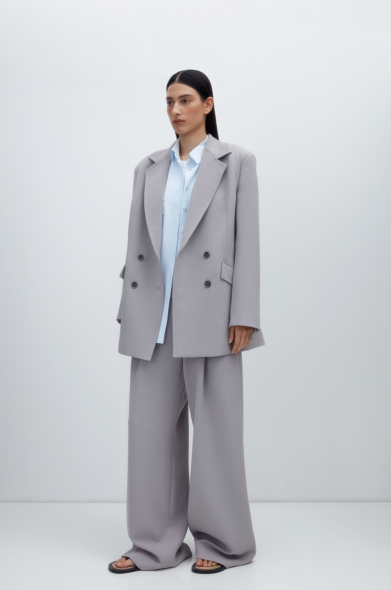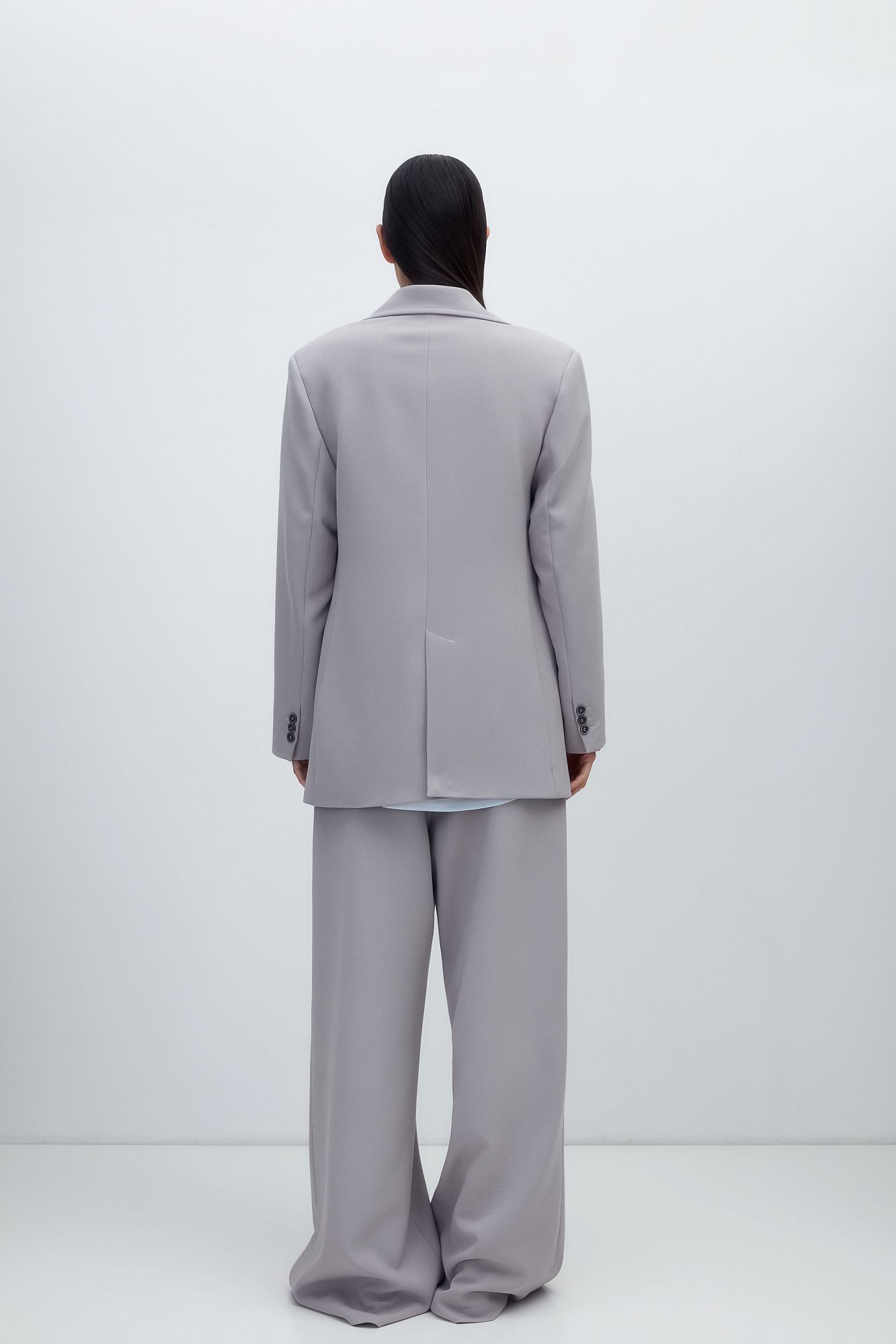 Приталенный двубортный жакет из вискозы с отстрочой и боковыми карманами. Дополнить образ можно брюками и жилетом.