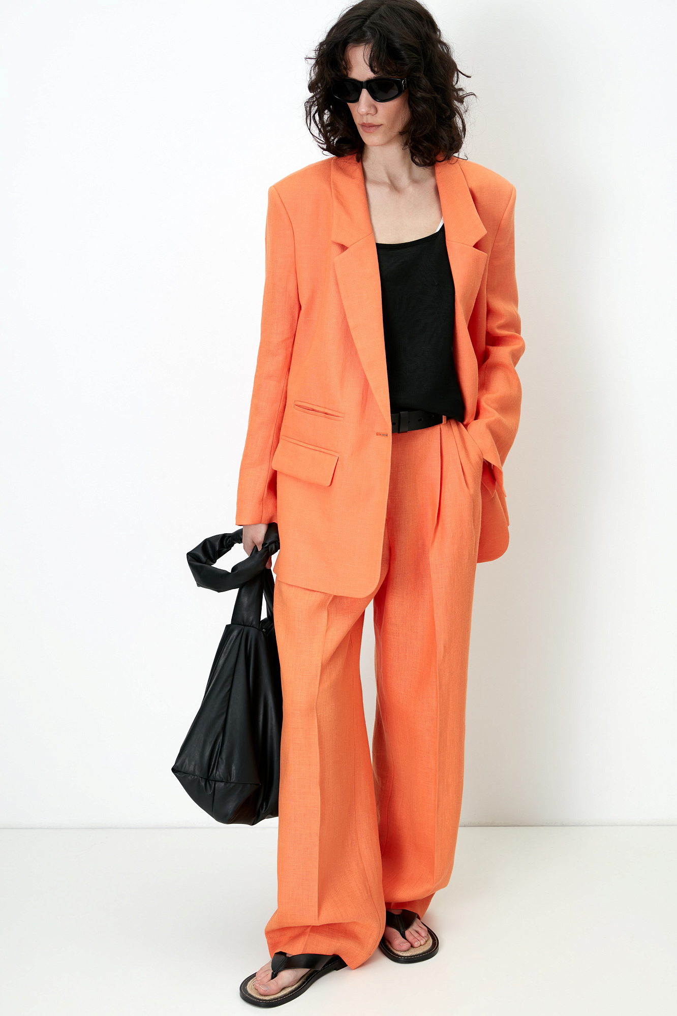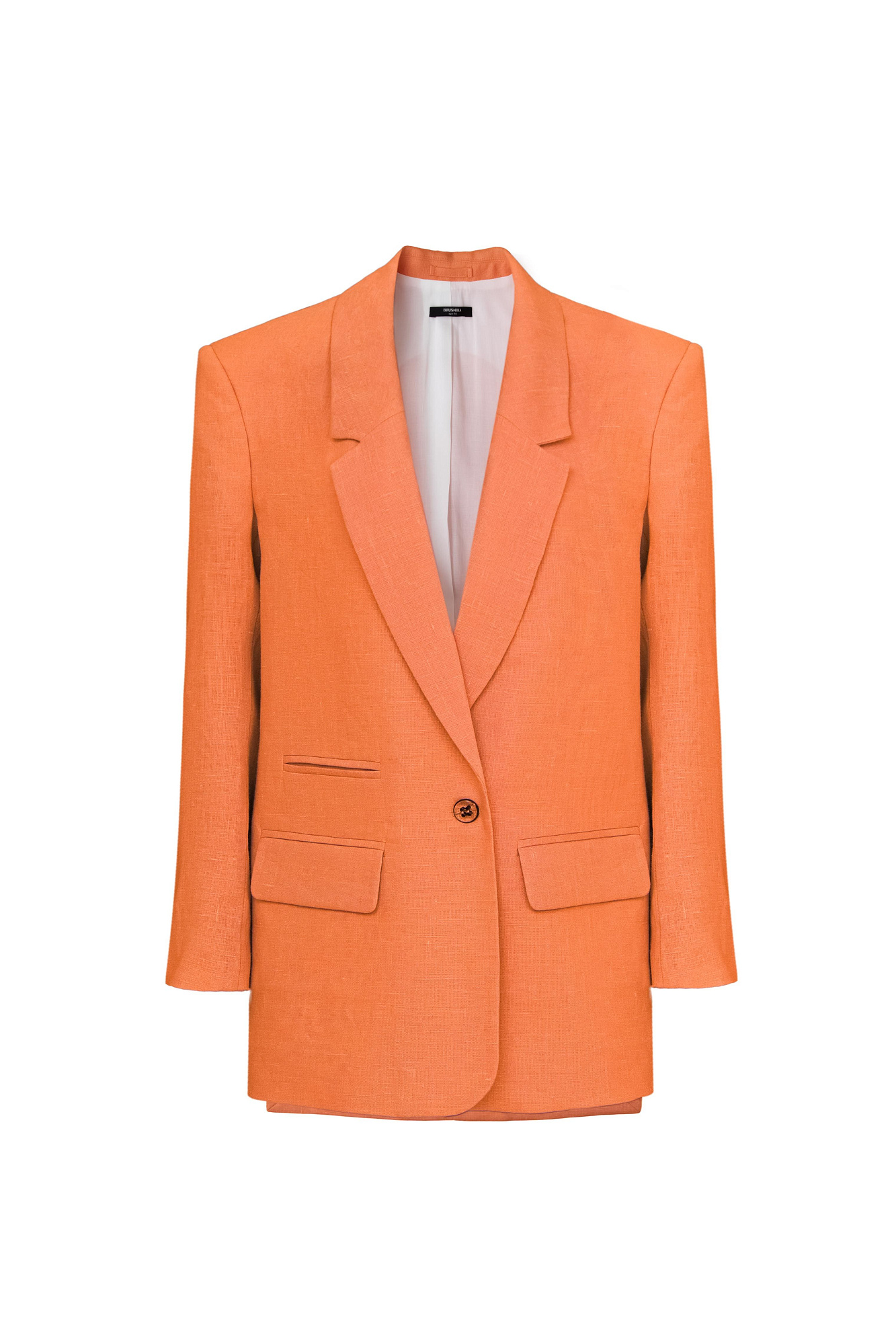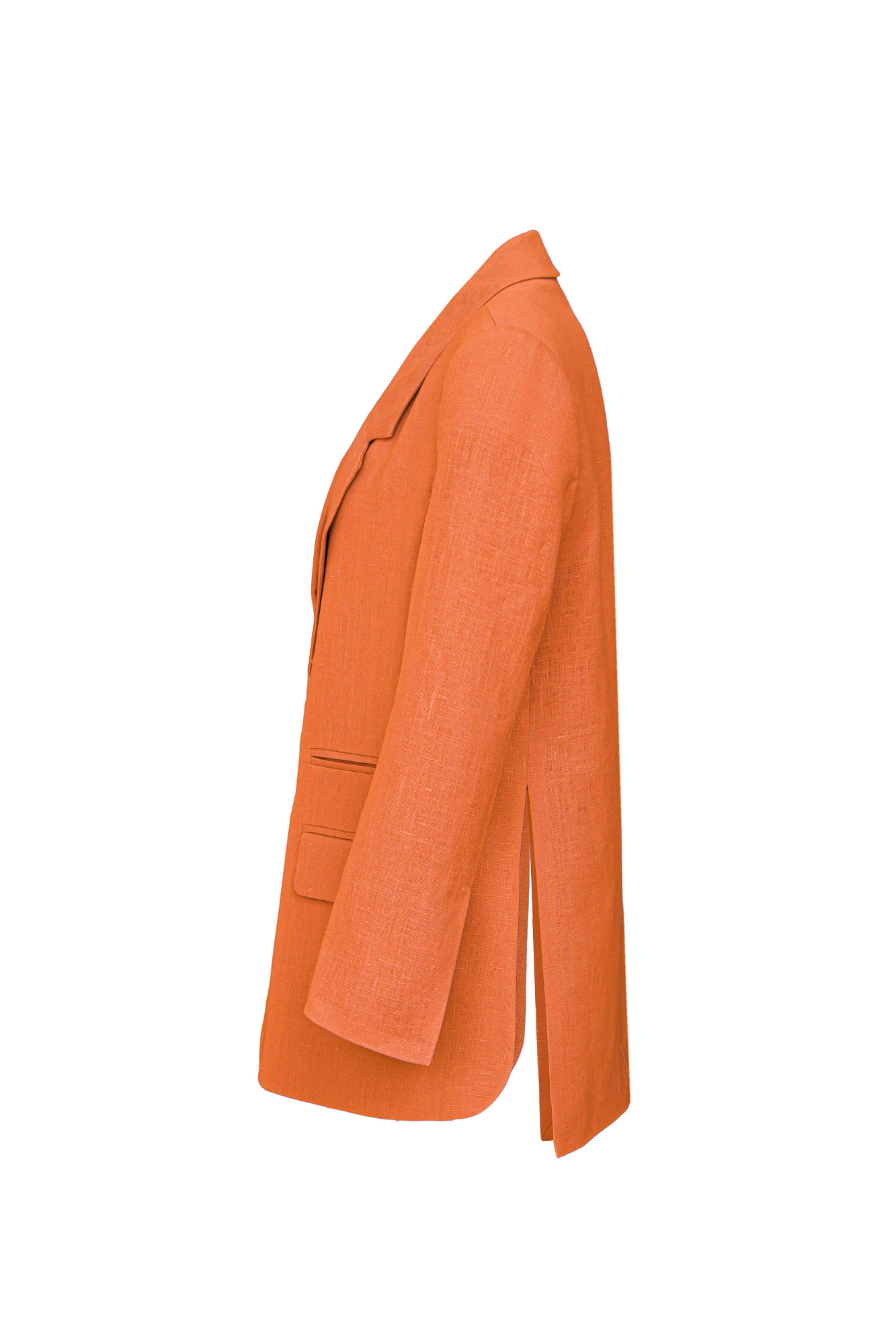 Классический жакет из 100% льна с разрезами по бокам и накладными карманами. Застежка на одну пуговицу. Изделие на подкладке.
