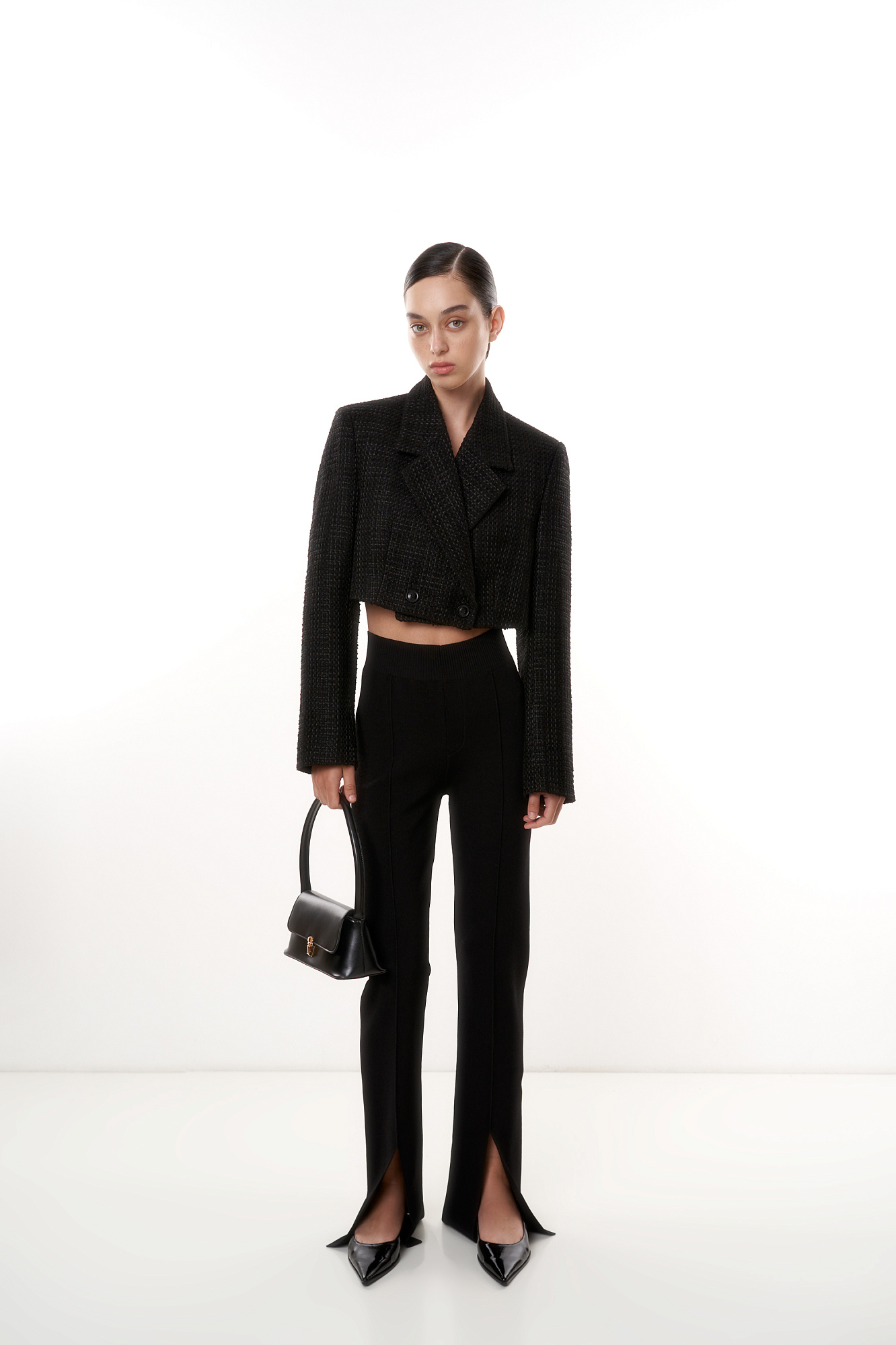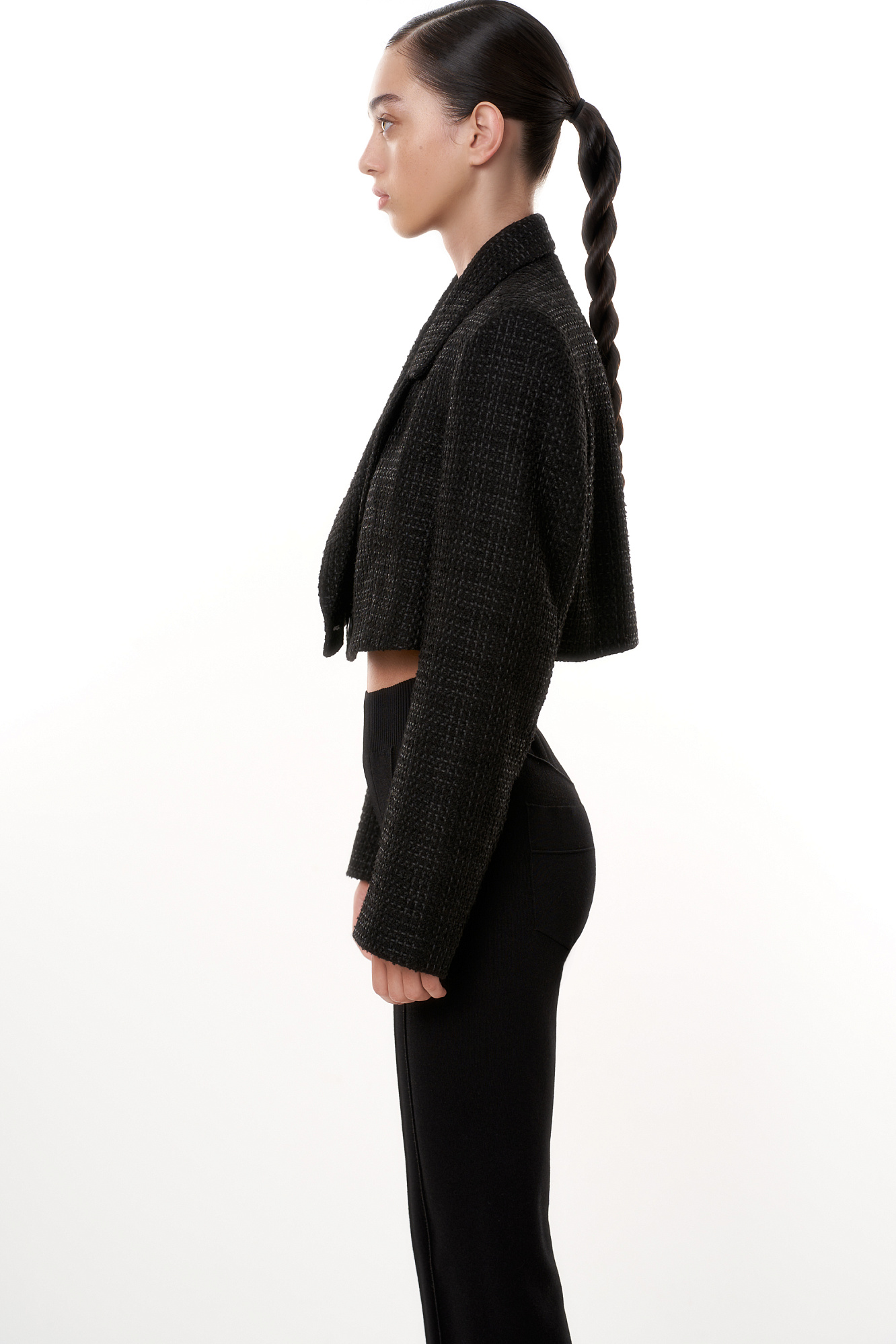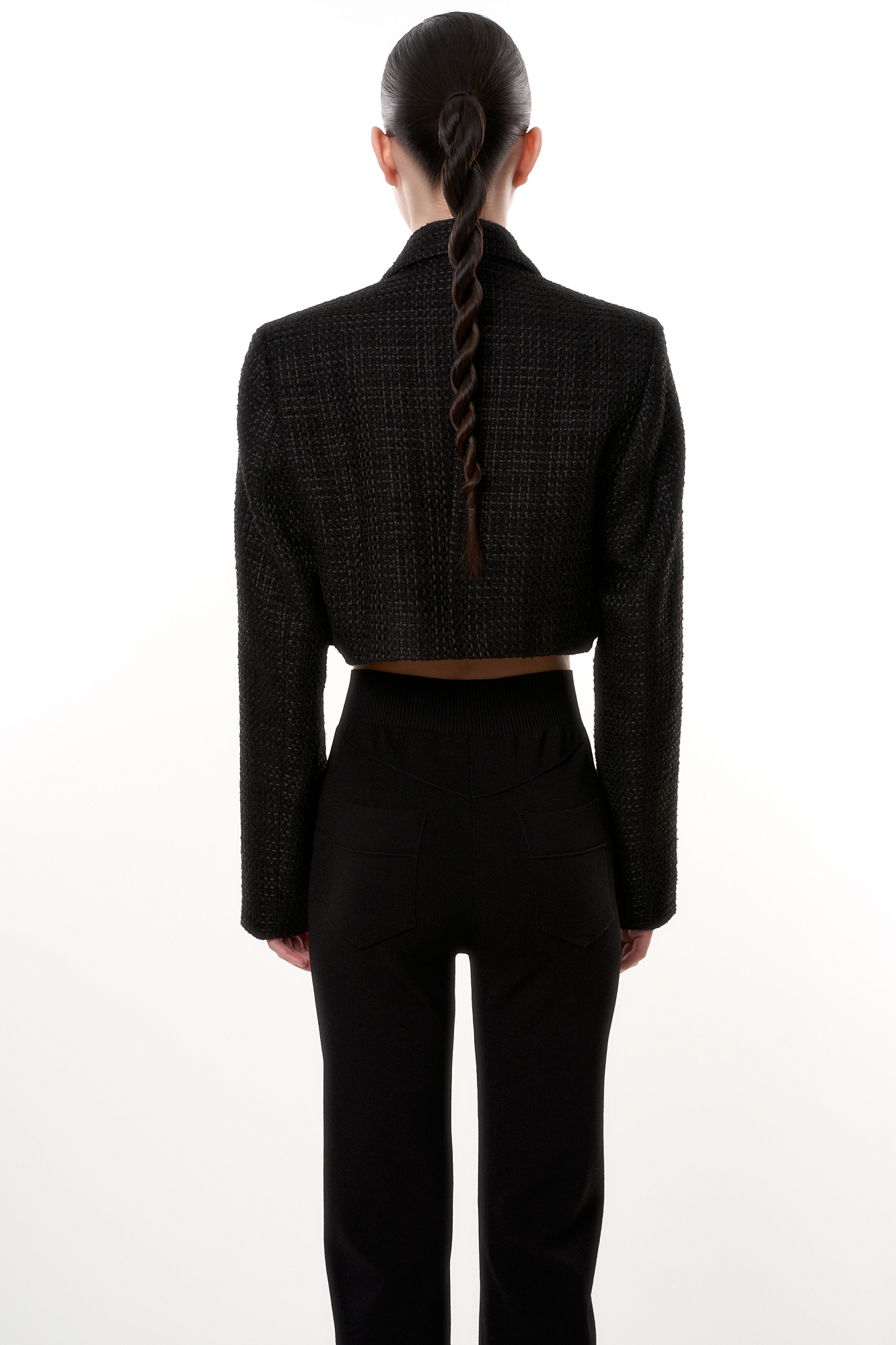 Укороченный жакет. Отложной воротник с прямоугольными лацканами. Модель приталенного силуэта с подкладкой.