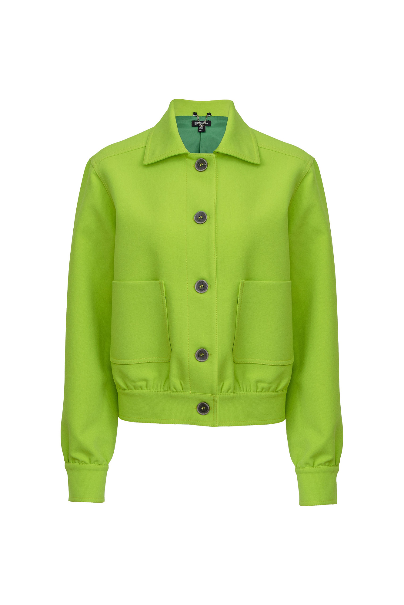 Укороченный жакет из поливискозы с накладными карманами и застежкой на пуговицах.