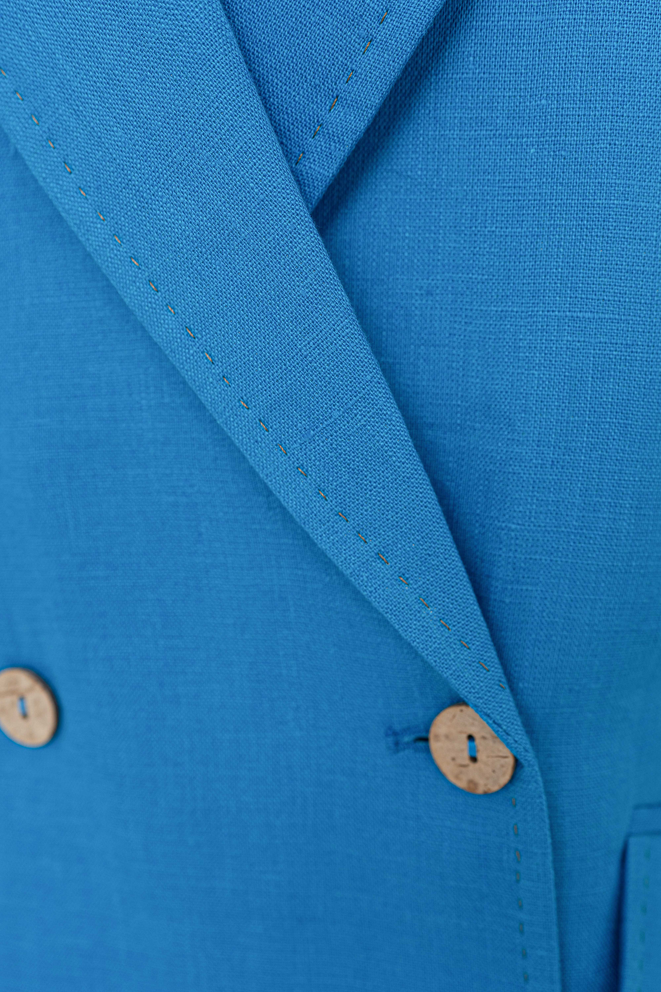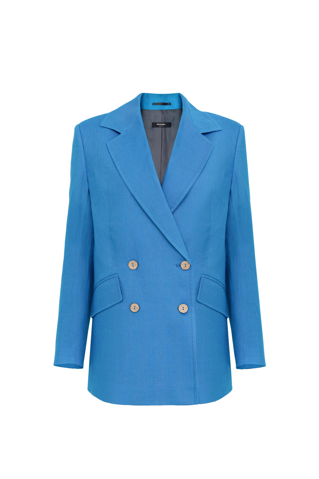Классический двубортный жакет из 100% льна. Модель прямого кроя с английским воротником и прорезными карманами с клапанами. Изделие декорировано отстрочкой контрастного цвета. На подкладке.