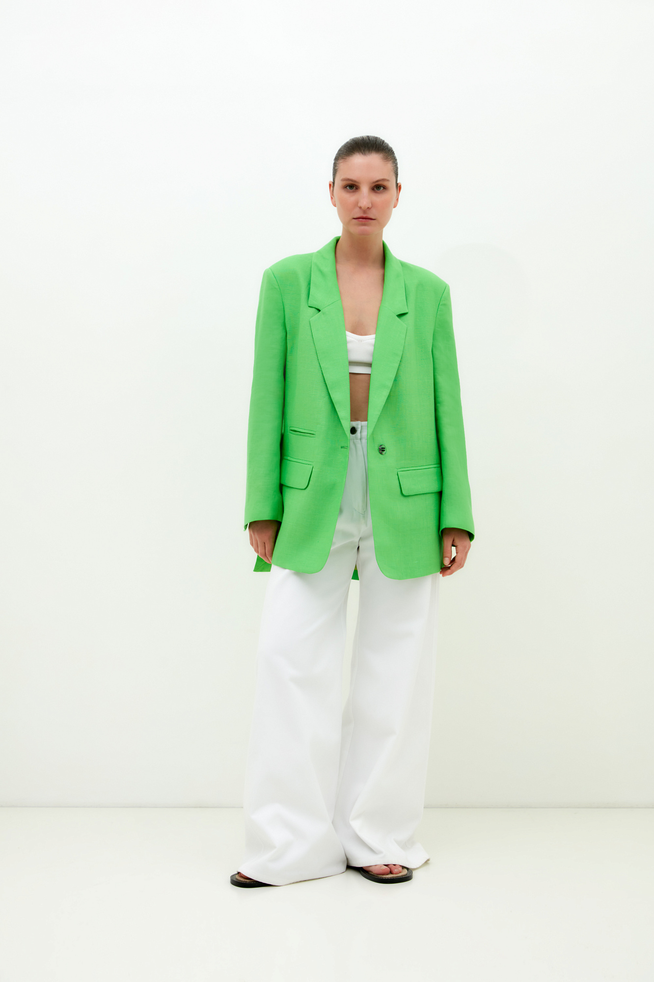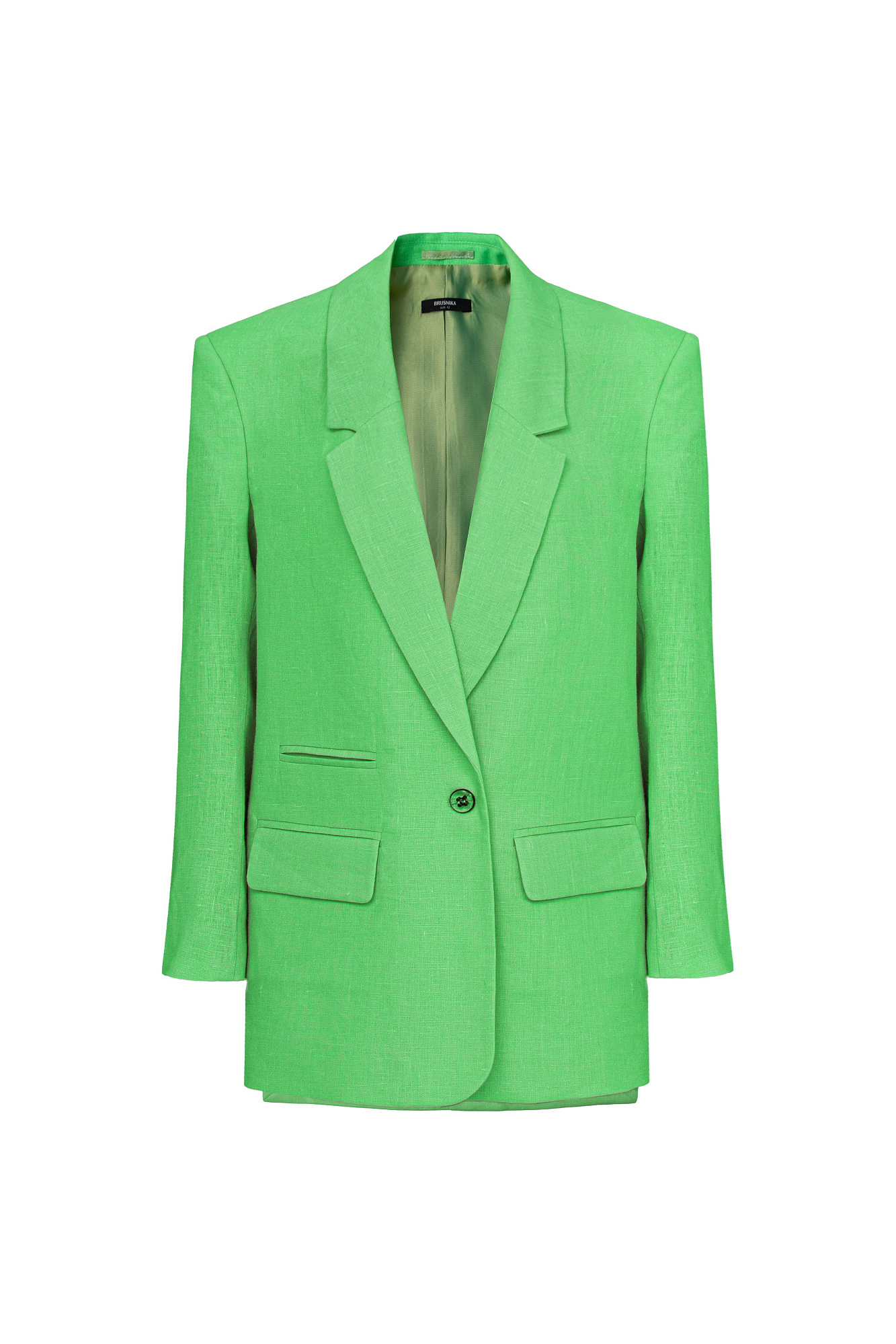Классический жакет из 100% льна с разрезами по бокам и накладными карманами. Застежка на одну пуговицу. Изделие на подкладке.