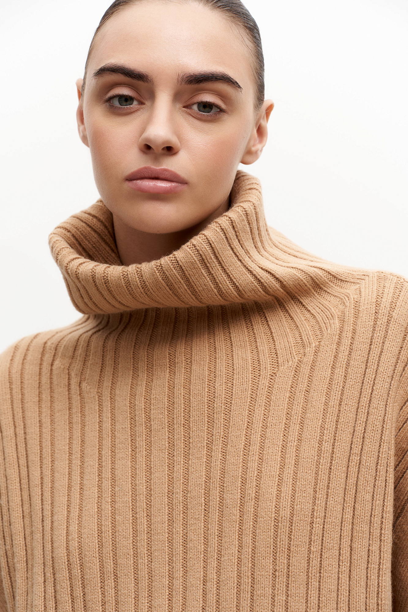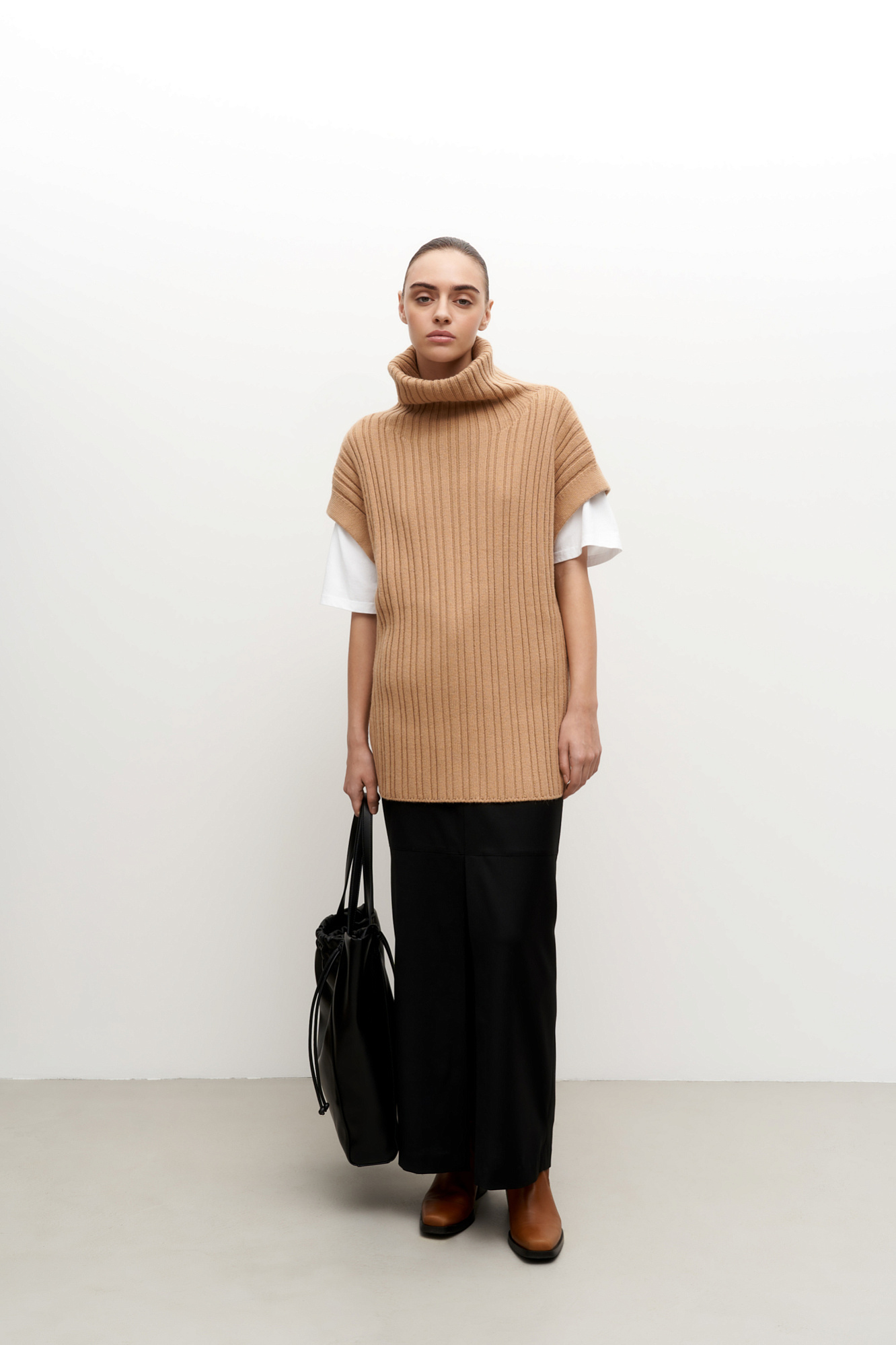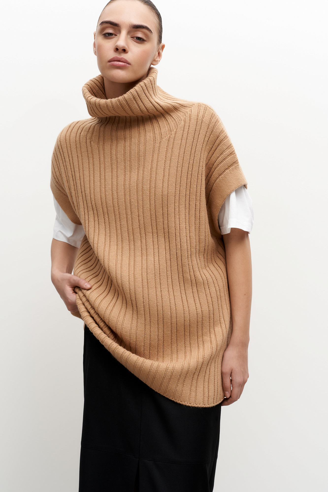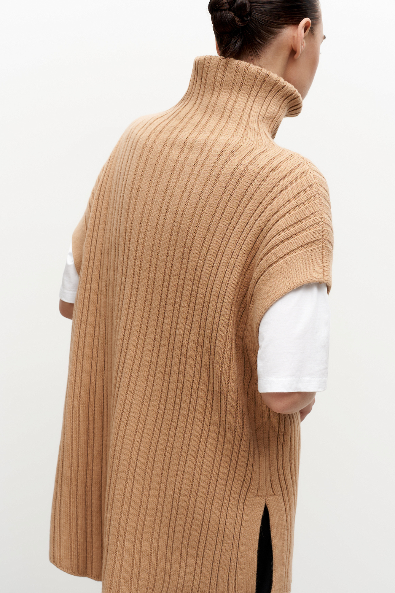 Трикотажный жилет с добавлением шерсти альпака. Модель свободного силуэта с высоким воротом, спущенным плечом и разрезами по бокам.