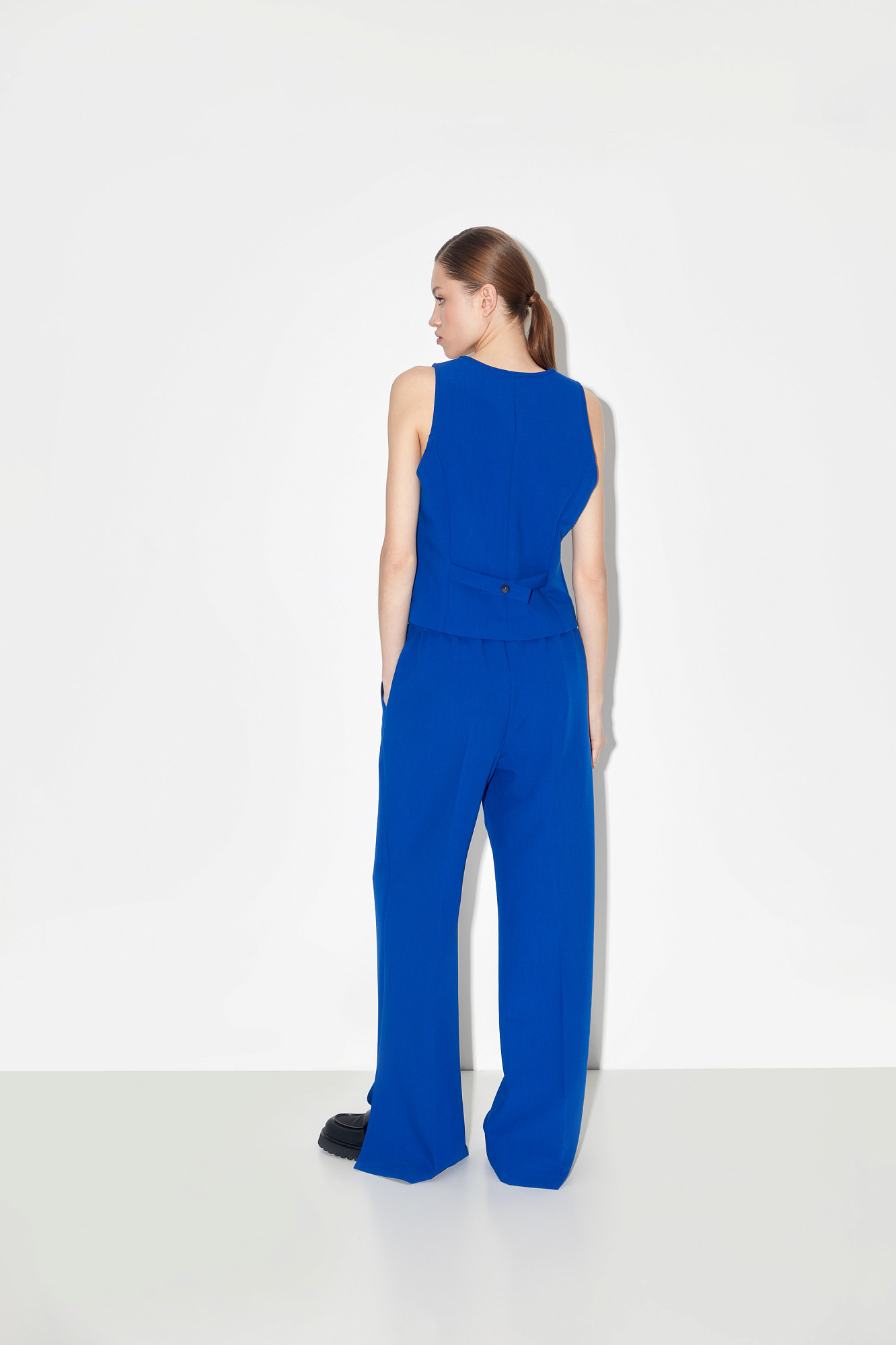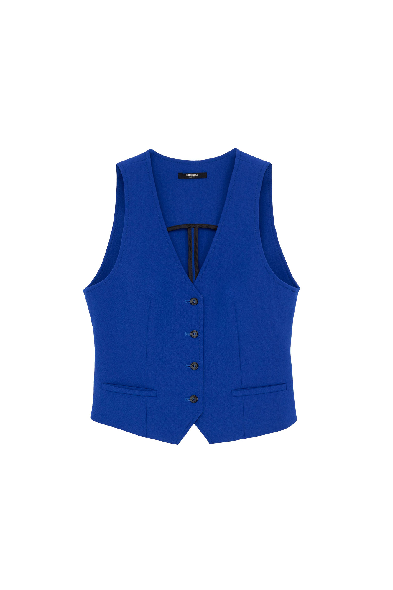 Классический жилет из поливискозы. Модель прямого кроя с V-образным вырезом и имитацией карманов. Застежка на пуговицы. Дополнить образ можно жакетом и брюками в таком же стиле.