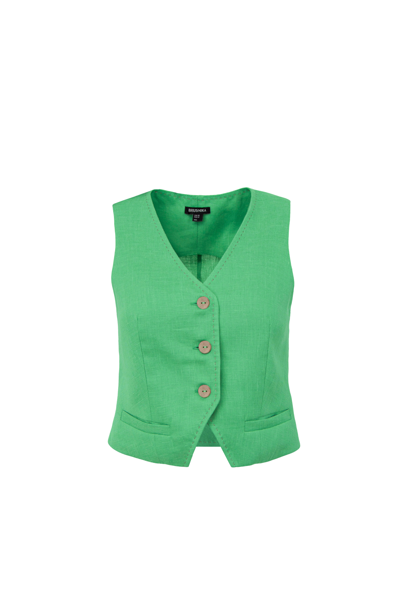 Жилет из 100% льна с карманами. Застежка на пуговицах.
