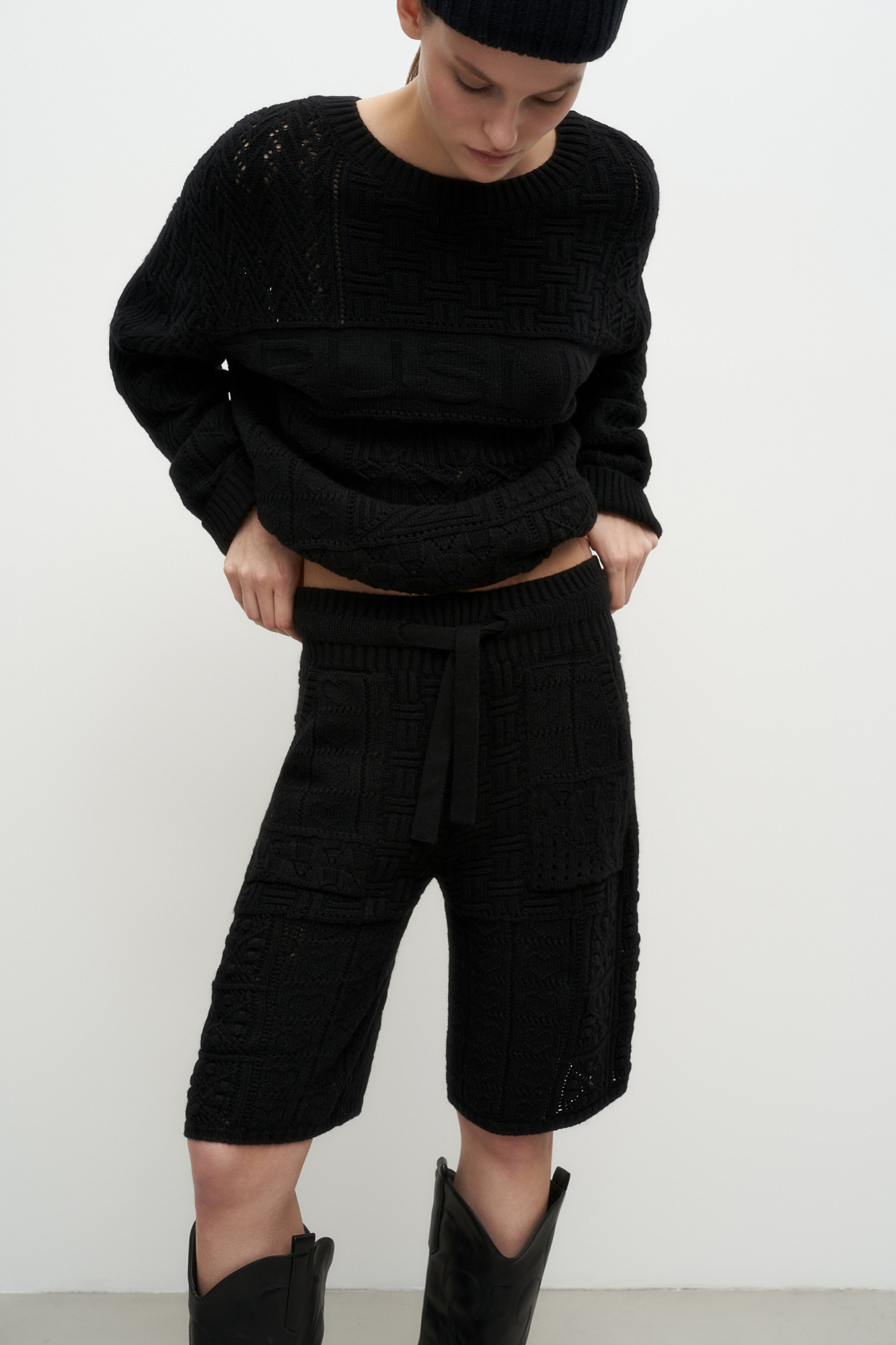 Ажурные шорты из кашемира и шерсти с кулиской и накладными карманами