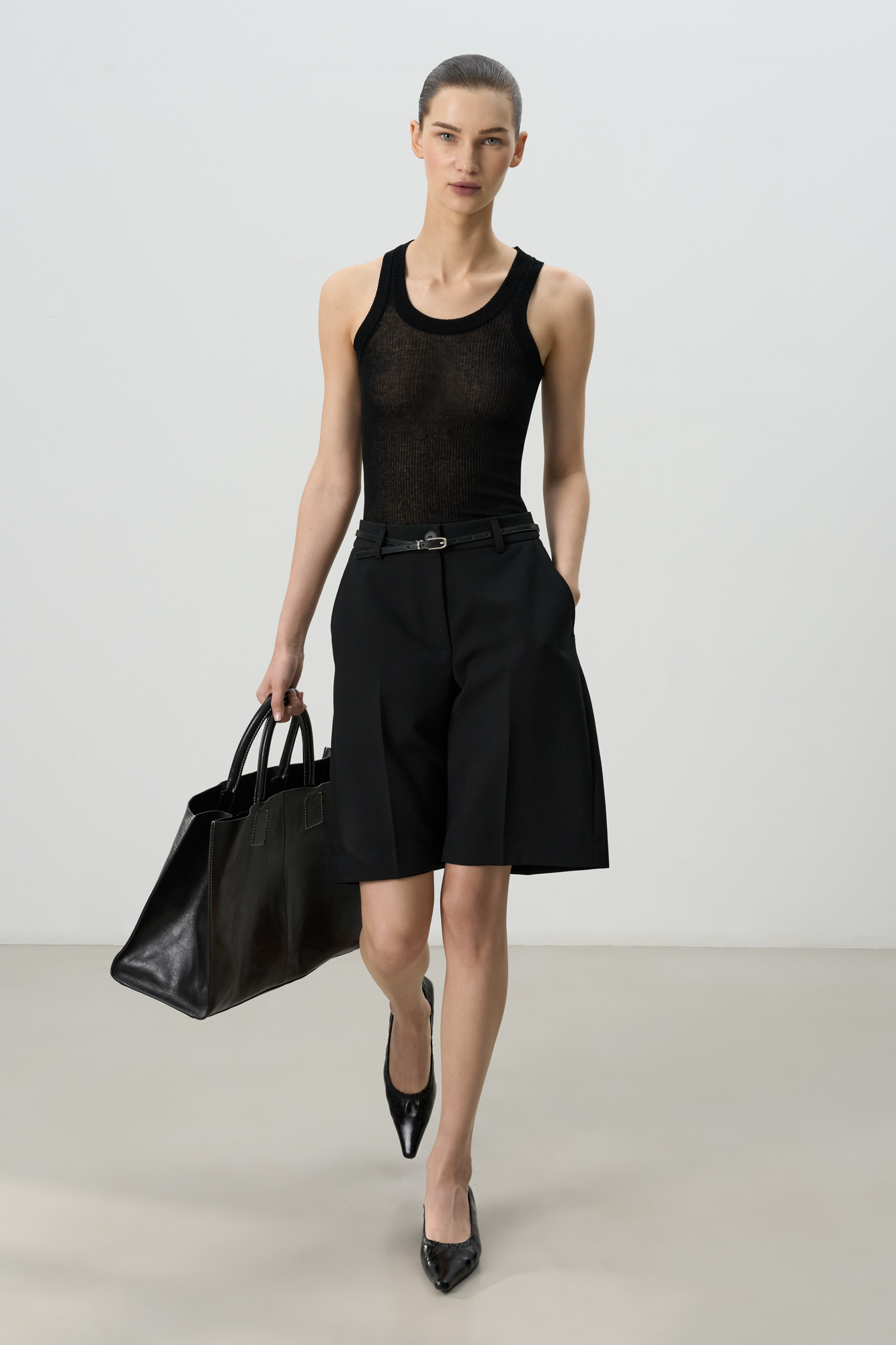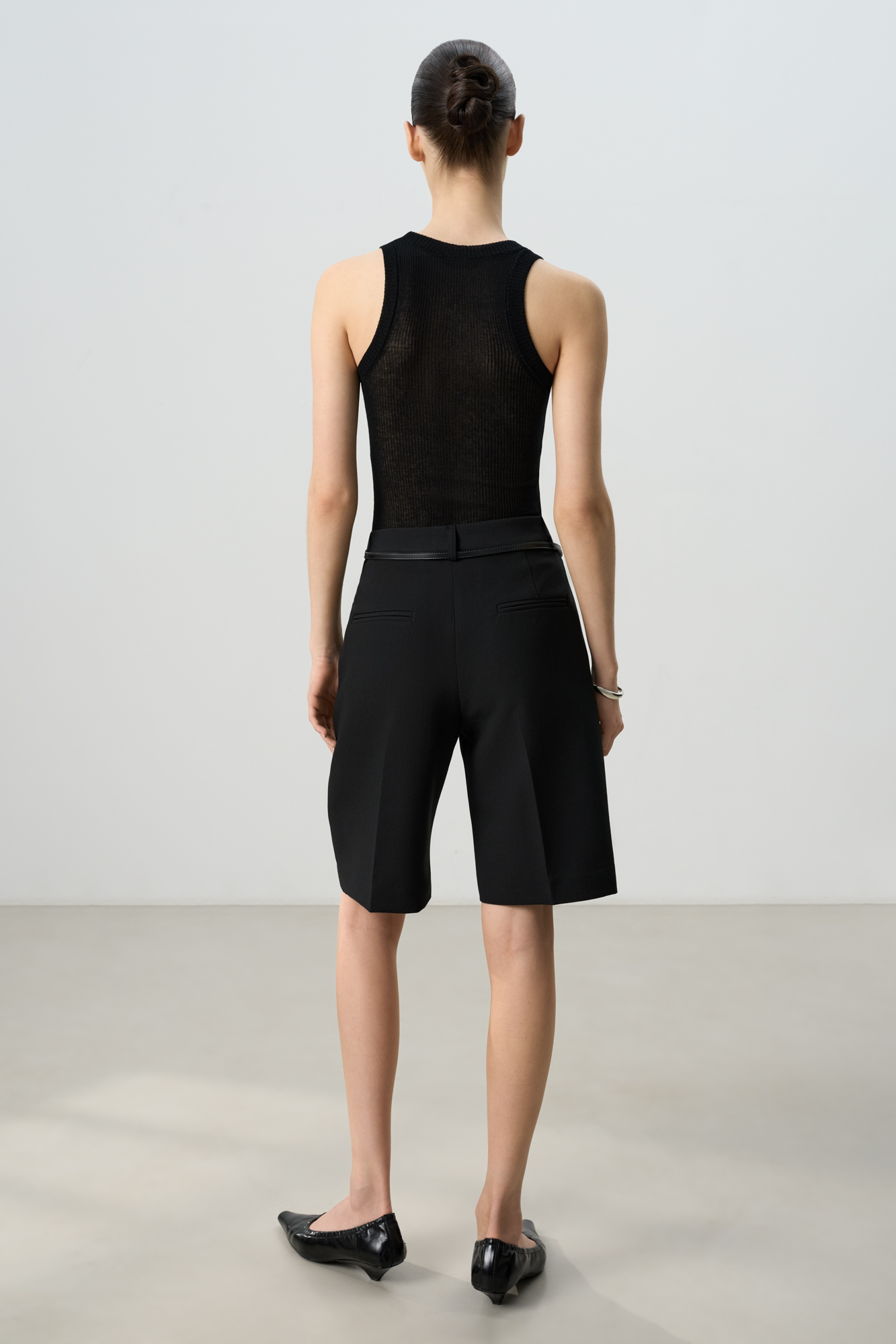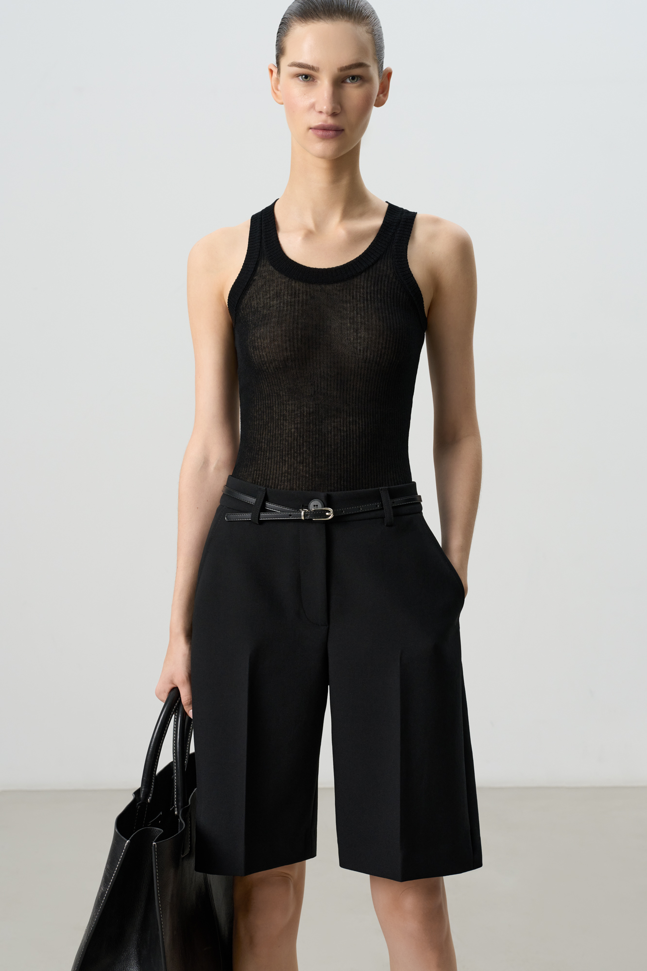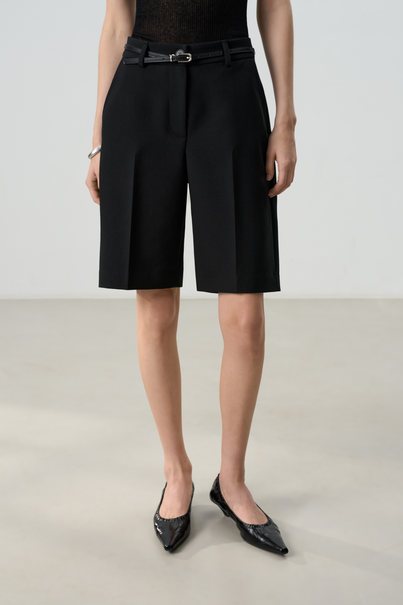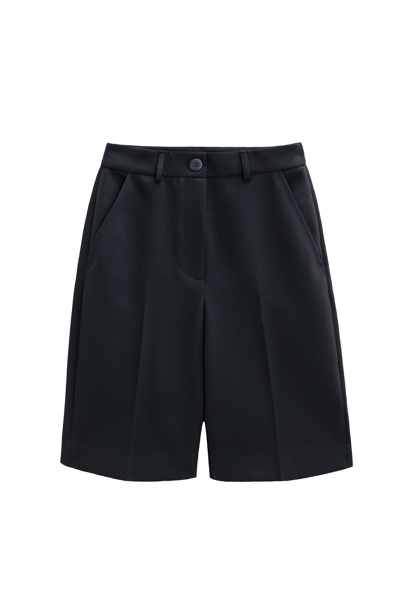 Шорты из поливискозы со стрелками. Модель прямого кроя, с боковыми и задними карманами, шлевками на поясе для ремня, застежкой на молнию и пуговицу.