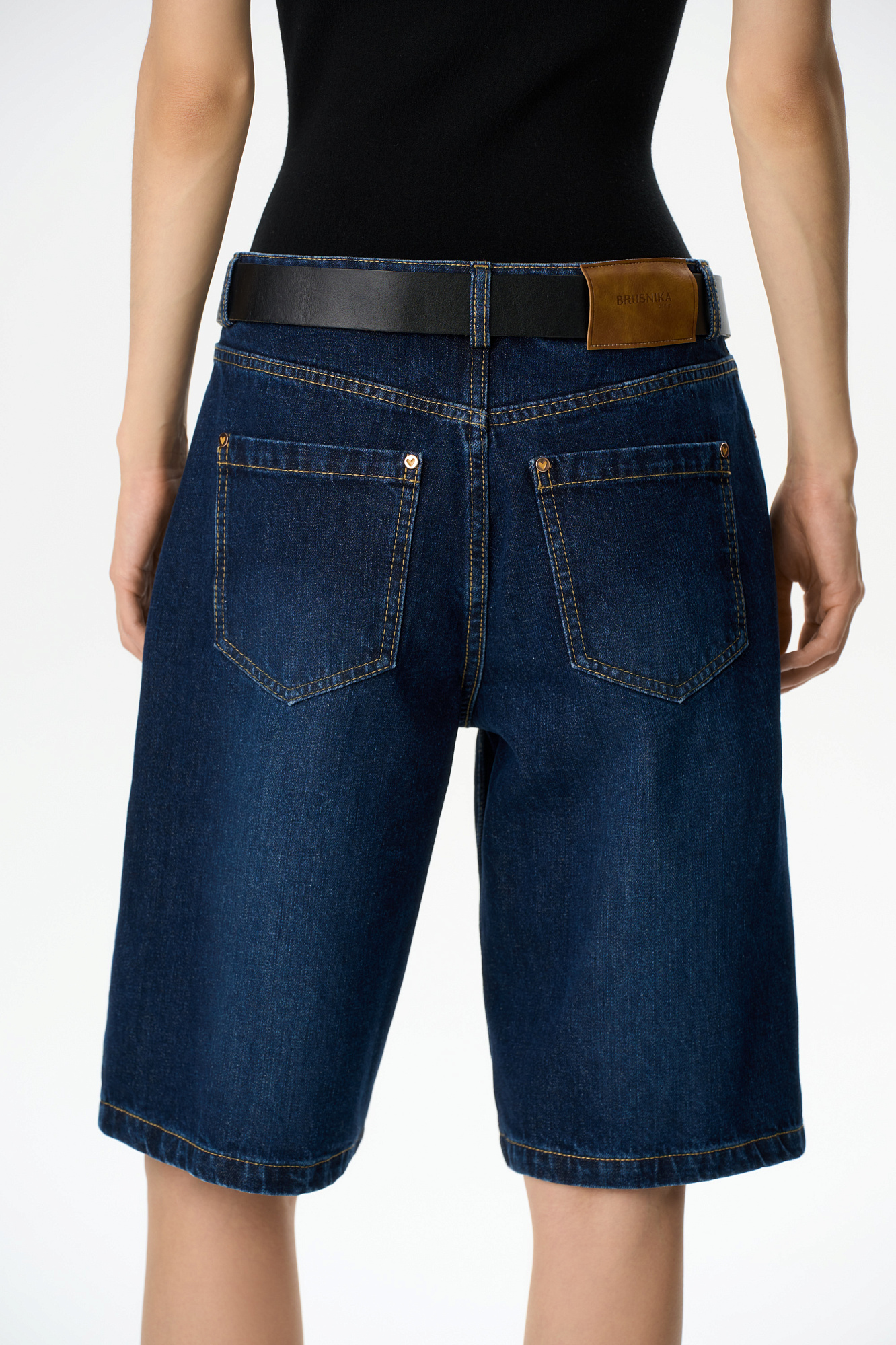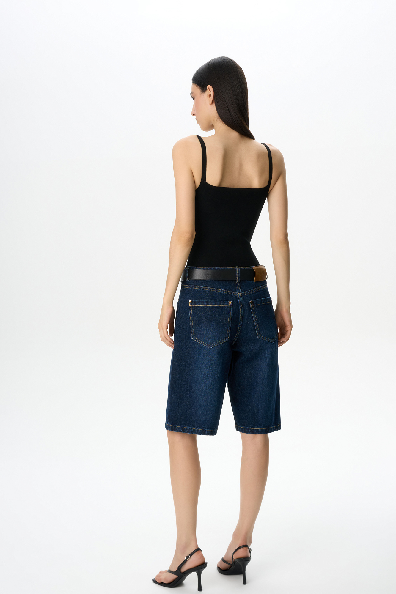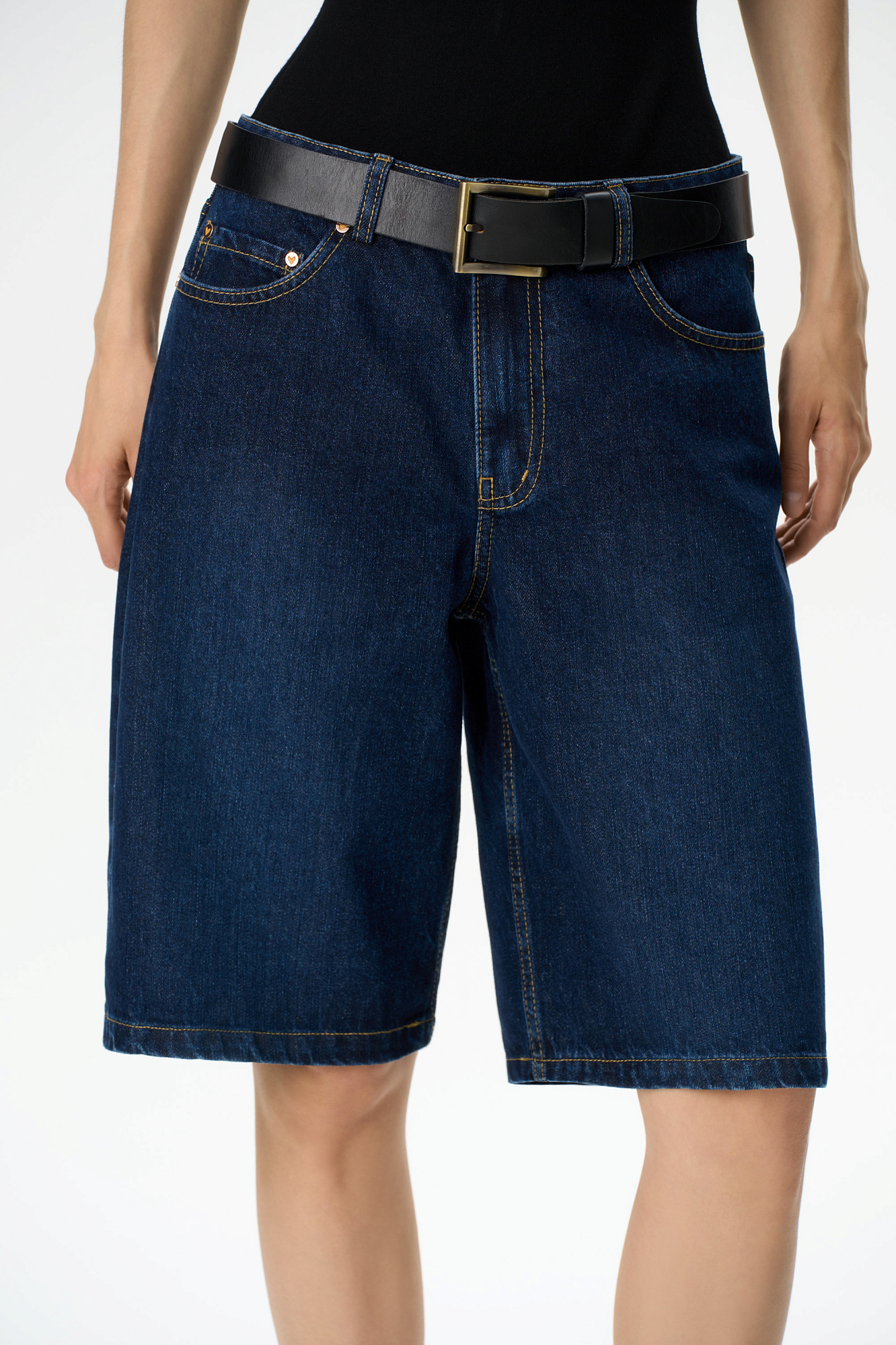 Джинсовые шорты-бермуды из 100% хлопка. Модель прямого кроя, со средней посадкой. Шлевки на поясе для ремня. Пять карманов. Застежка на молнию и металлическую пуговицу.