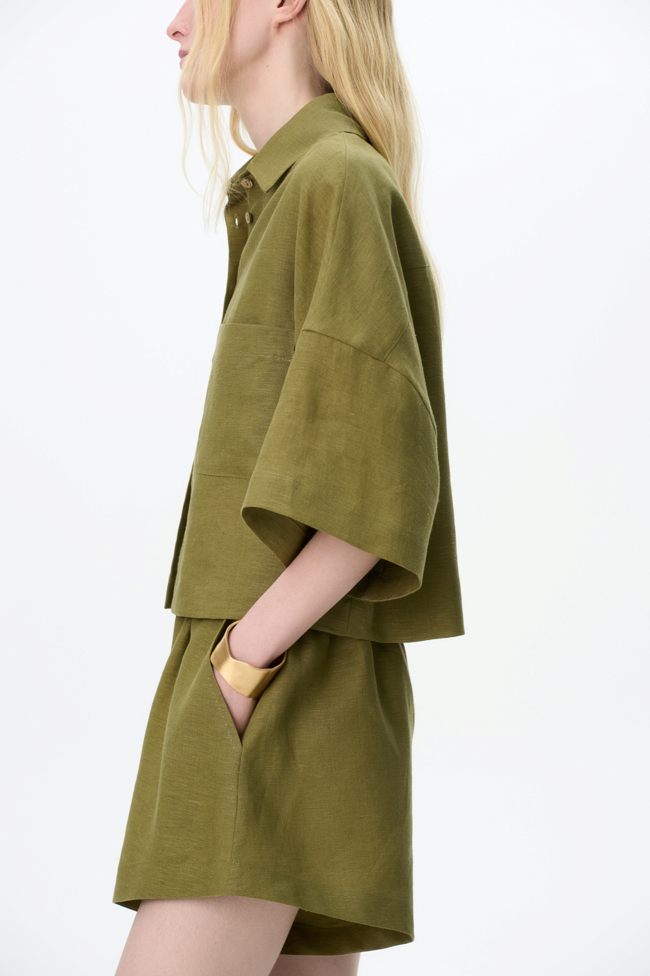 Комплект из 100% льна. Укороченная рубашка с отложным воротником, накладными карманами и спущенной линией плеч. Короткие шорты прямого кроя с боковыми карманами и эластичным поясом на резинке.
