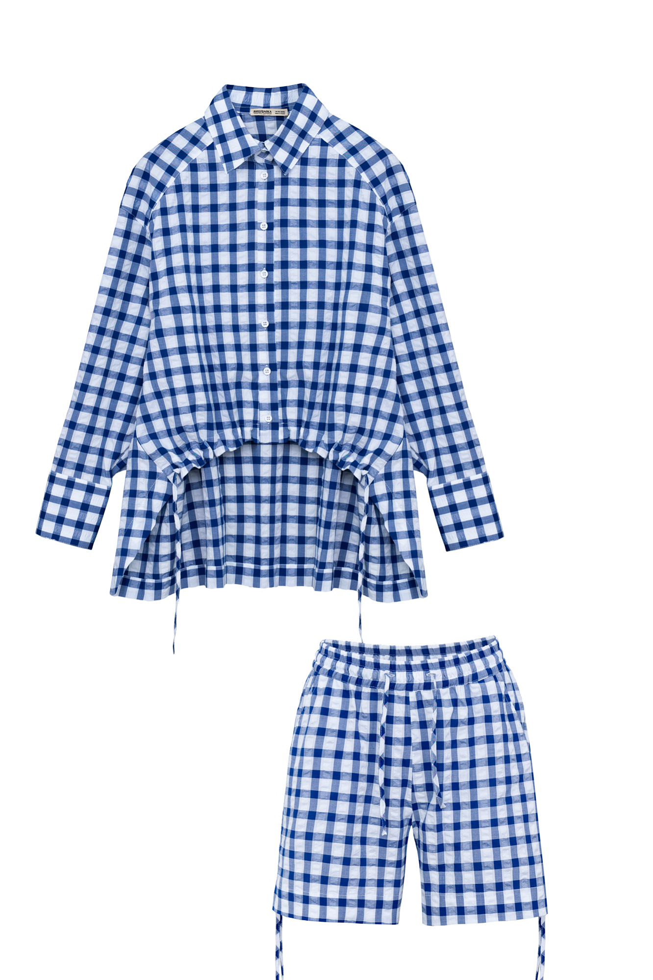 Принтованный костюм из 100% хлопка, состоящий из рубашки и шорт. Рубашка свободного кроя, с длинными рукавами, классическим отложным воротником и кулиской по низу изделия. Короткие шорты с карманами, широким поясом на кулиске и завязками по бокам.