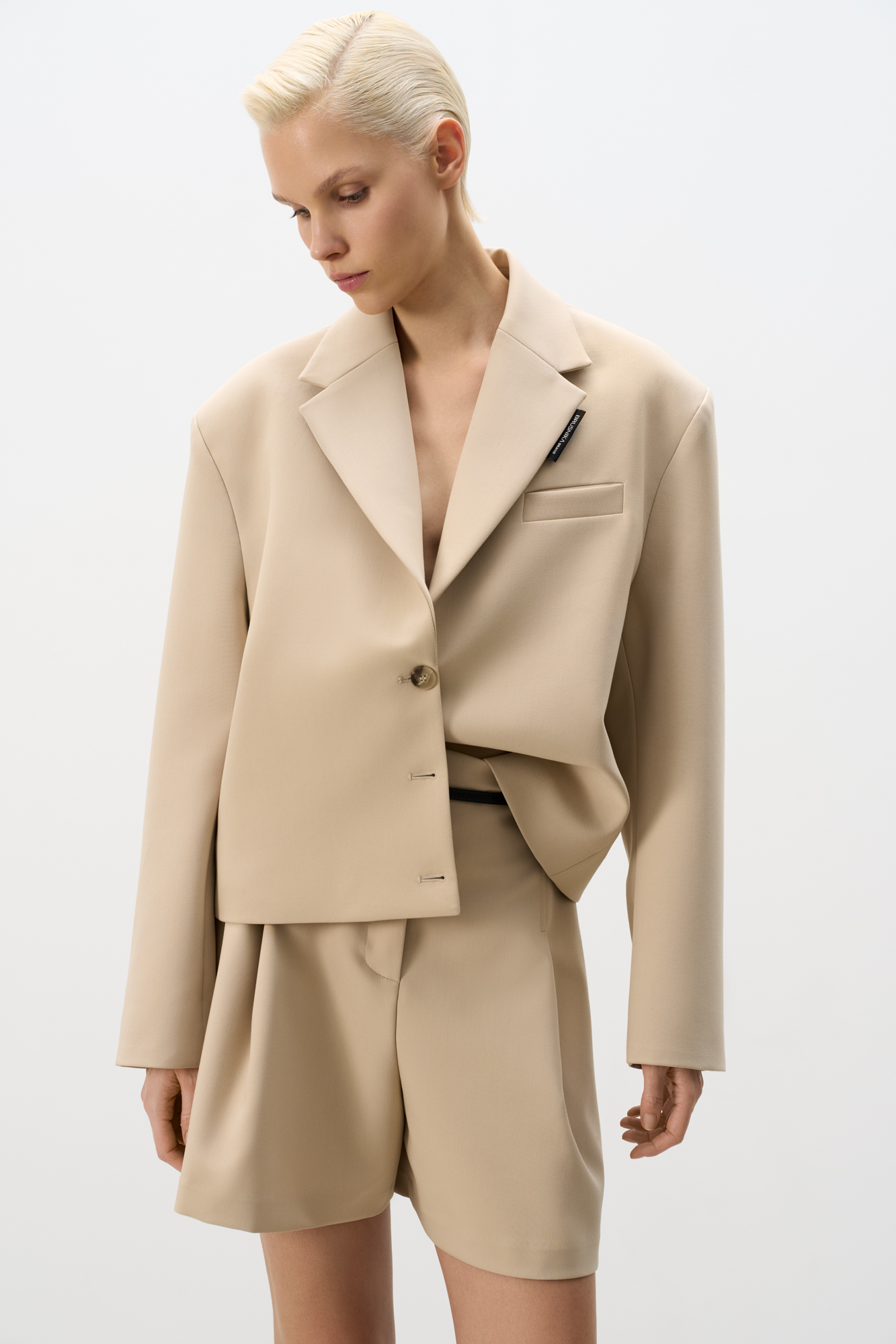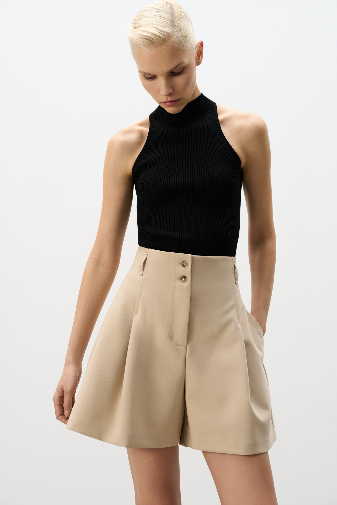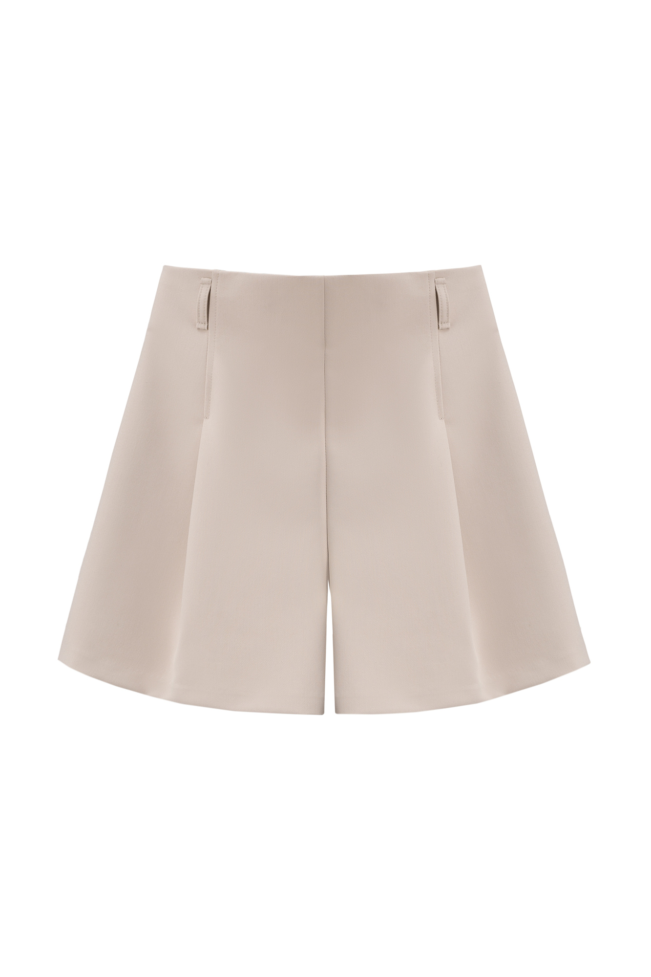 Шорты из поливискозы с высокой посадкой. Модель прямого кроя с защипами и боковыми карманами. Паты на поясе для ремня. Застежка на молнию и две пуговицы.