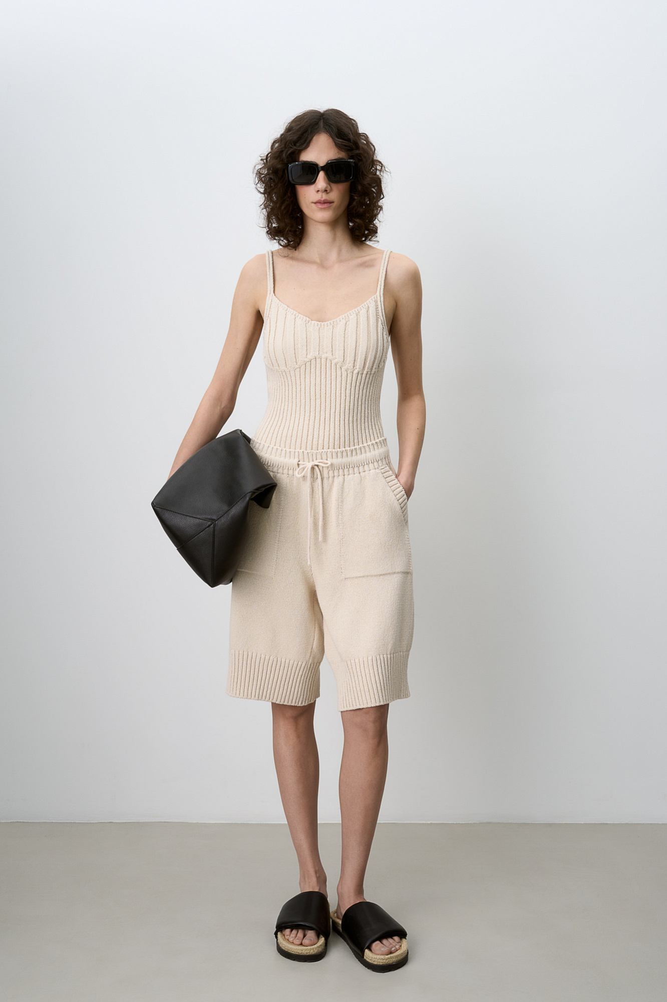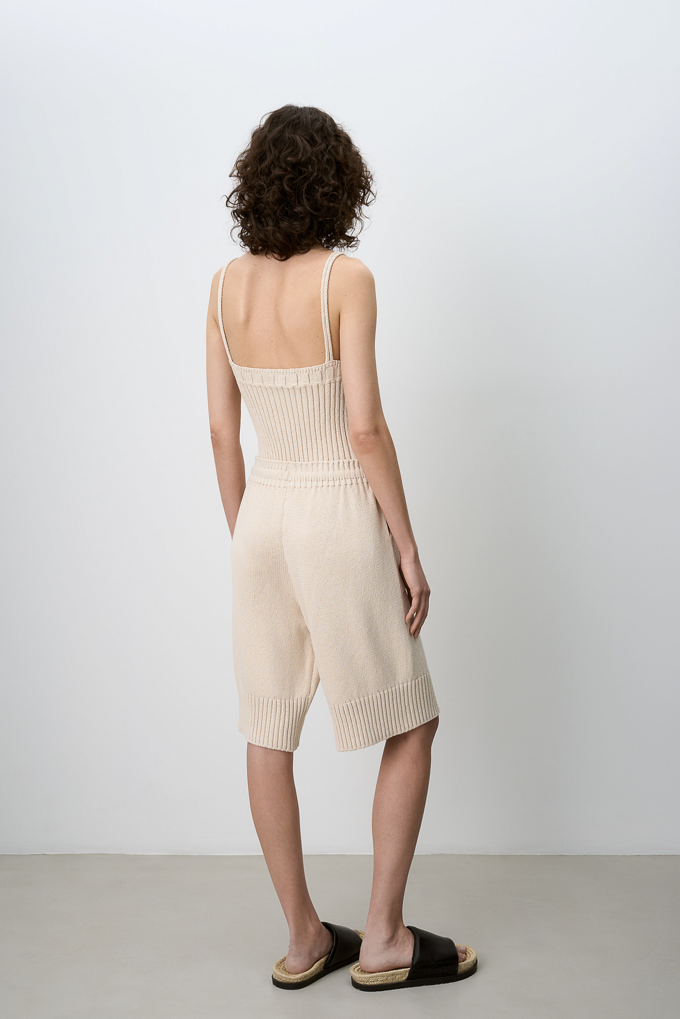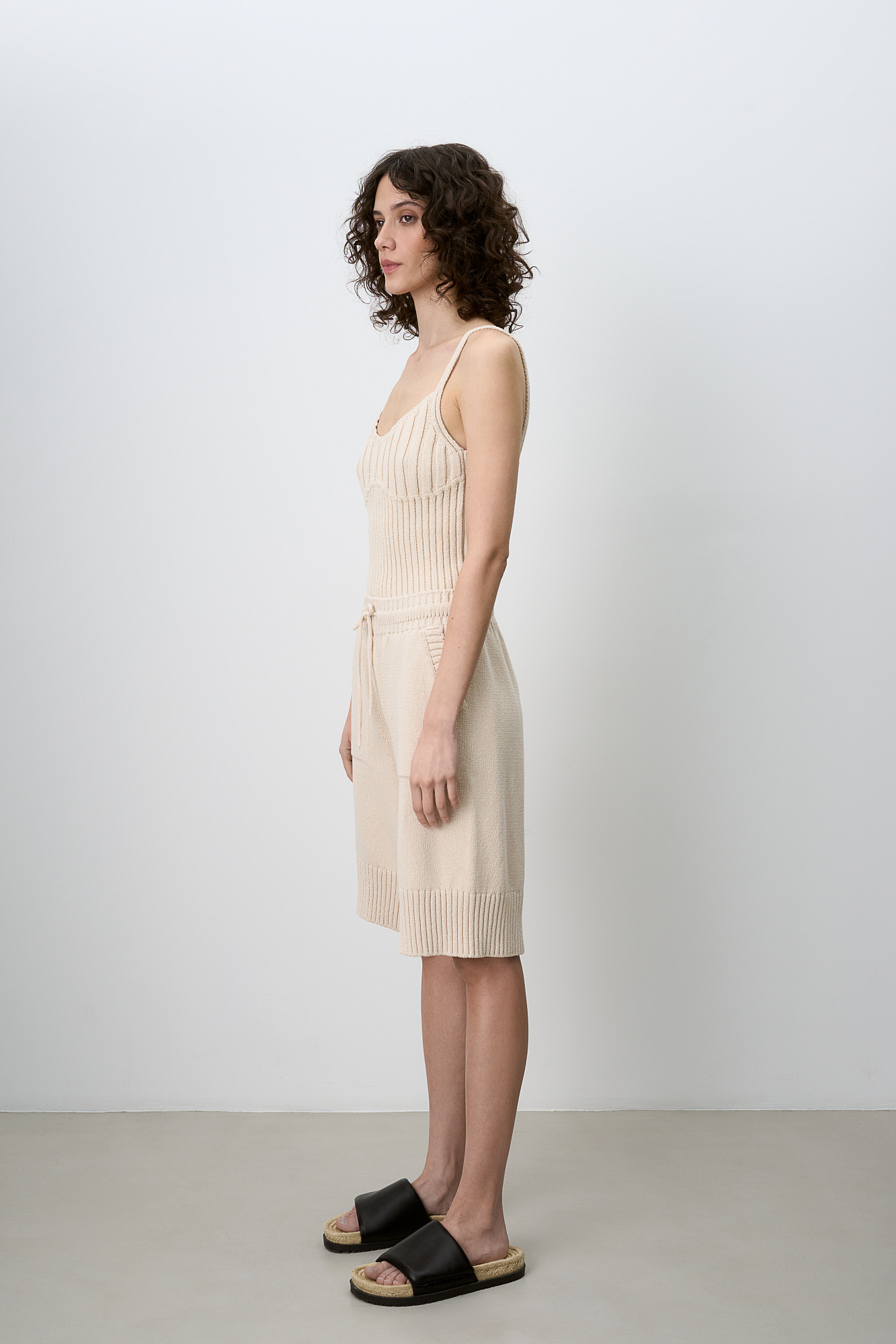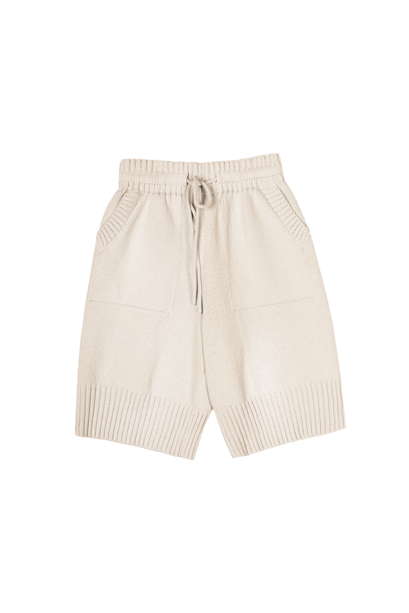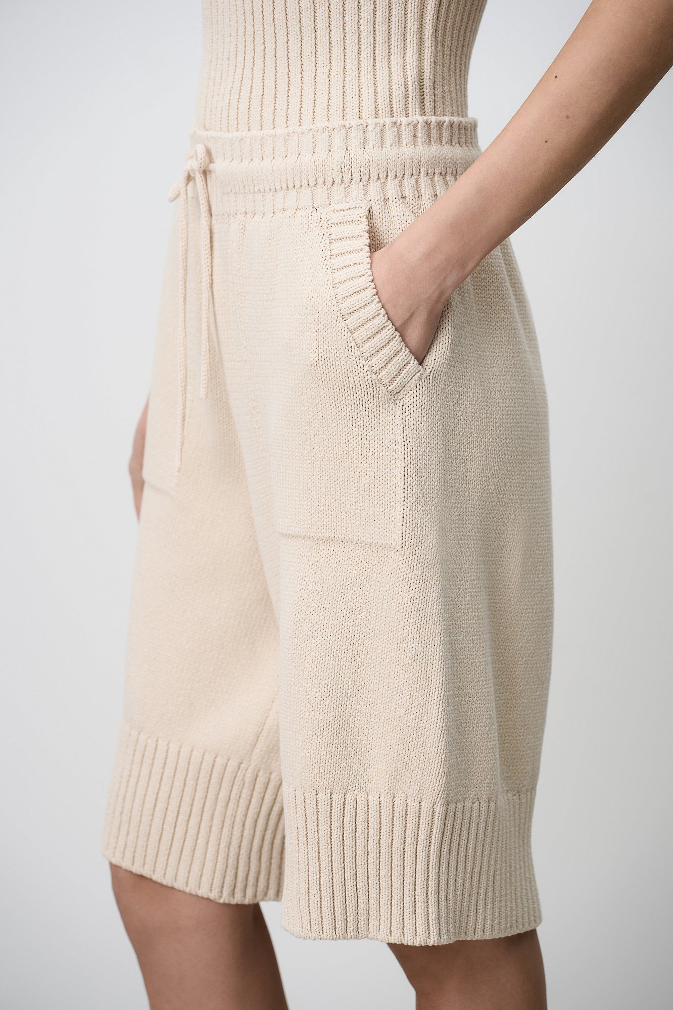 Трикотажные шорты из 100% хлопка. Модель прямого кроя длины до колен, со средней посадкой, боковыми карманамии регулируевым поясом на кулиске. Края изделия выполнены в рубчик.