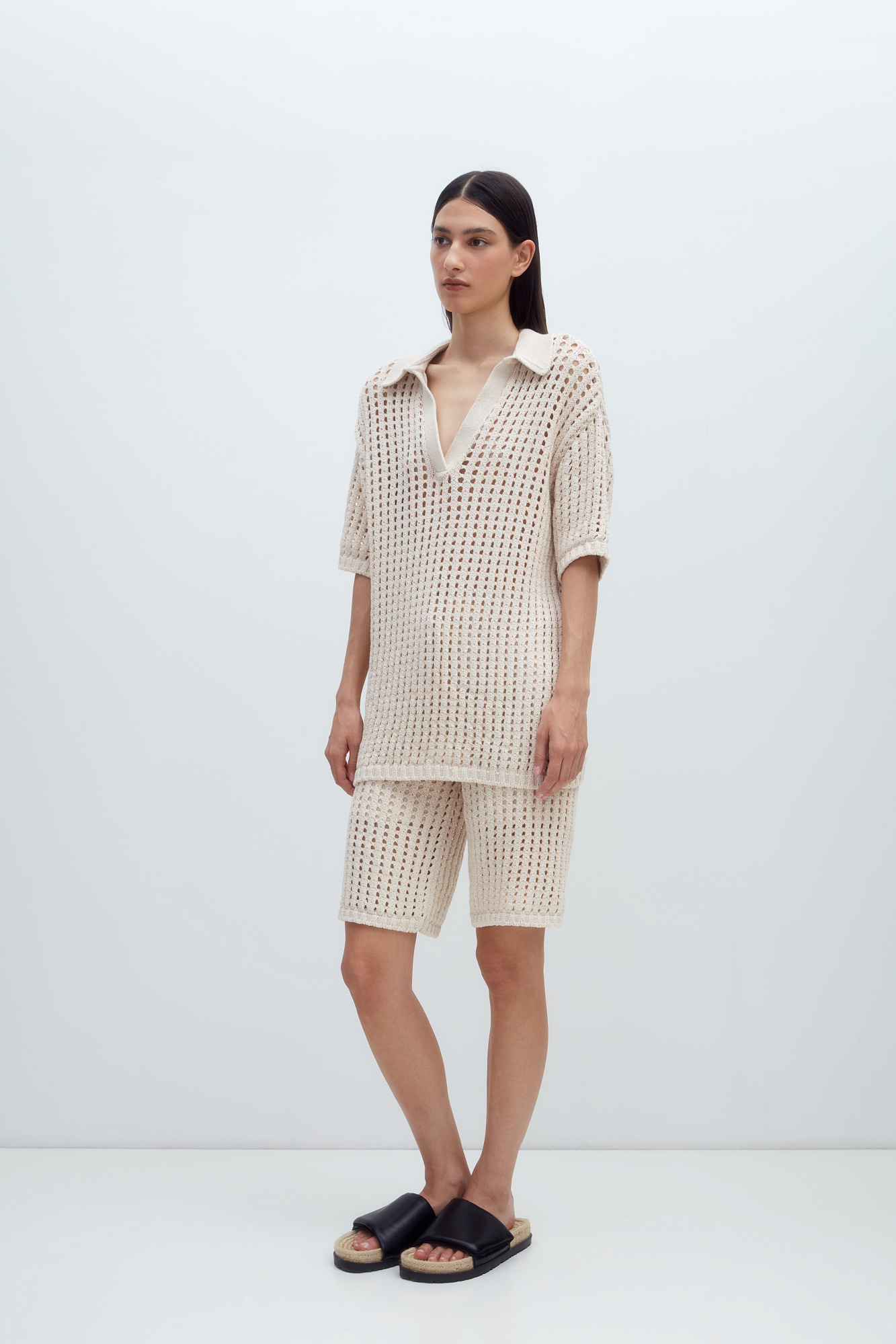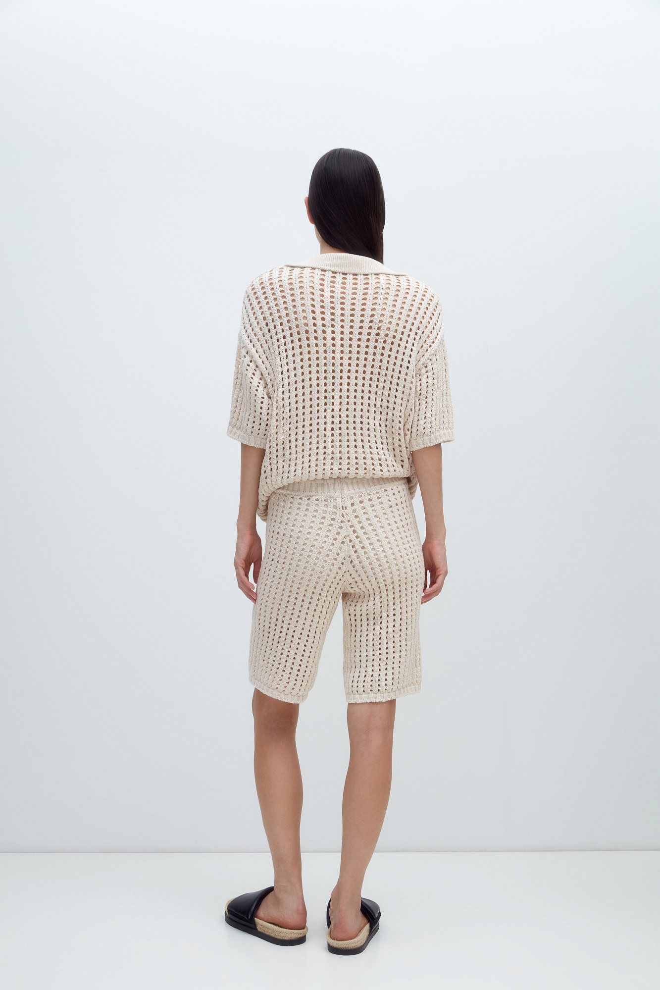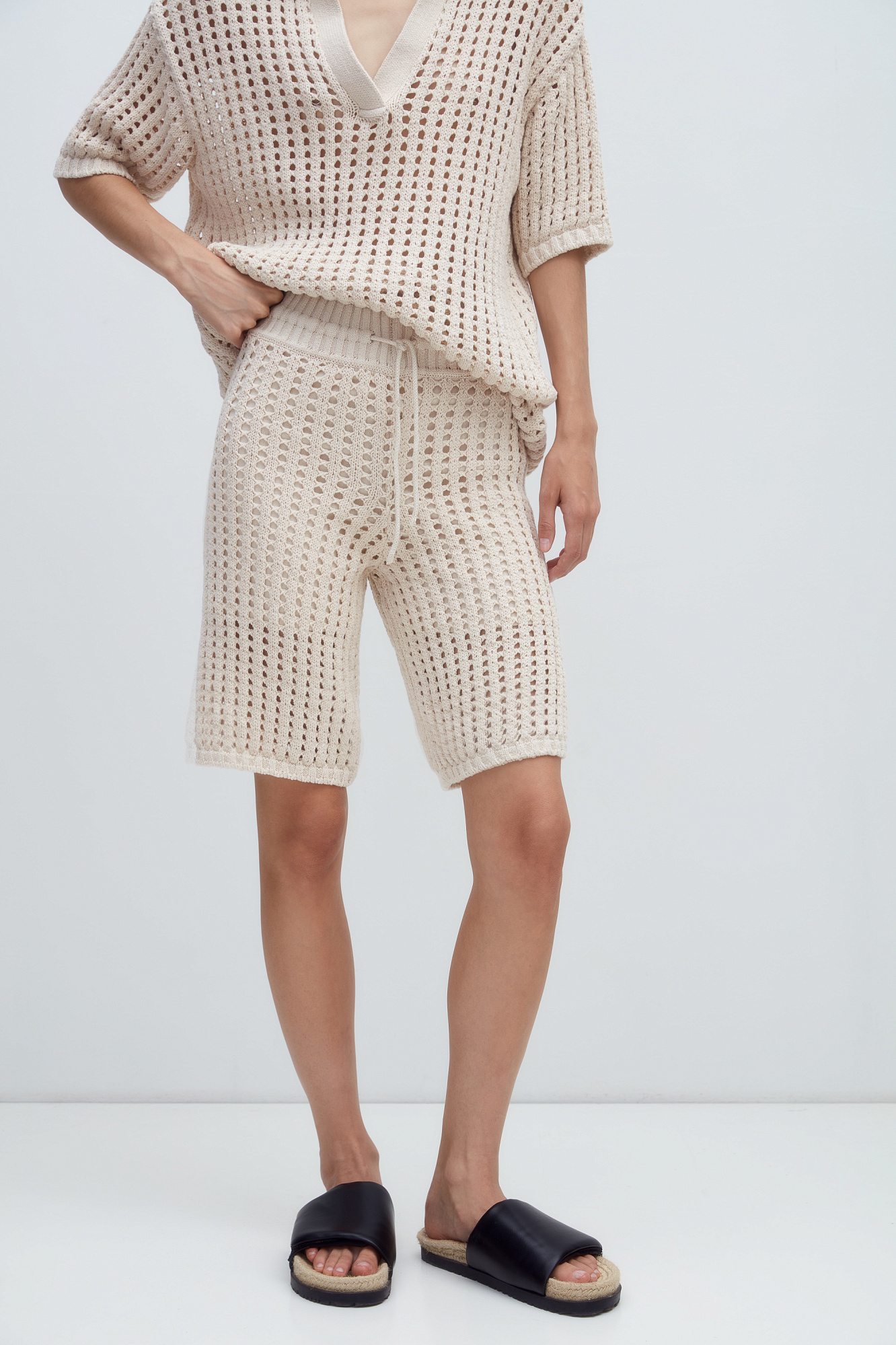 Шорты из 100% хлопка в сетку с поясом из эластичной ленты в рубчик на кулиске. Дополнить ображ можно рубашкой в таком же стиле.
