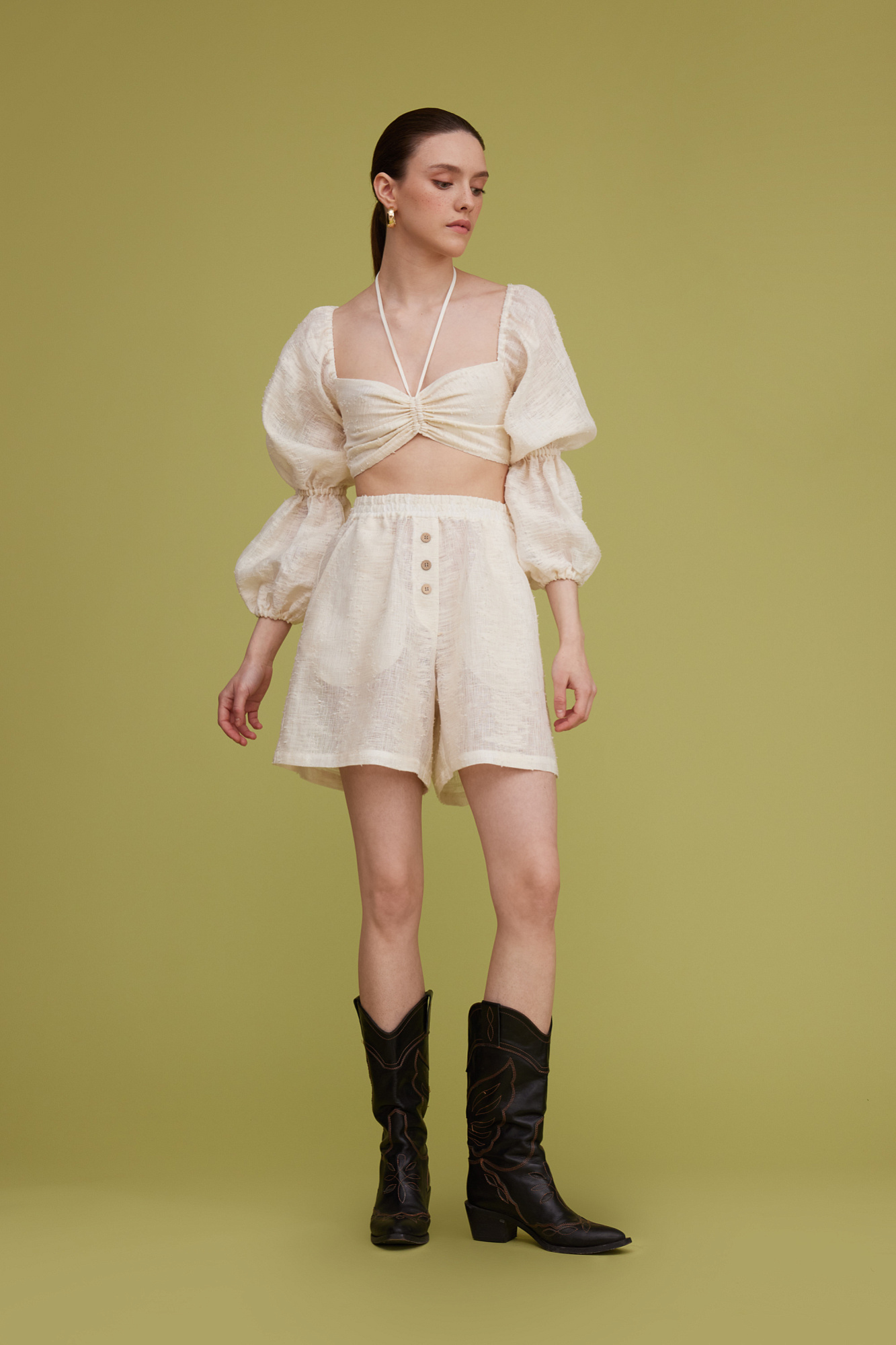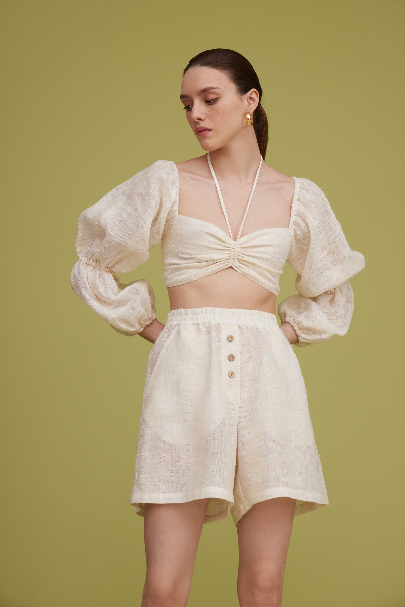 Шорты из текстурного льна. Модель прямого кроя с поясом на резинке, двумя карманами и декором в виде пуговиц.