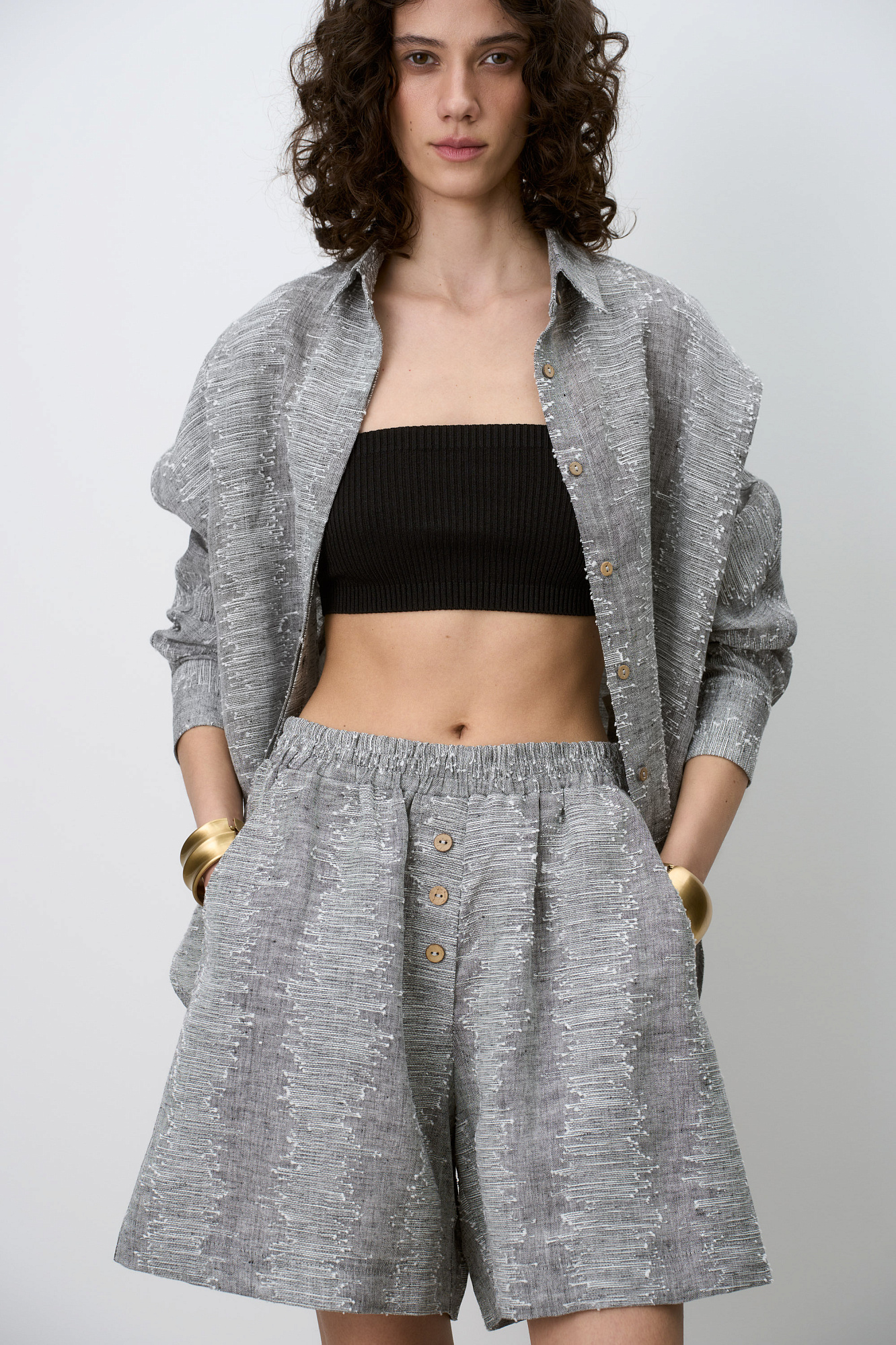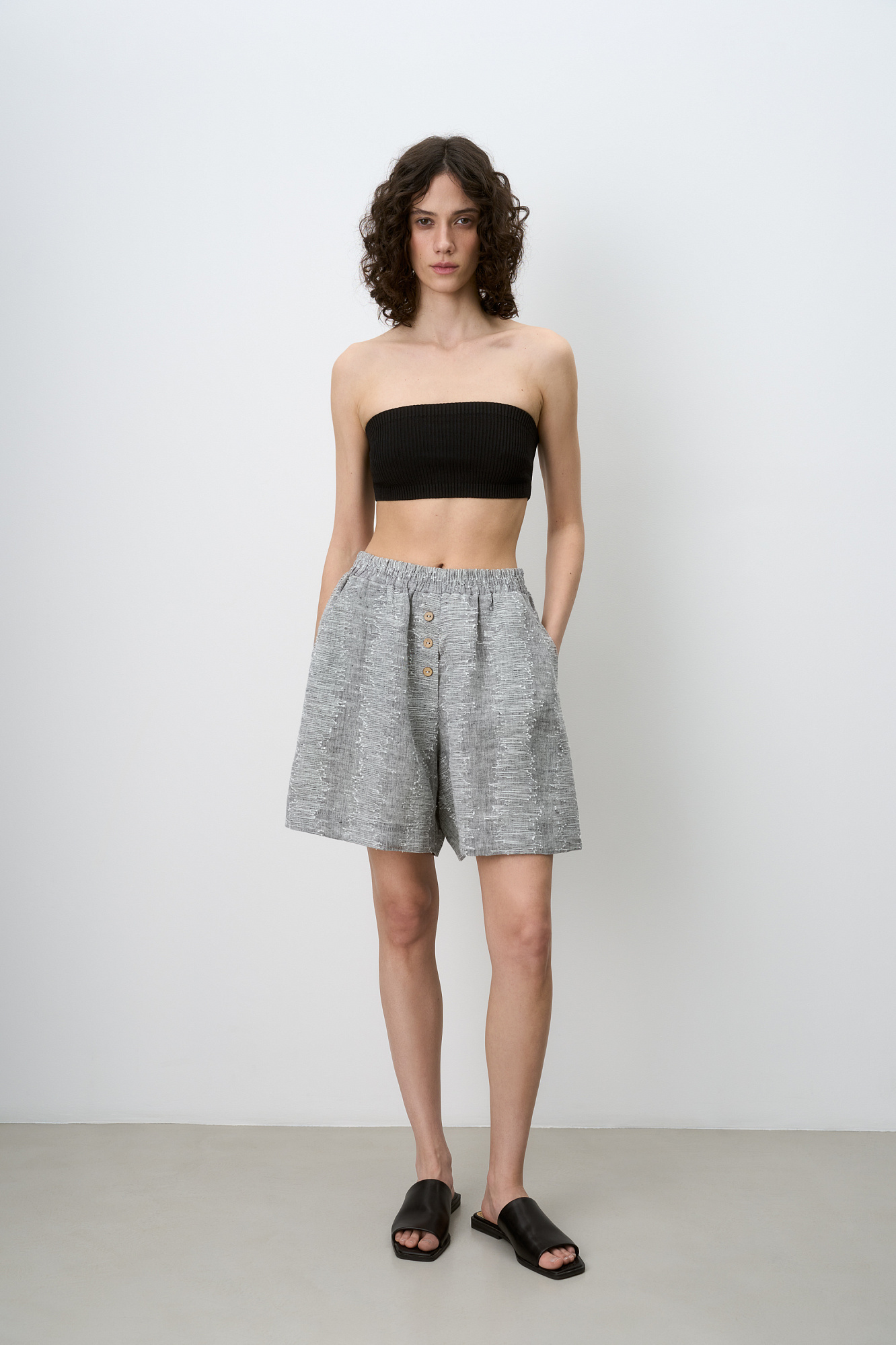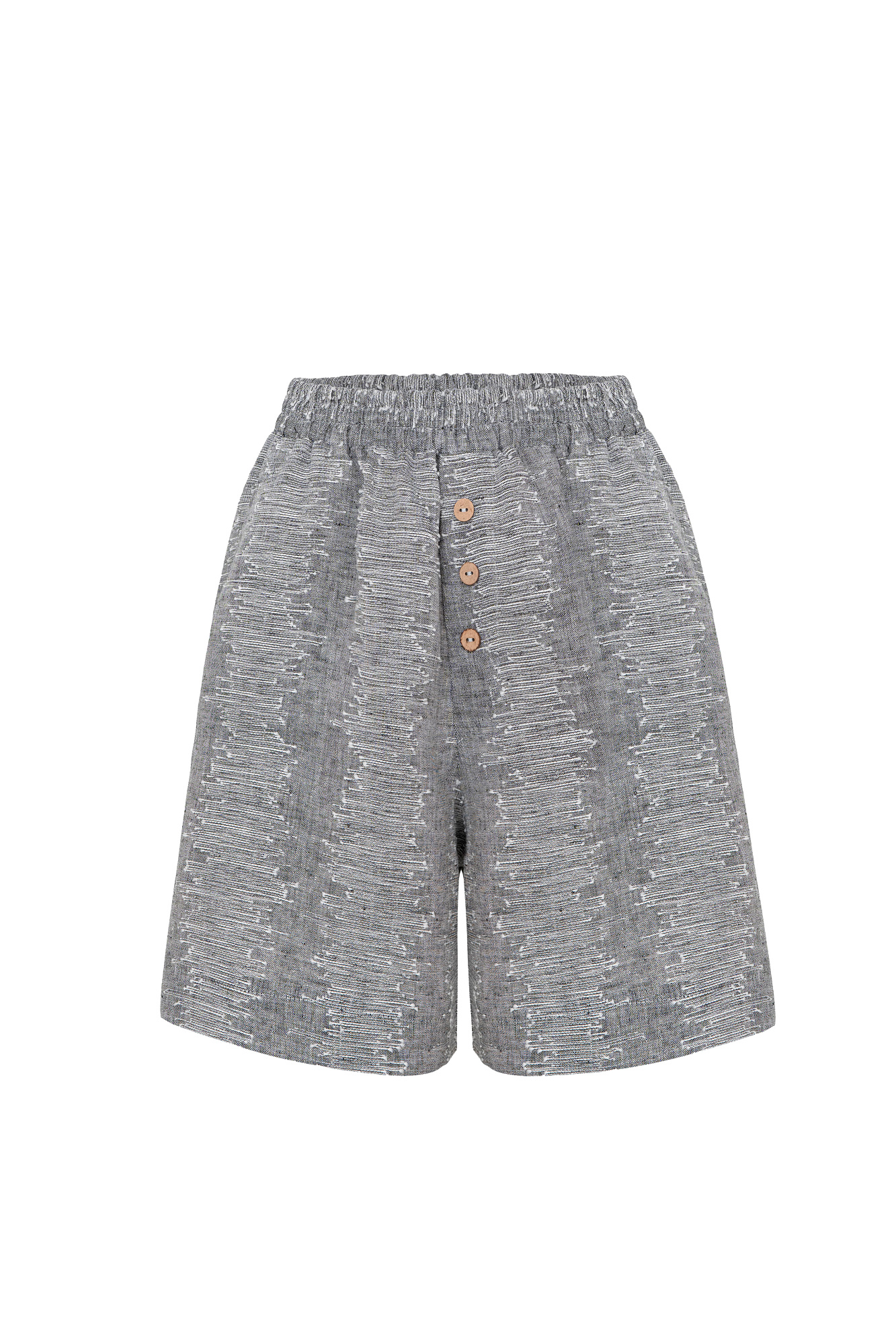 Шорты из текстурного льна. Модель прямого кроя с поясом на резинке, двумя карманами и декором в виде пуговиц.