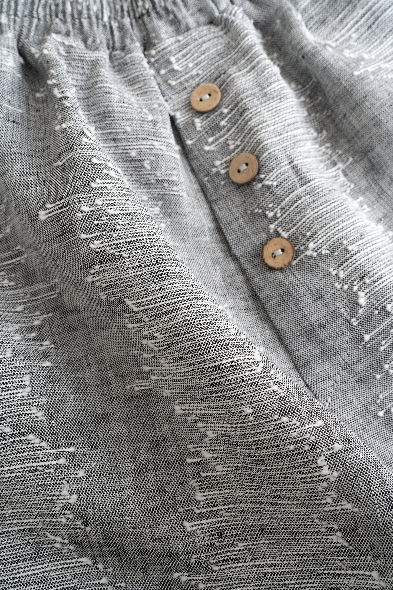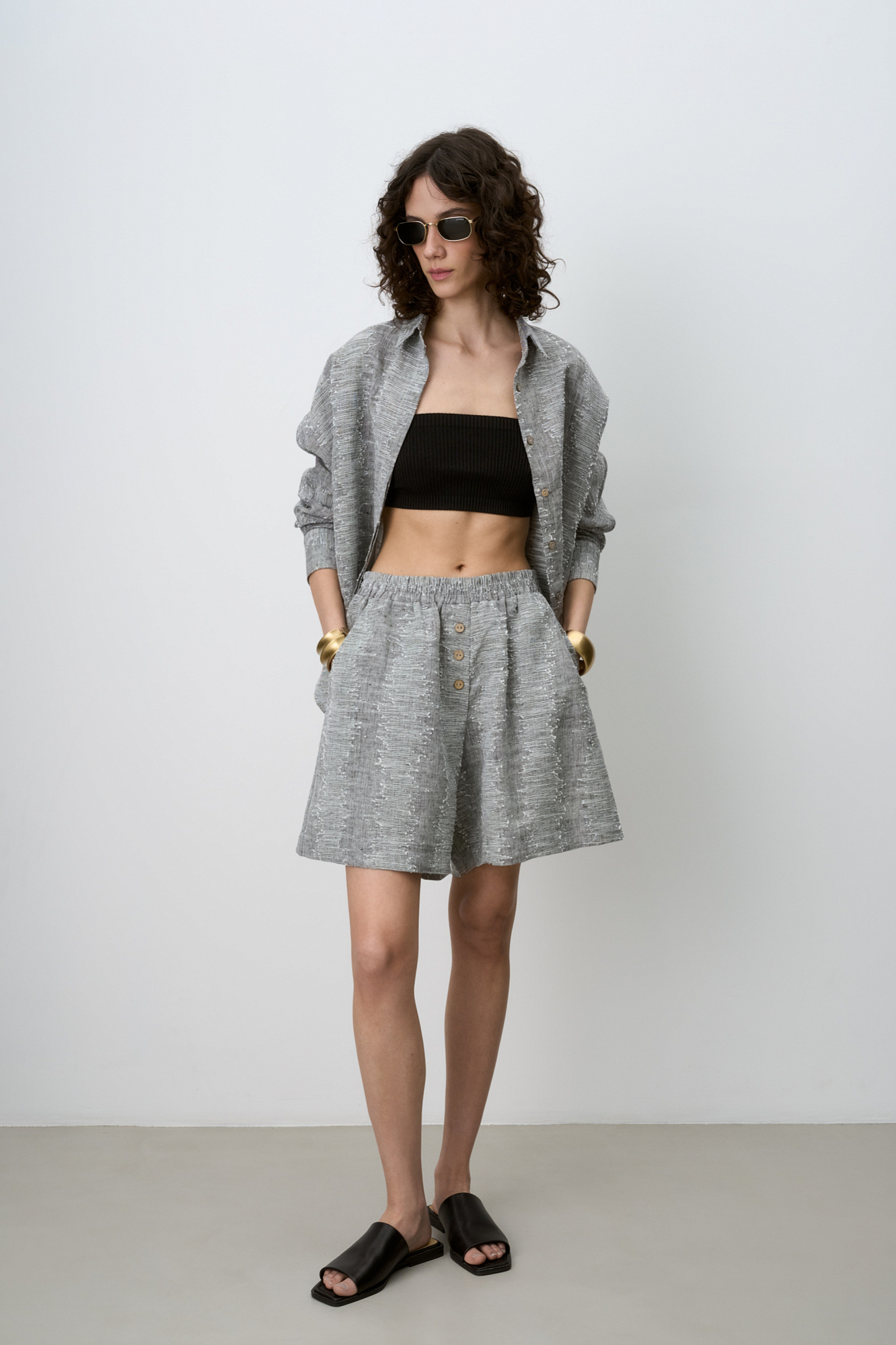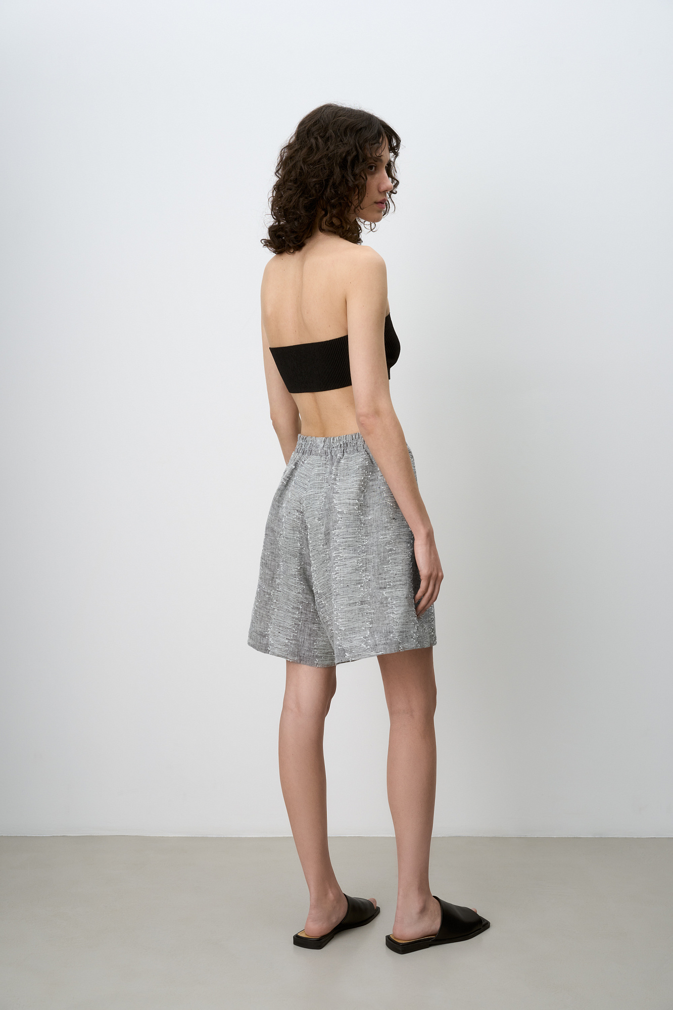 Шорты из текстурного льна. Модель прямого кроя с поясом на резинке, двумя карманами и декором в виде пуговиц.