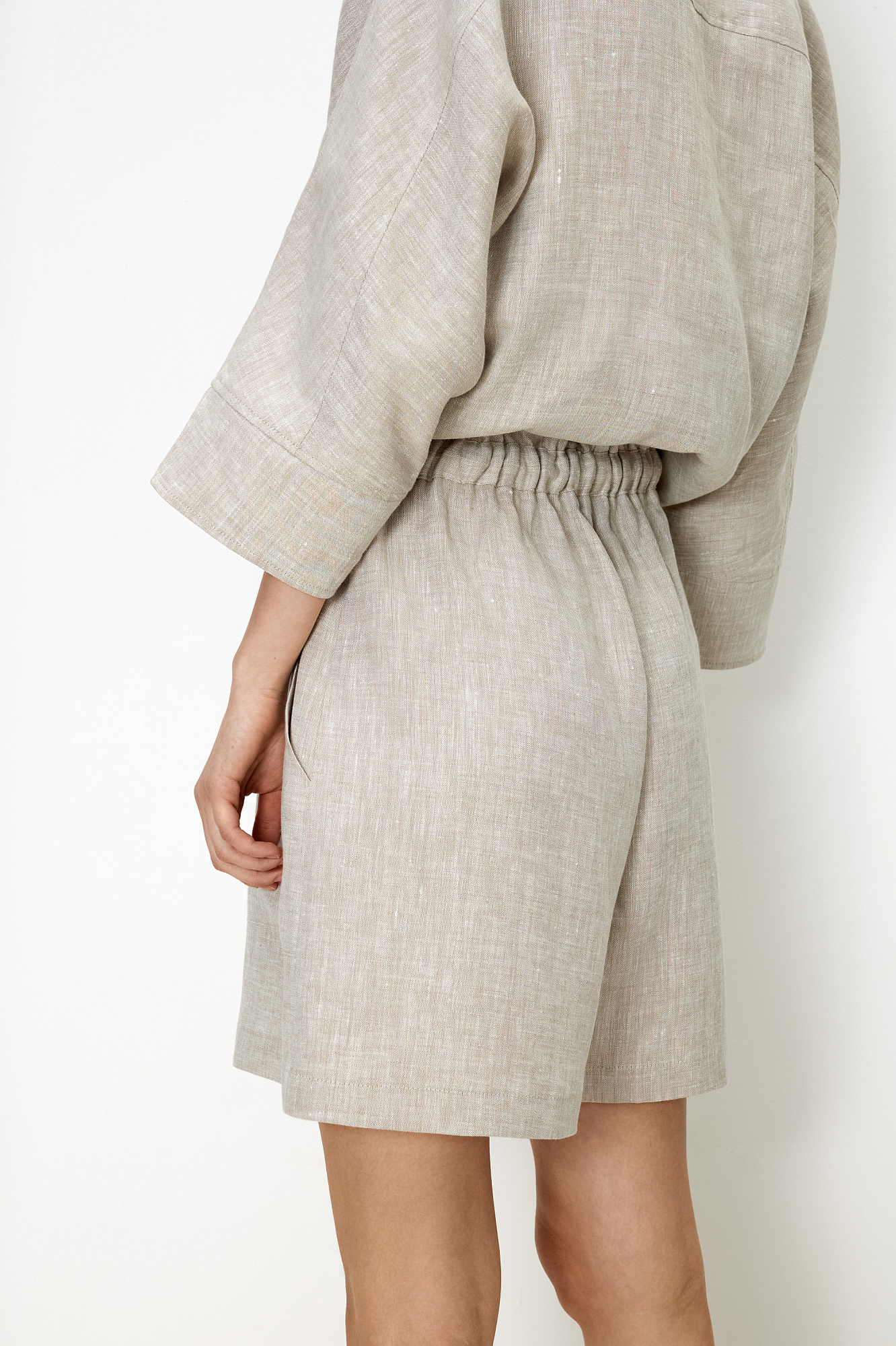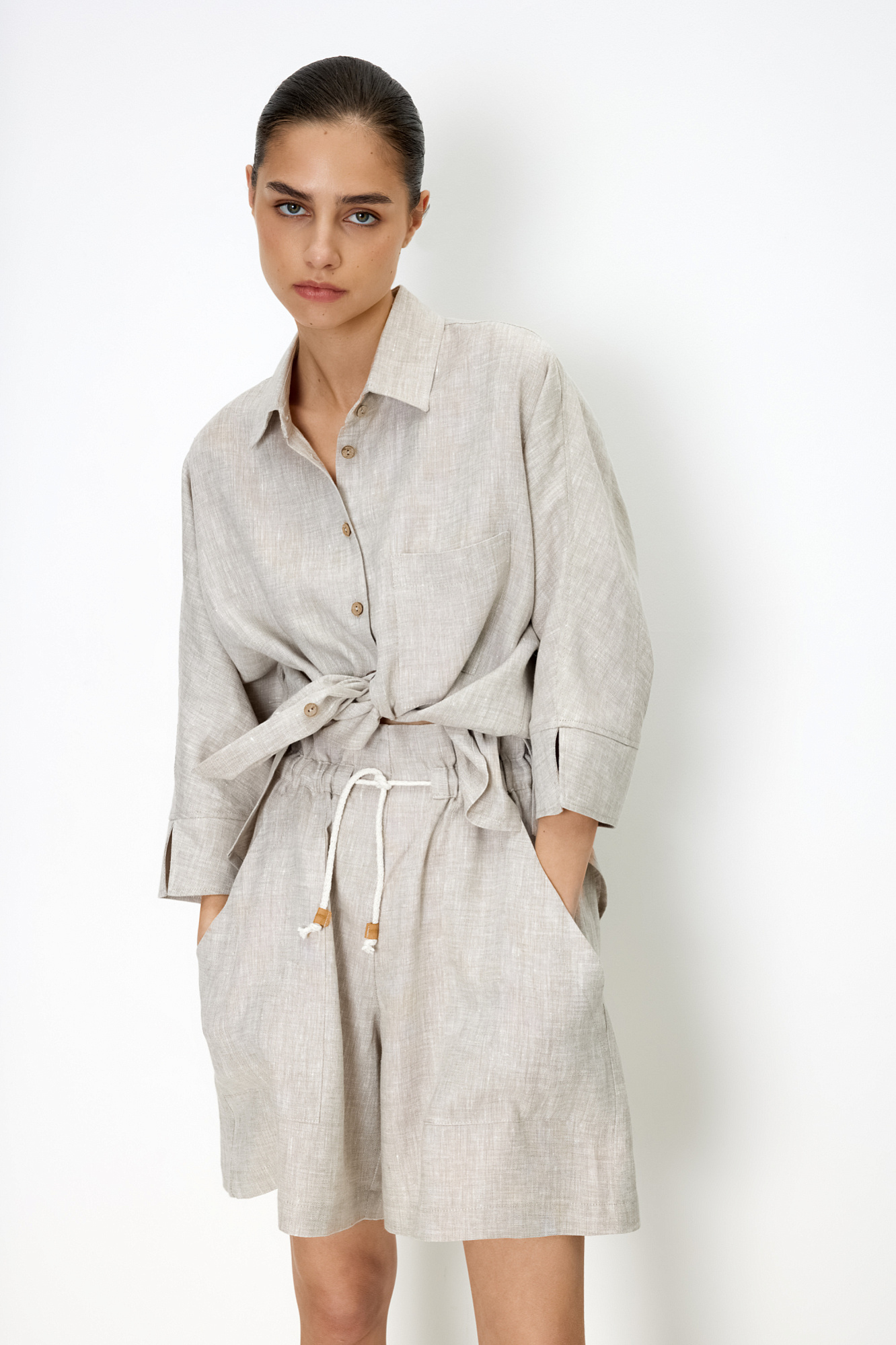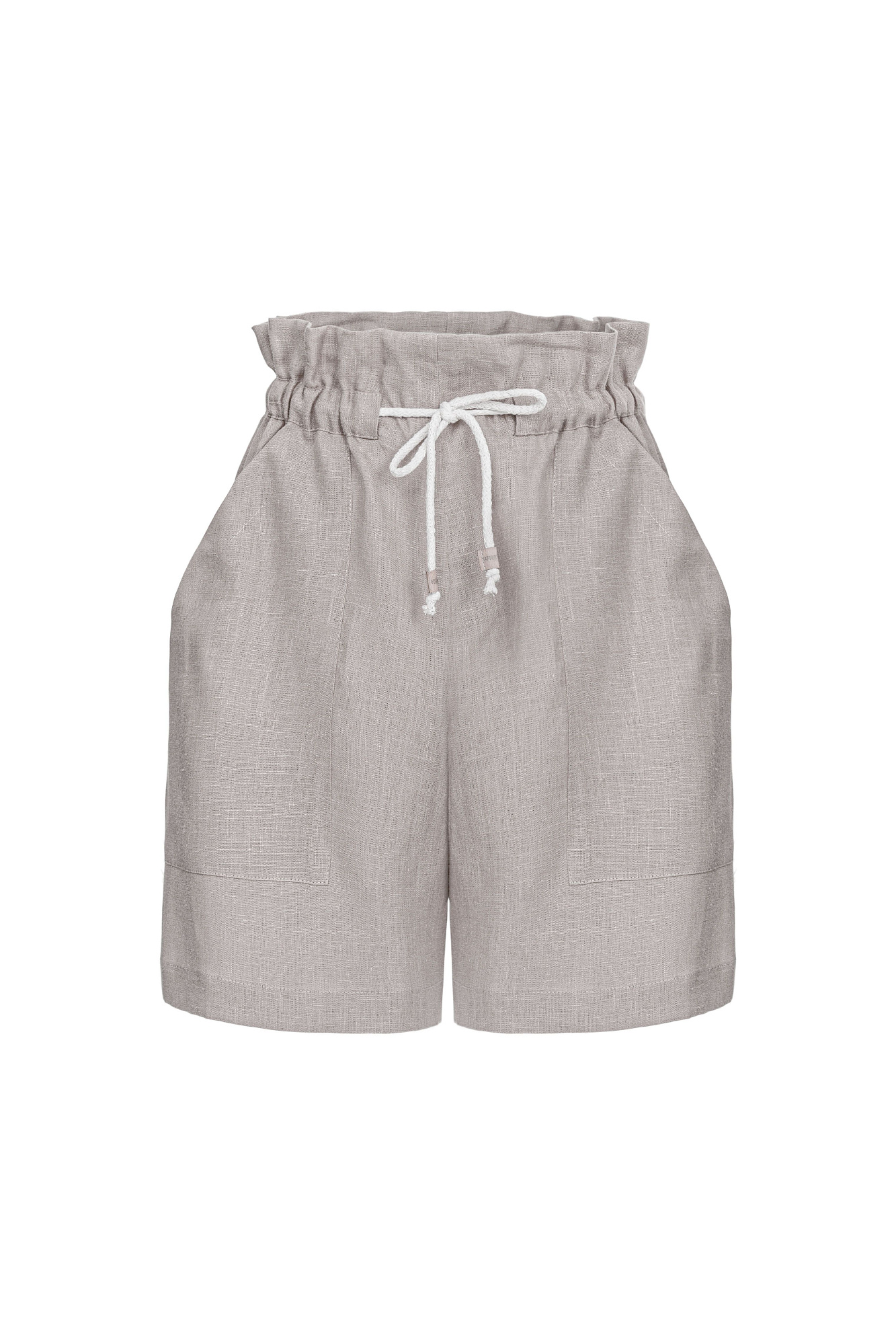 Свободные шорты из 100% льна. Модель с высокой посадкой, боковыми карманами и поясом на кулиске. Дополнить образ можно рубашкой.