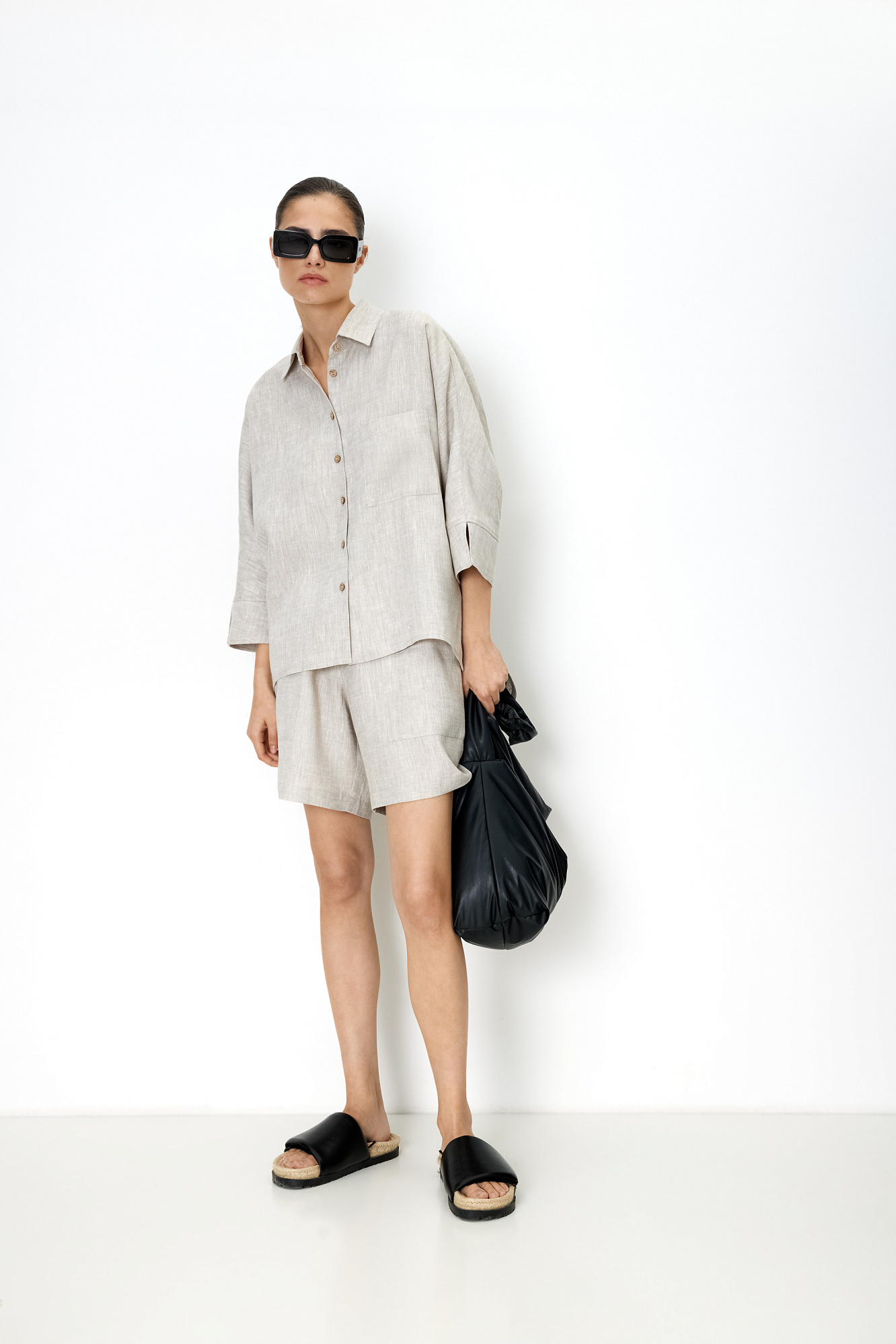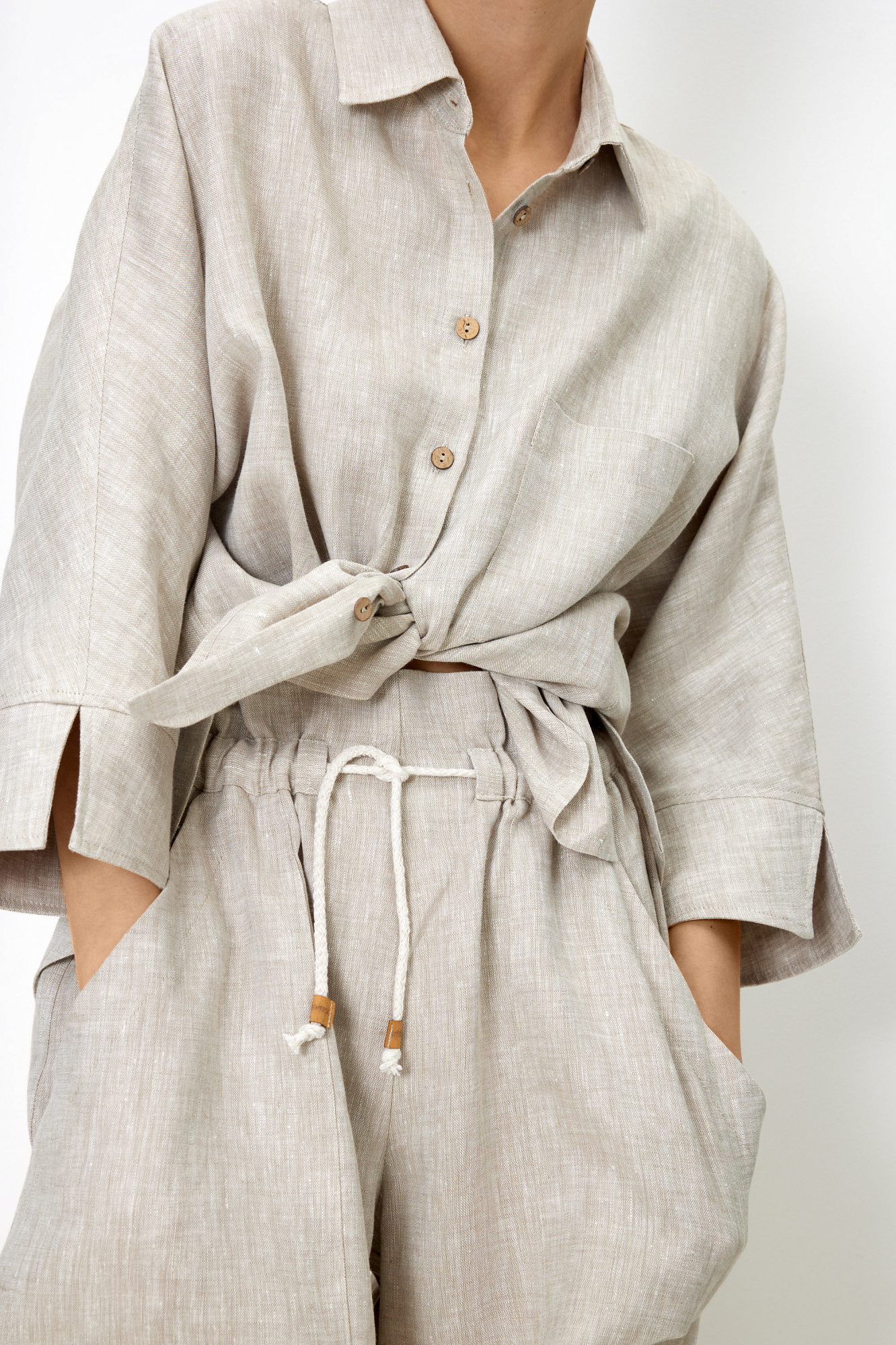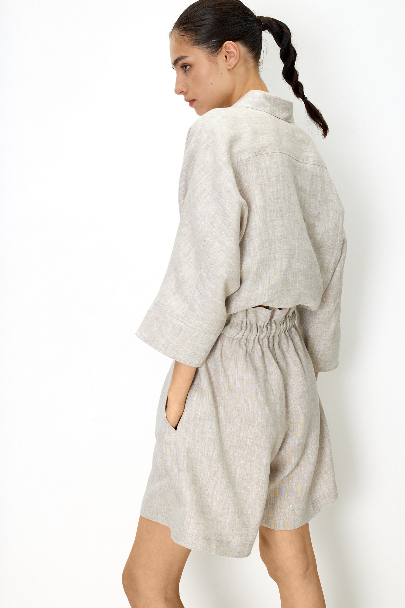 Свободные шорты из 100% льна. Модель с высокой посадкой, боковыми карманами и поясом на кулиске. Дополнить образ можно рубашкой.