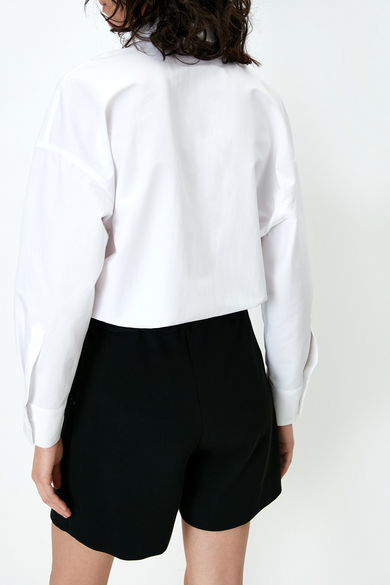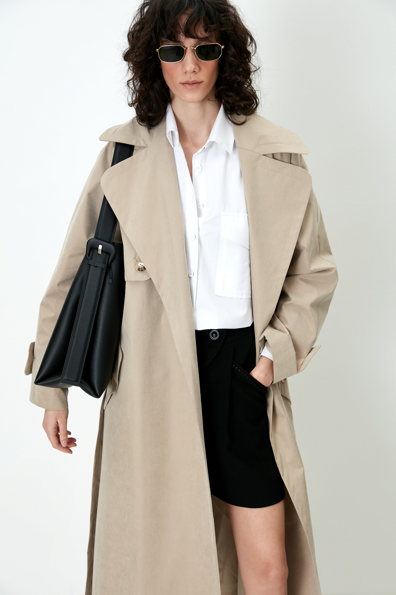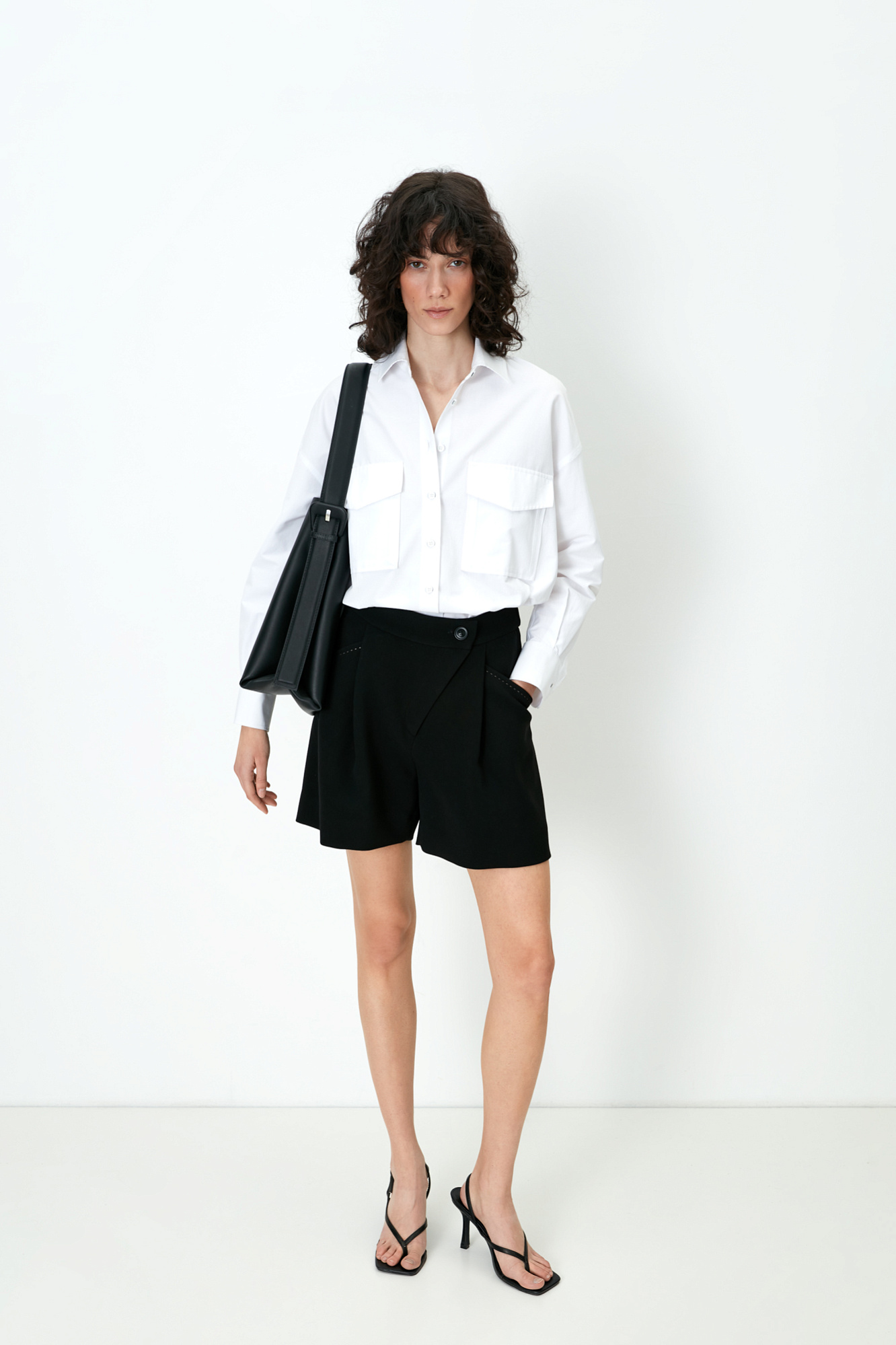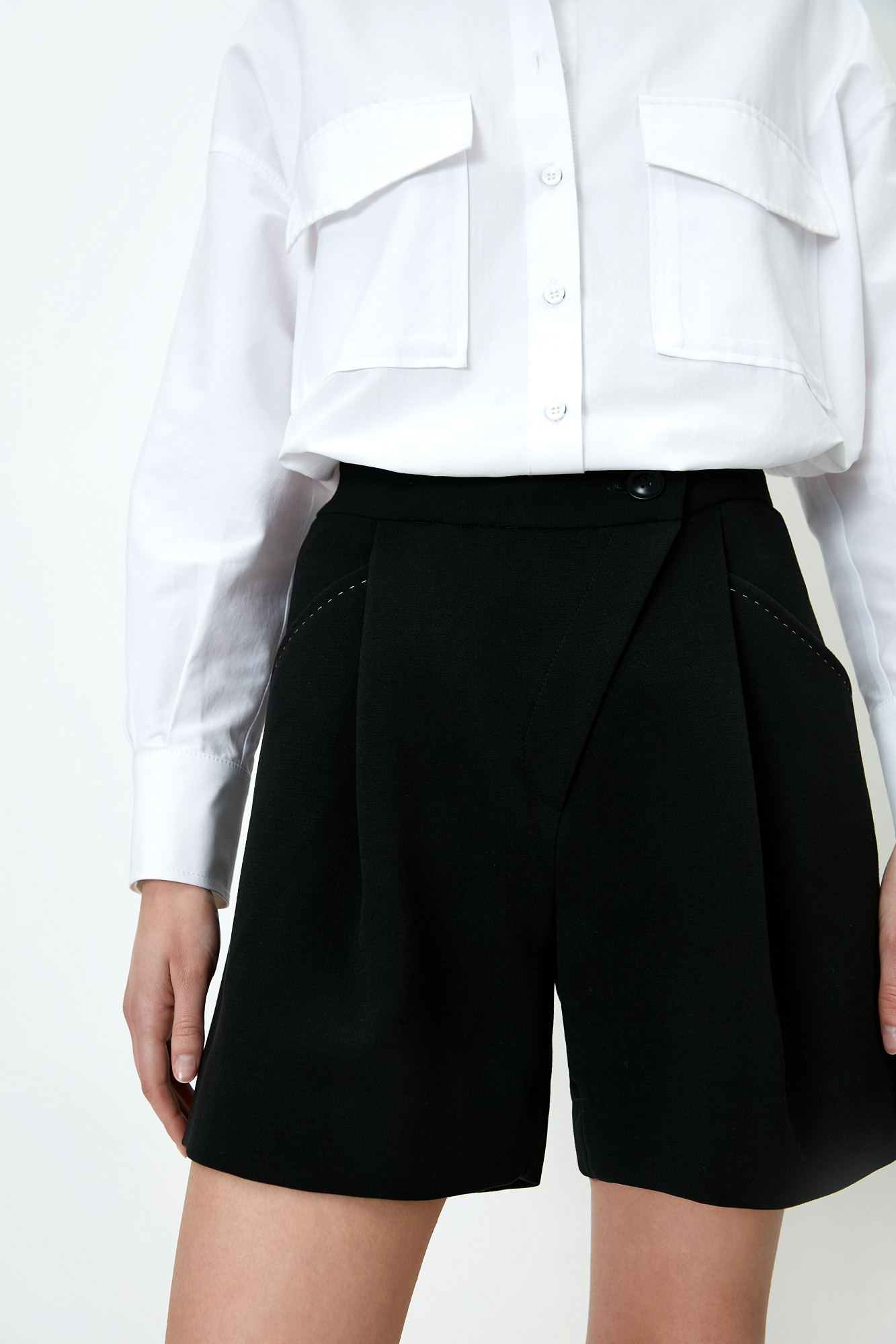 Шорты из поливискозы с косой застежкой и карманами по бокам. Дополнить образ можно рубашкой с накладными карманами и бежевым тренчем.