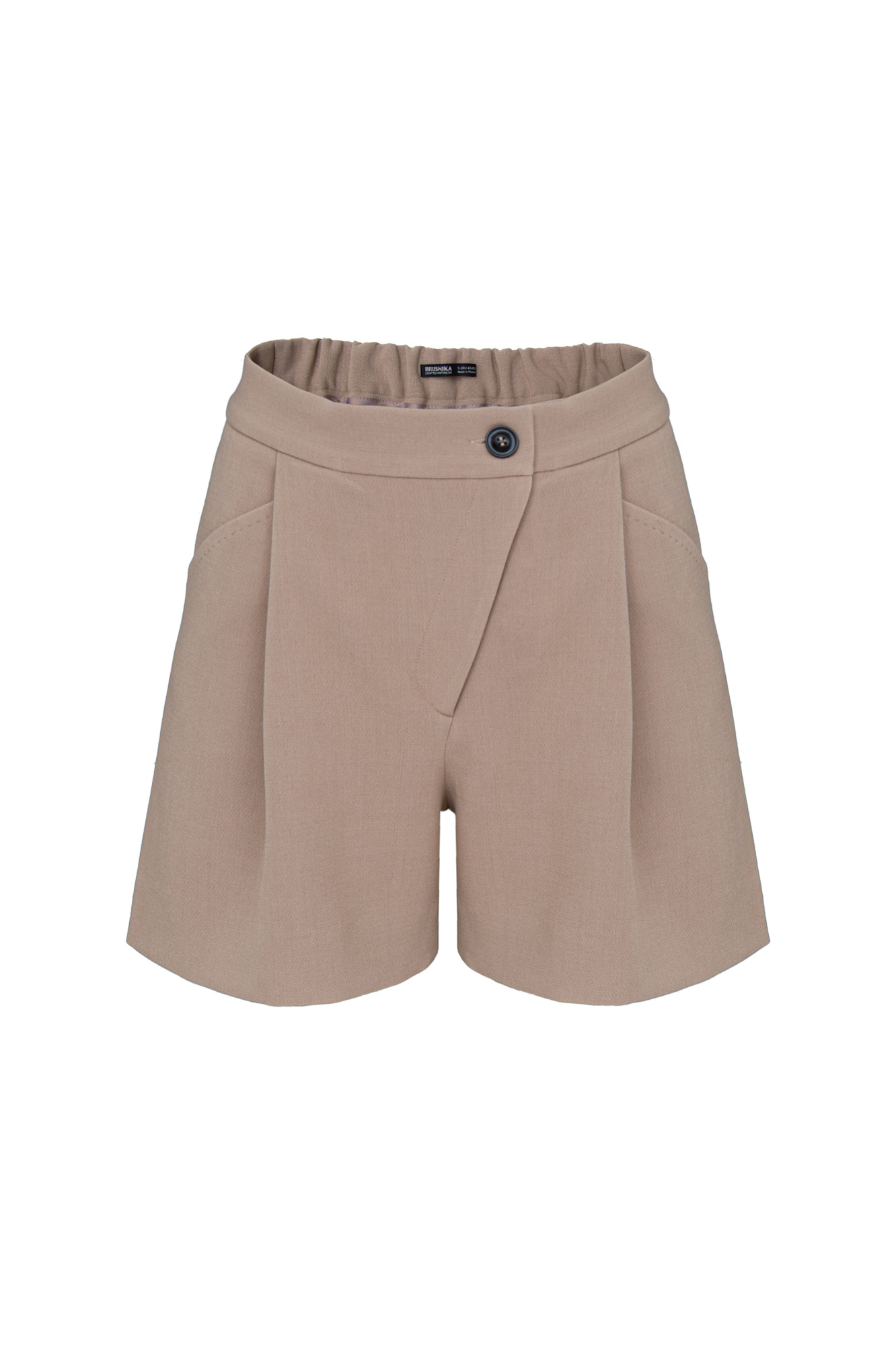 Шорты из поливискозы с косой застежкой и карманами по бокам. Дополнить образ можно жакетом или жилетом.