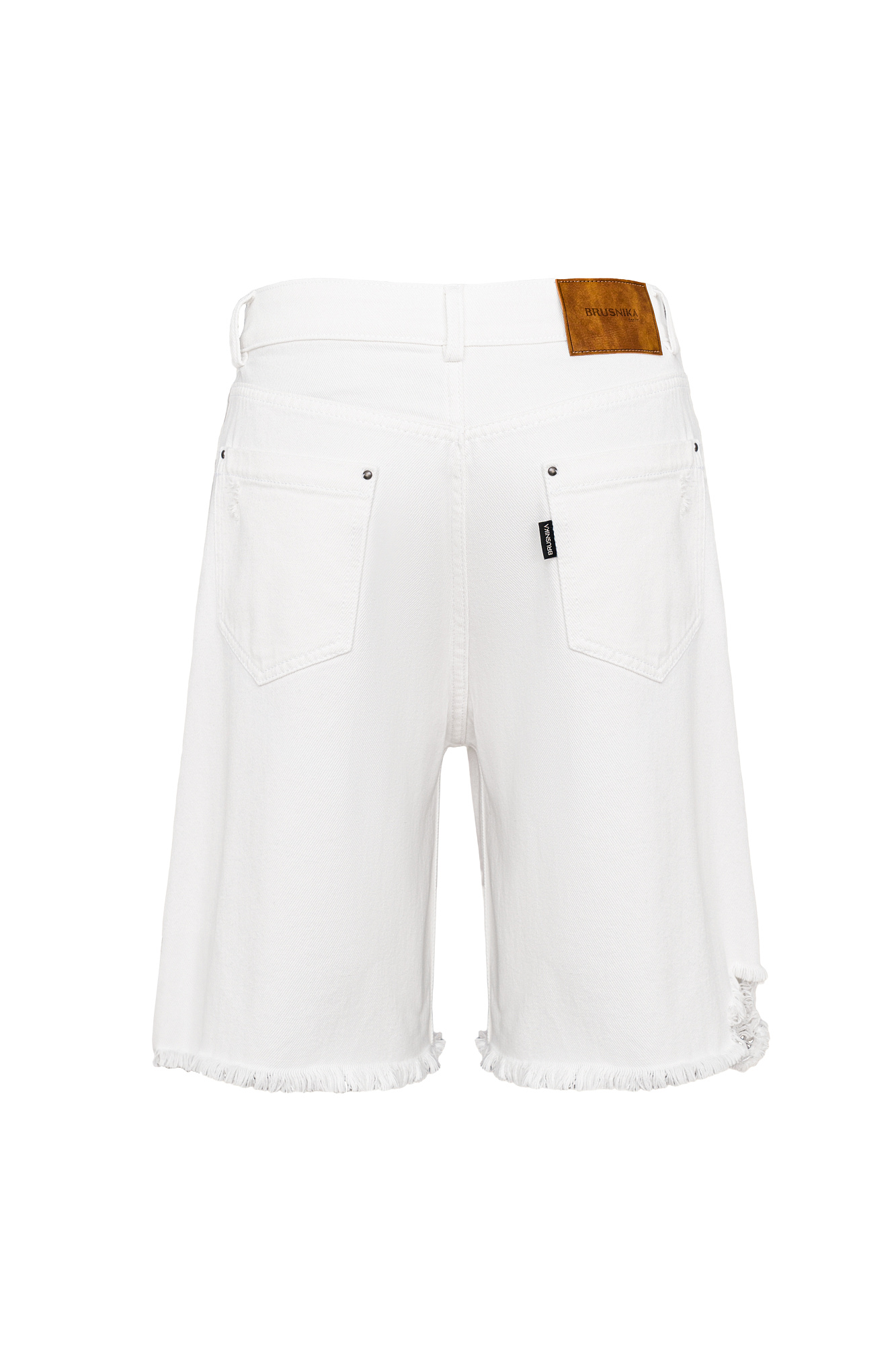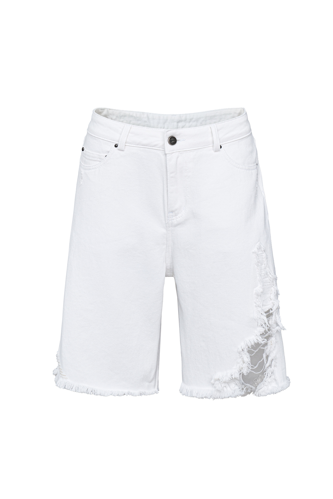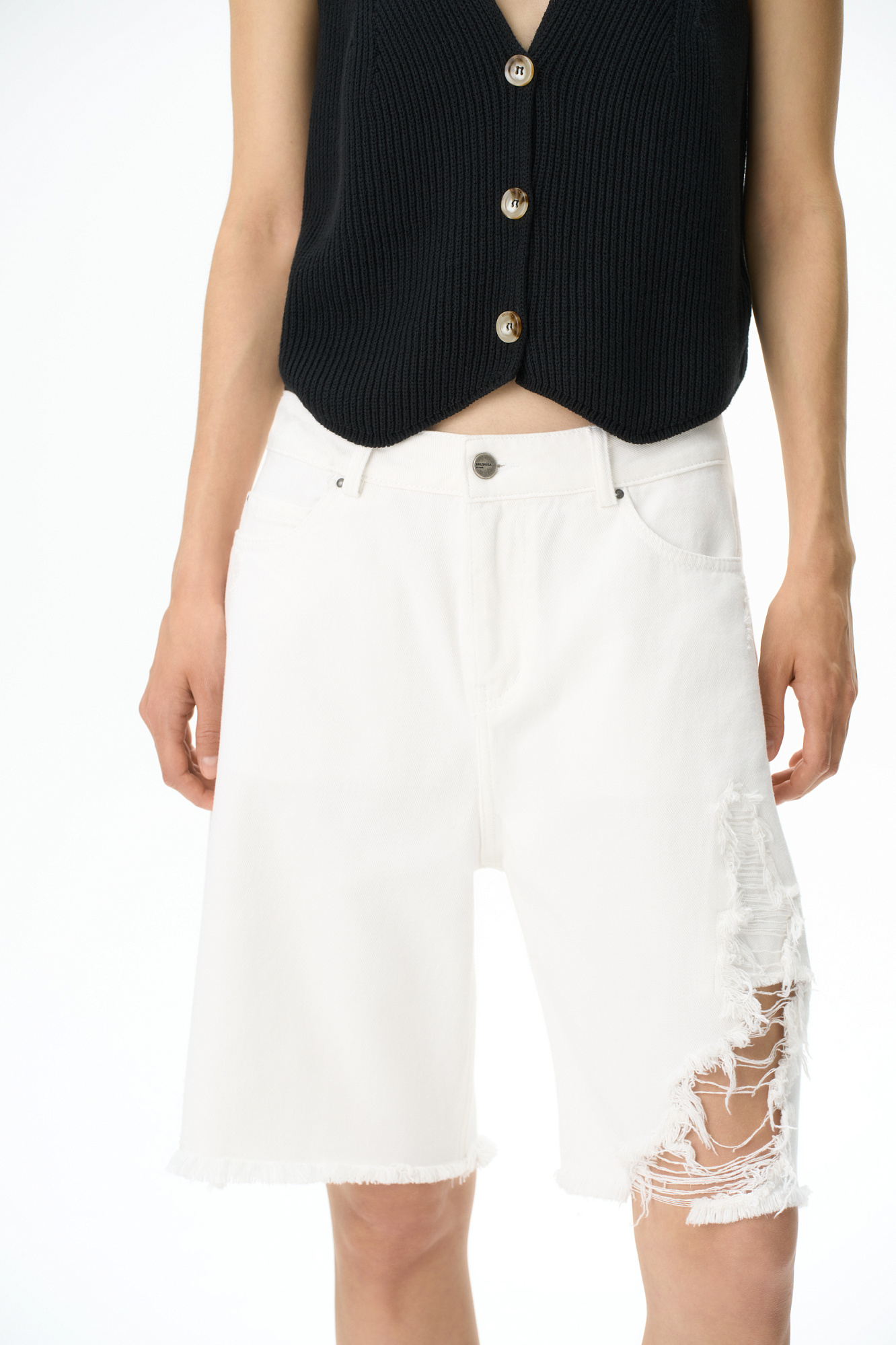 Джинсовые шорты из 100% хлопка. Модель прямого кроя с пятью карманами, со средней посадкой, шлевками на поясе для ремня и застежкой на молнию и металлическую пуговицу. Изделие декорировано имитацией необработанного края и дранью на штанине.