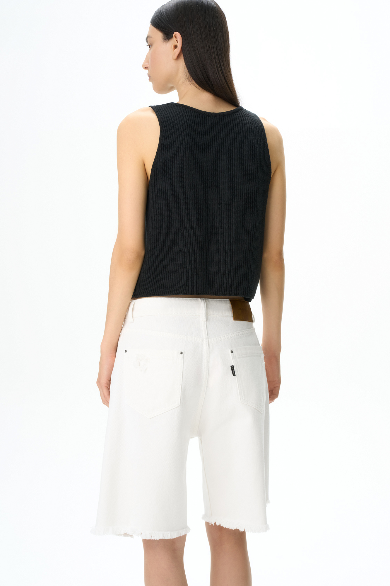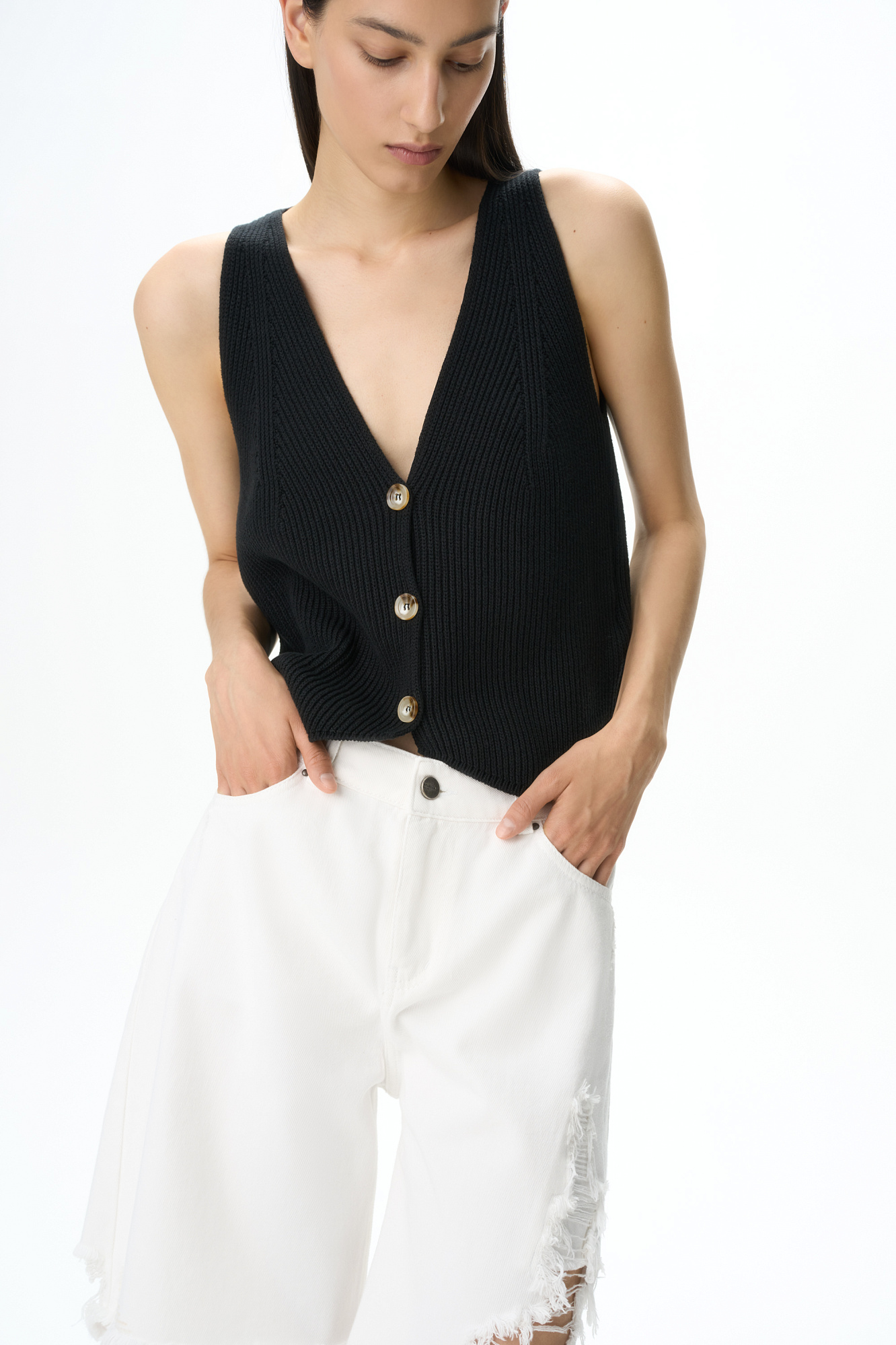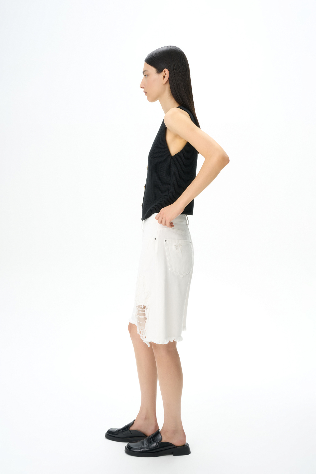 Джинсовые шорты из 100% хлопка. Модель прямого кроя с пятью карманами, со средней посадкой, шлевками на поясе для ремня и застежкой на молнию и металлическую пуговицу. Изделие декорировано имитацией необработанного края и дранью на штанине.