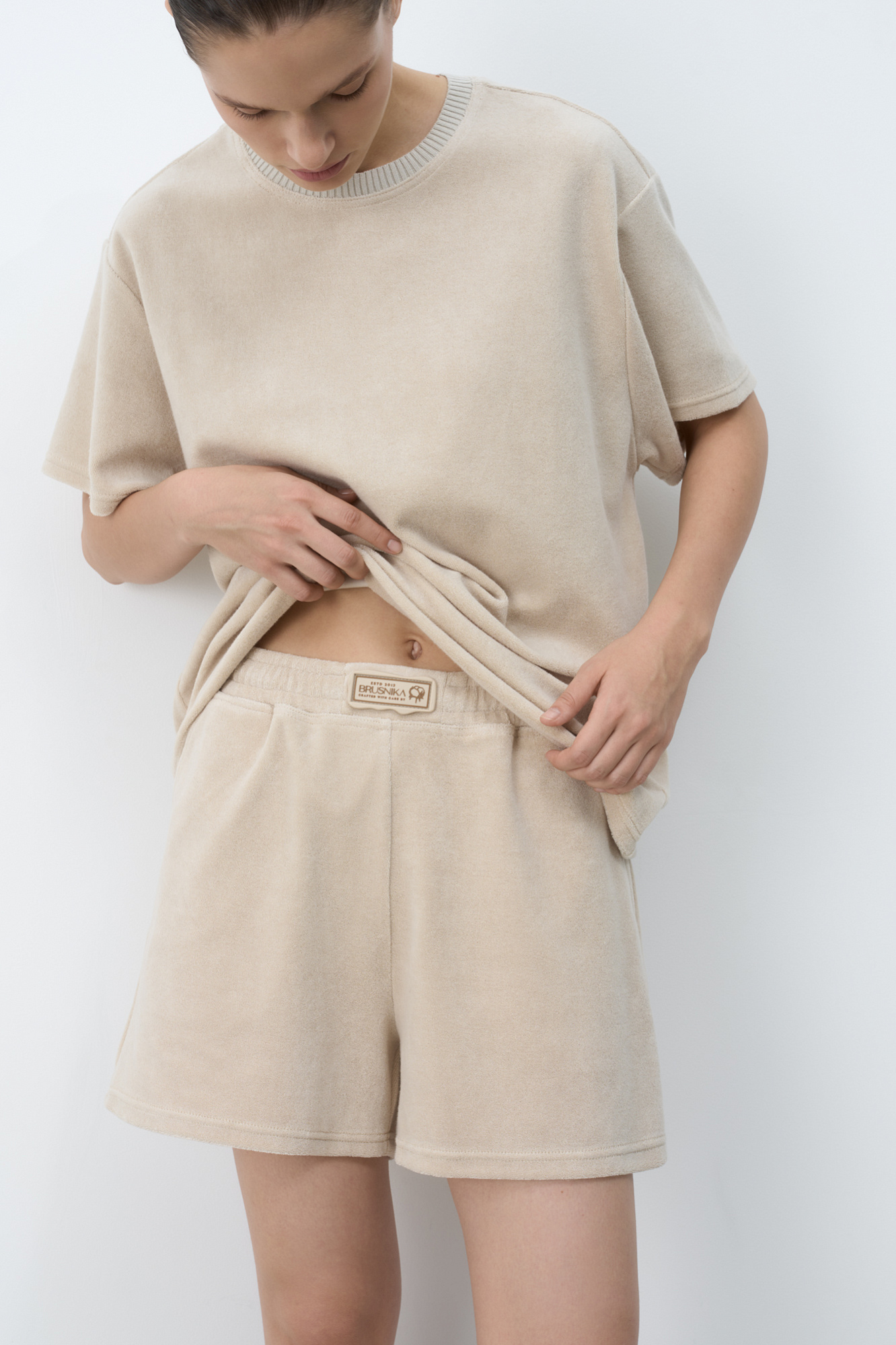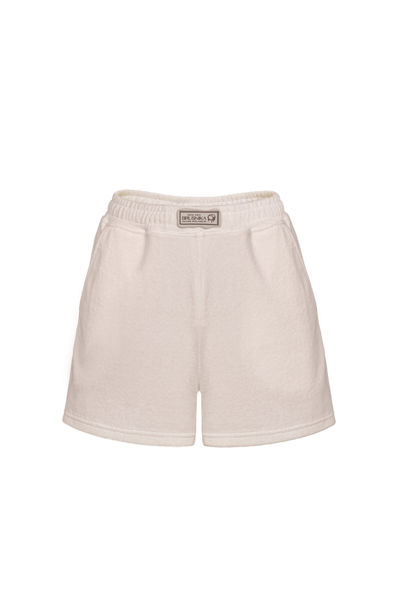 Шорты из махрового трикотажа. Модель свободного силуэта с боковыми карманами и брендированным ярлыком. Эластичный пояс на резинке в рубчик. Дополнить образ можно футболкой в таком же стиле.