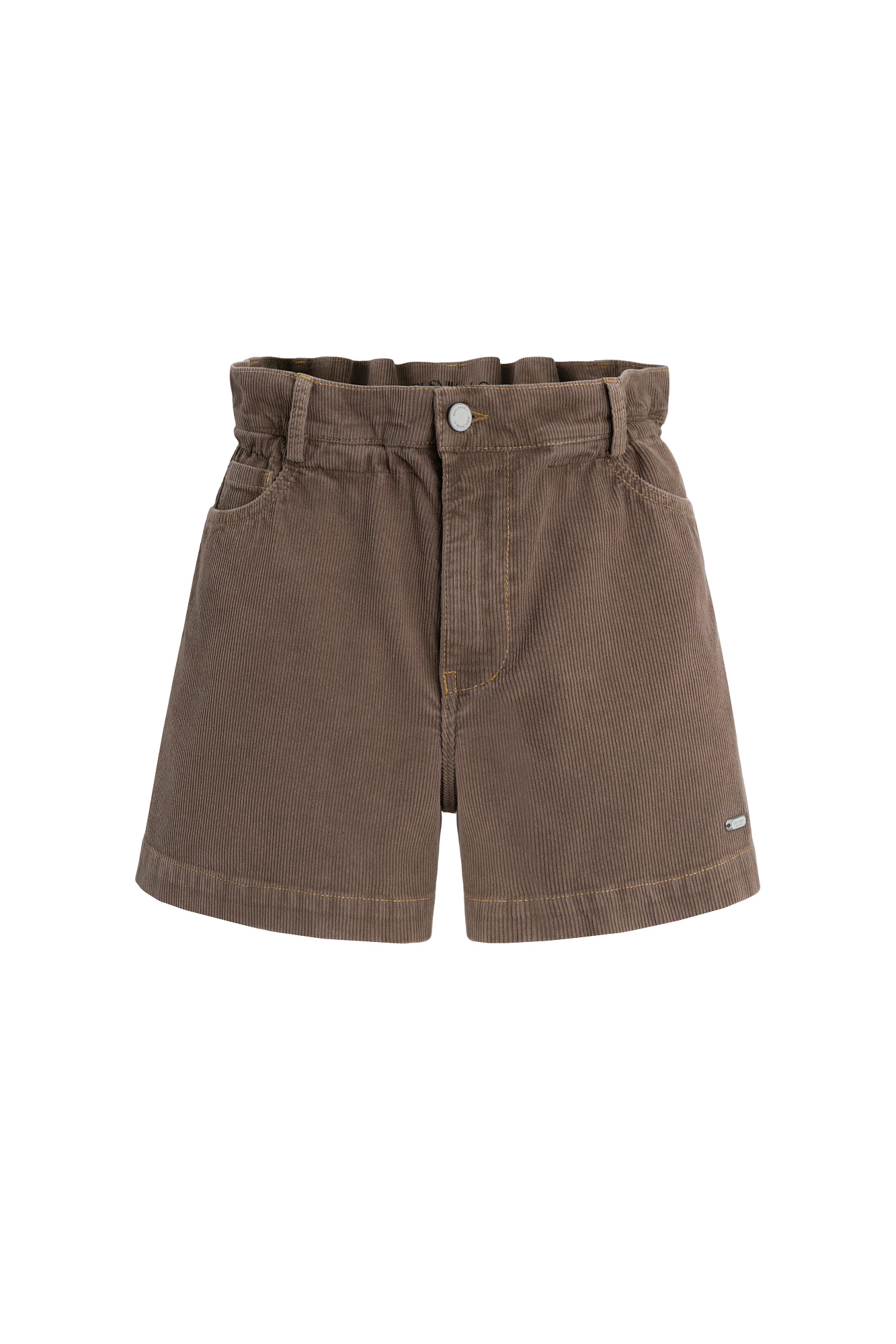 Вельветовые короткие шорты из 100% хлопка. Модель с высокой посадкой. Пояс изделия выполнен на эластичной резинке. Застежка на молнию и пуговицу. Шлевки на поясе для ремня.