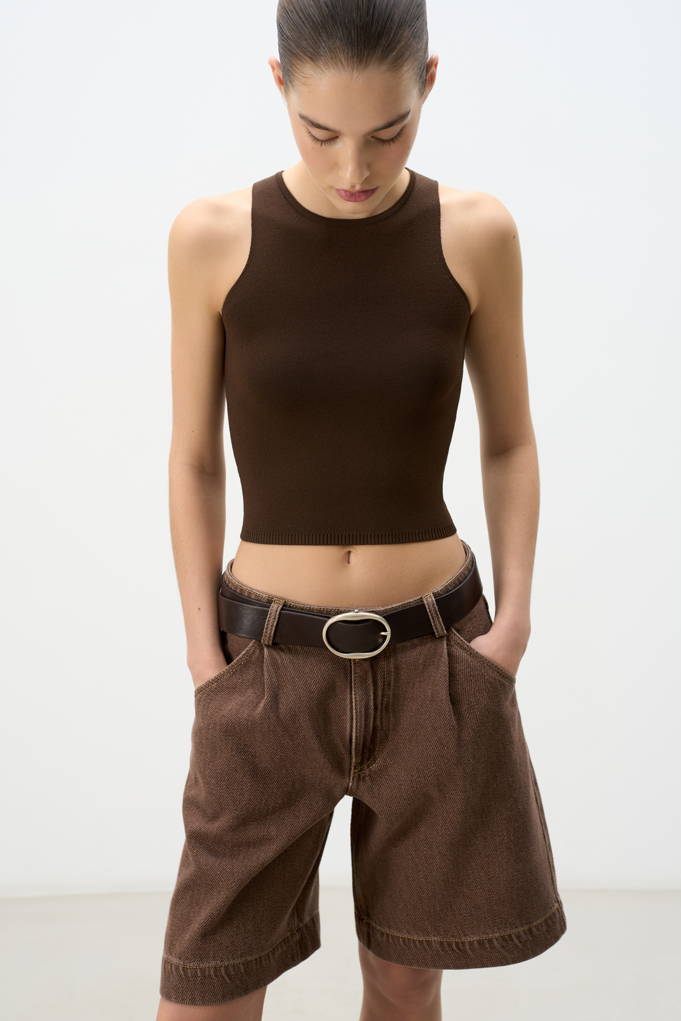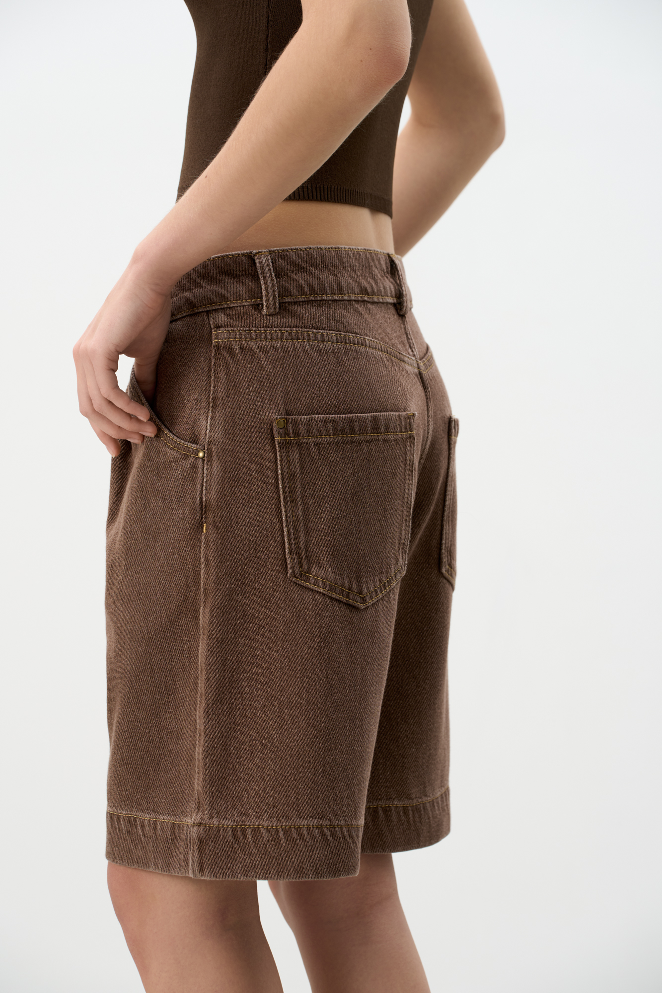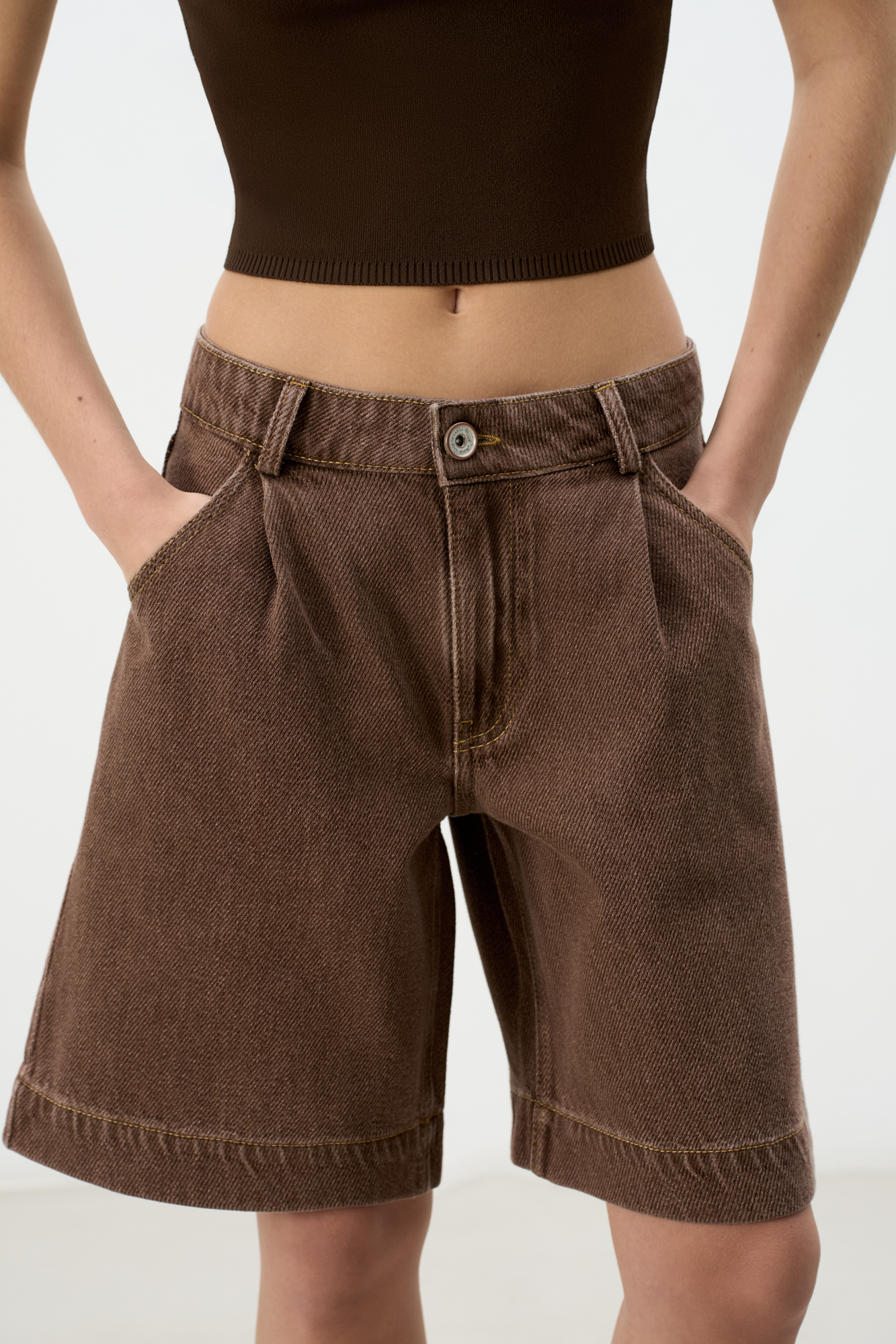 Джинсовые шорты из 100% хлопка с текстурой в диагональный рубчик. Модель прямого кроя с защипами, шлевками на поясе для ремня и застежкой на молнию и пуговицу. 4 кармана.