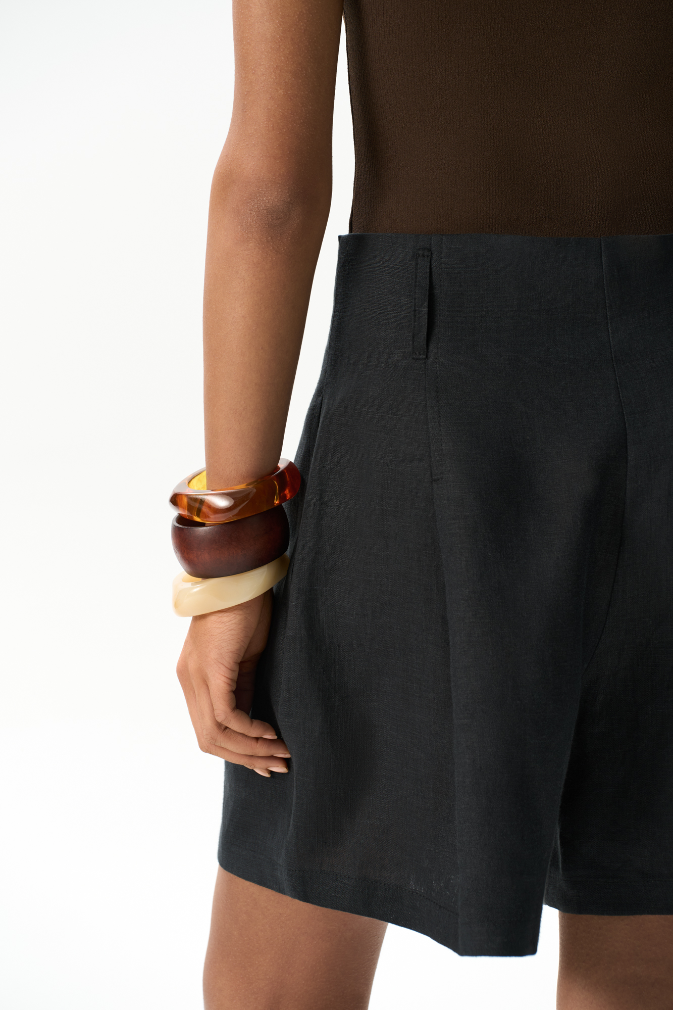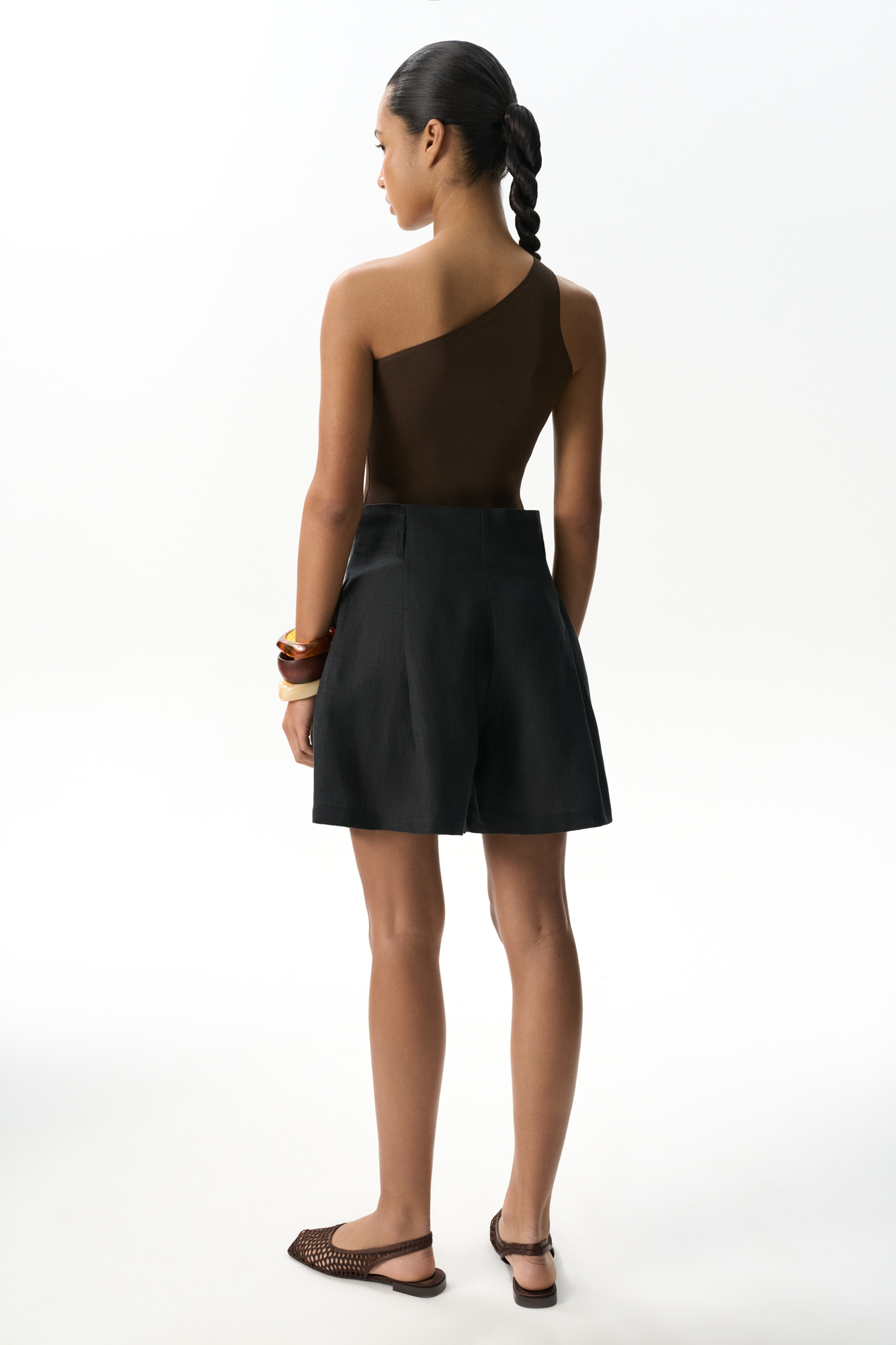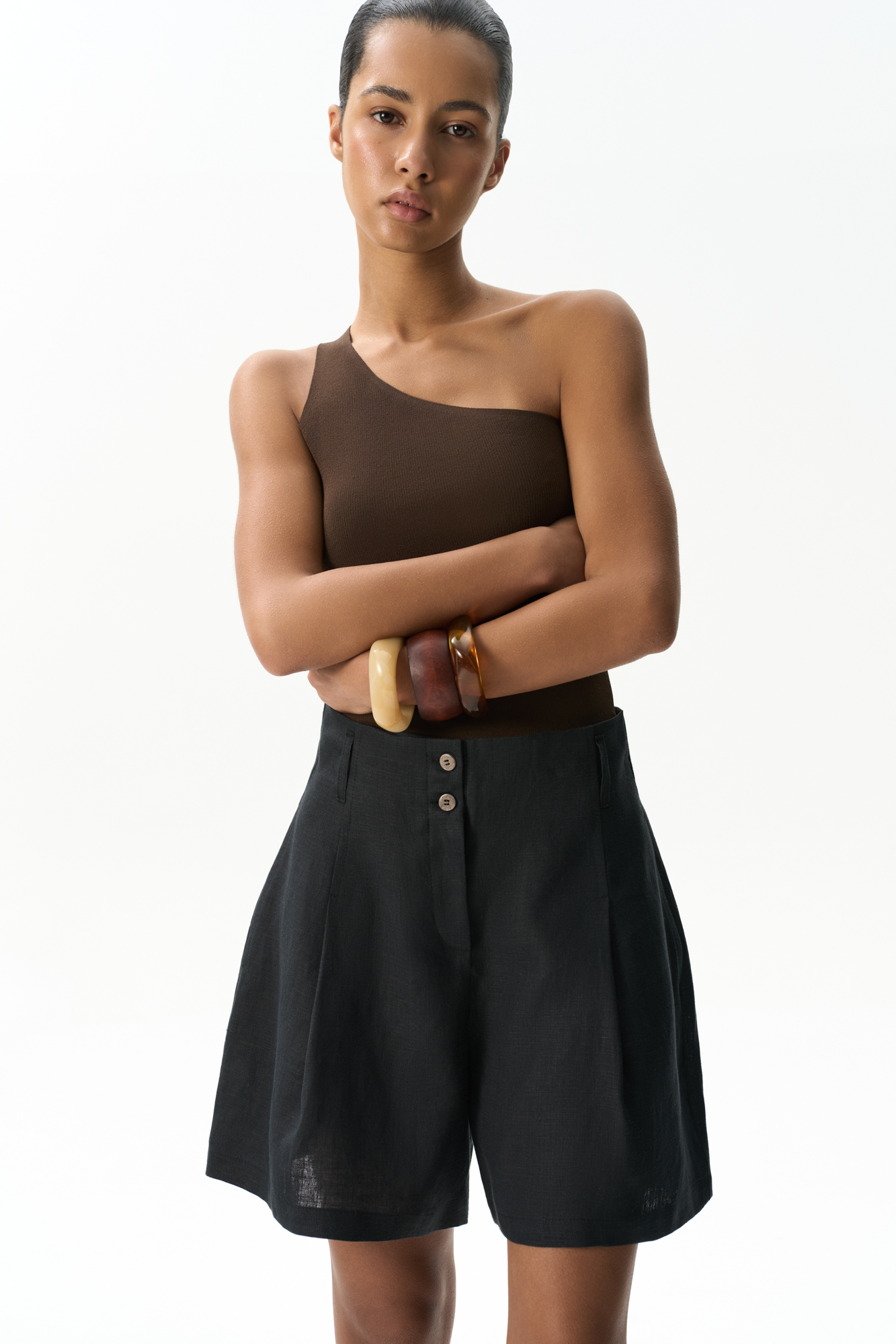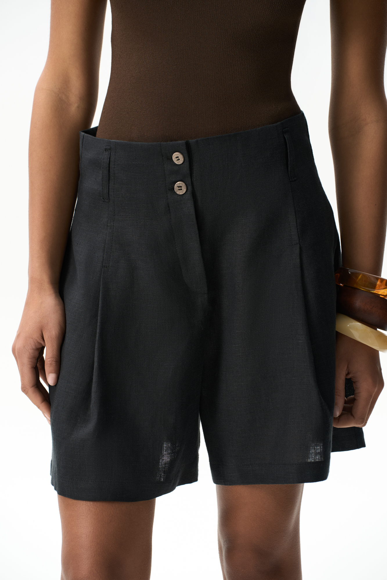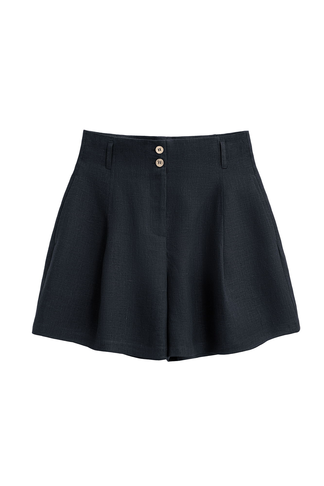 Шорты из 100% льна с высокой посадкой. Модель прямого кроя с защипами и боковыми карманами. Шлевки на поясе для ремня. Застежка на молнию и две пуговицы.