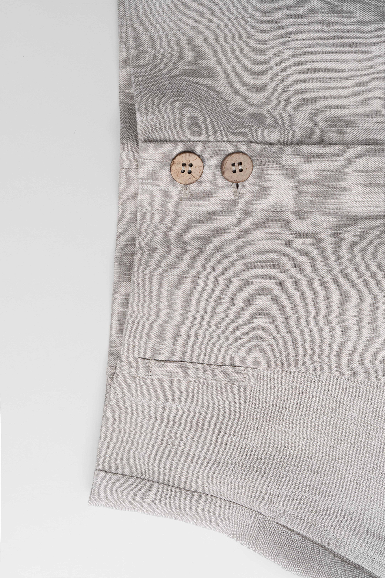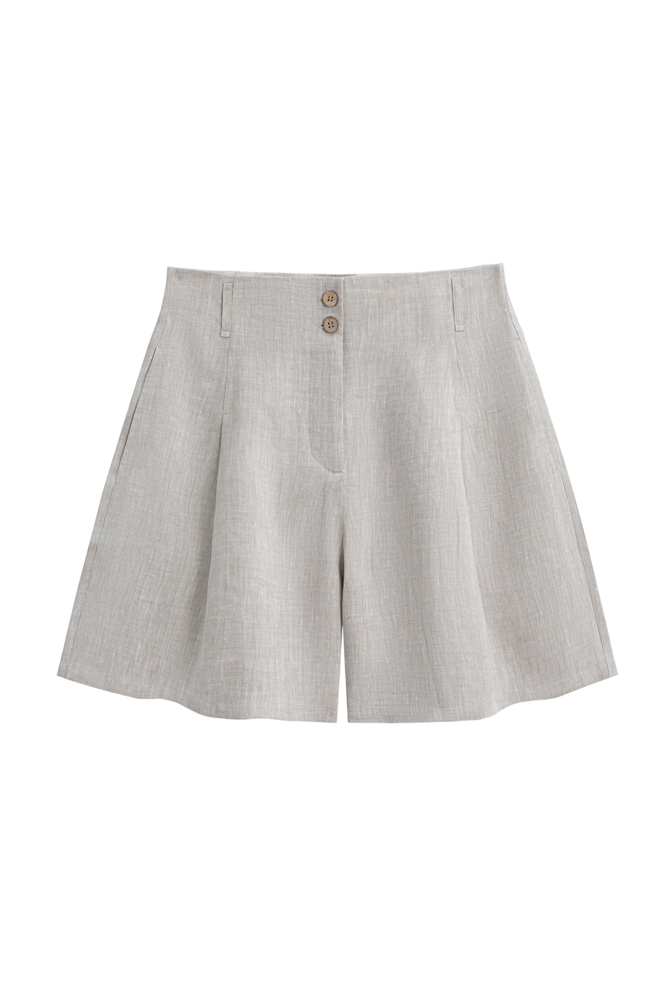 Шорты из 100% льна с высокой посадкой. Модель прямого кроя с защипами и боковыми карманами. Шлевки на поясе для ремня. Застежка на молнию и две пуговицы.
