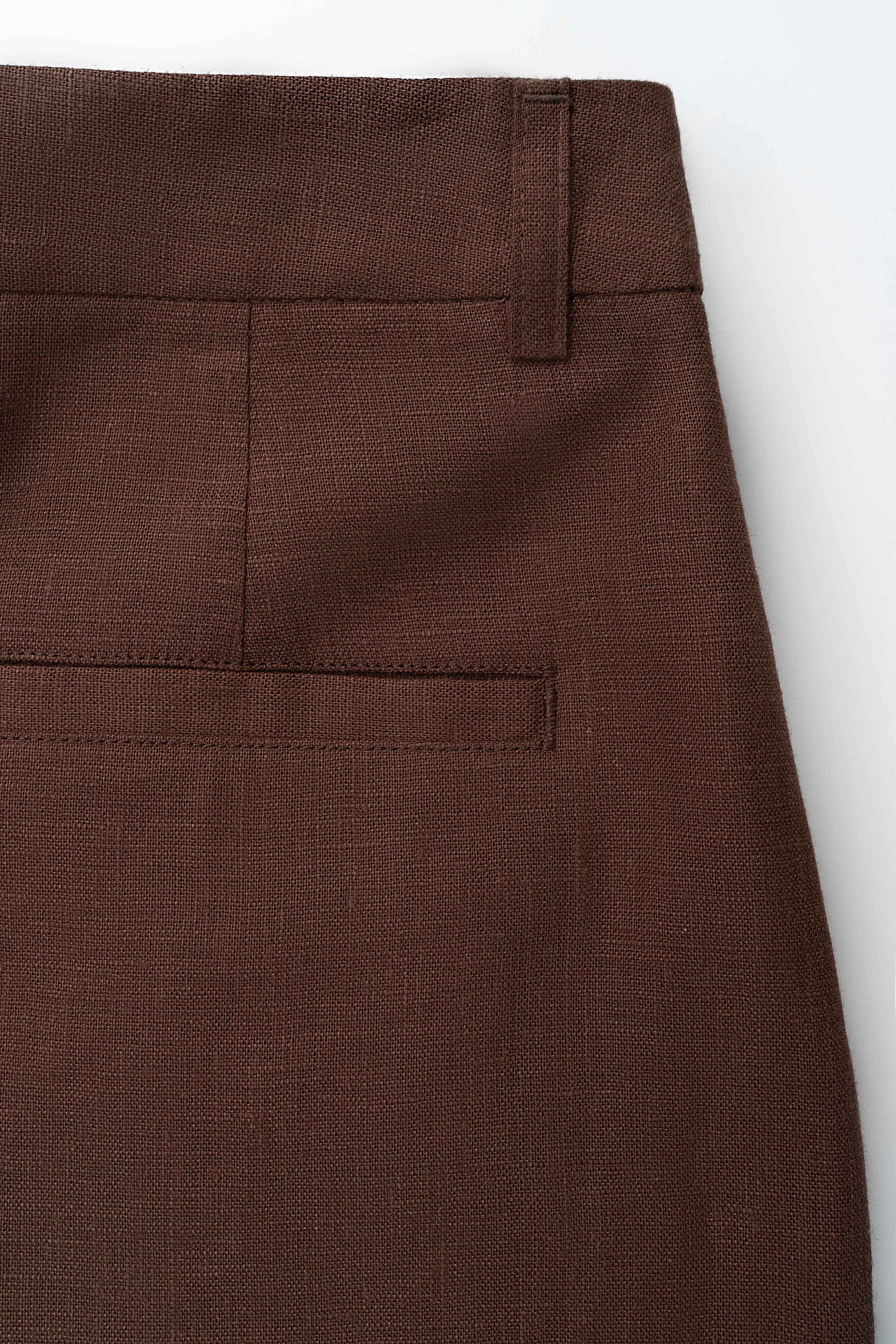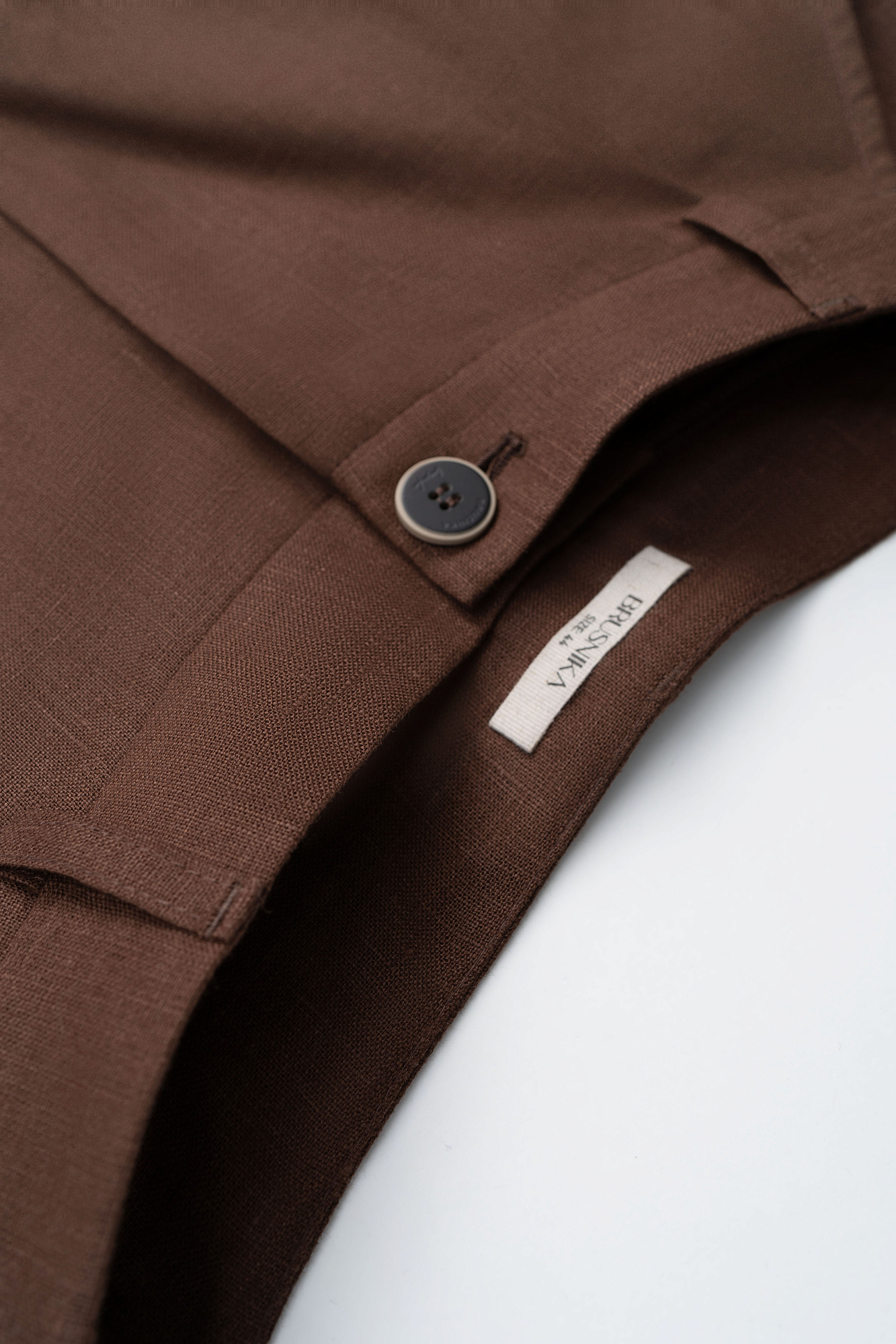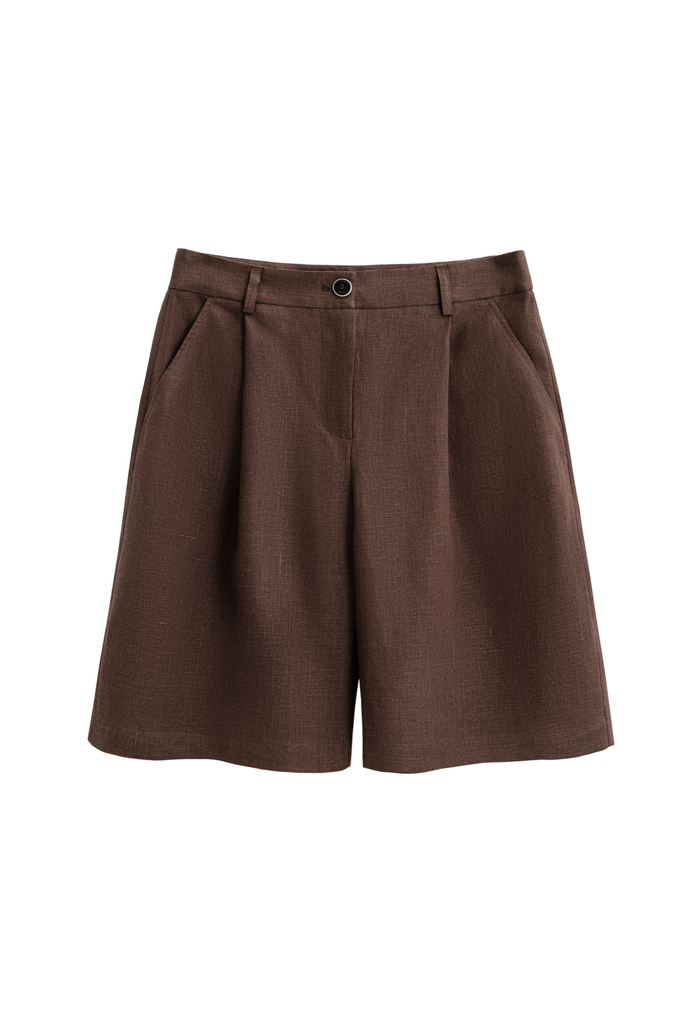 Шорты из 100% льна. Модель с высокой посадкой, широкими штанинами и складками спереди. Два кармана спереди и сзади. Застежка на пуговицу и молнию. Шлевки на поясе для ремня.