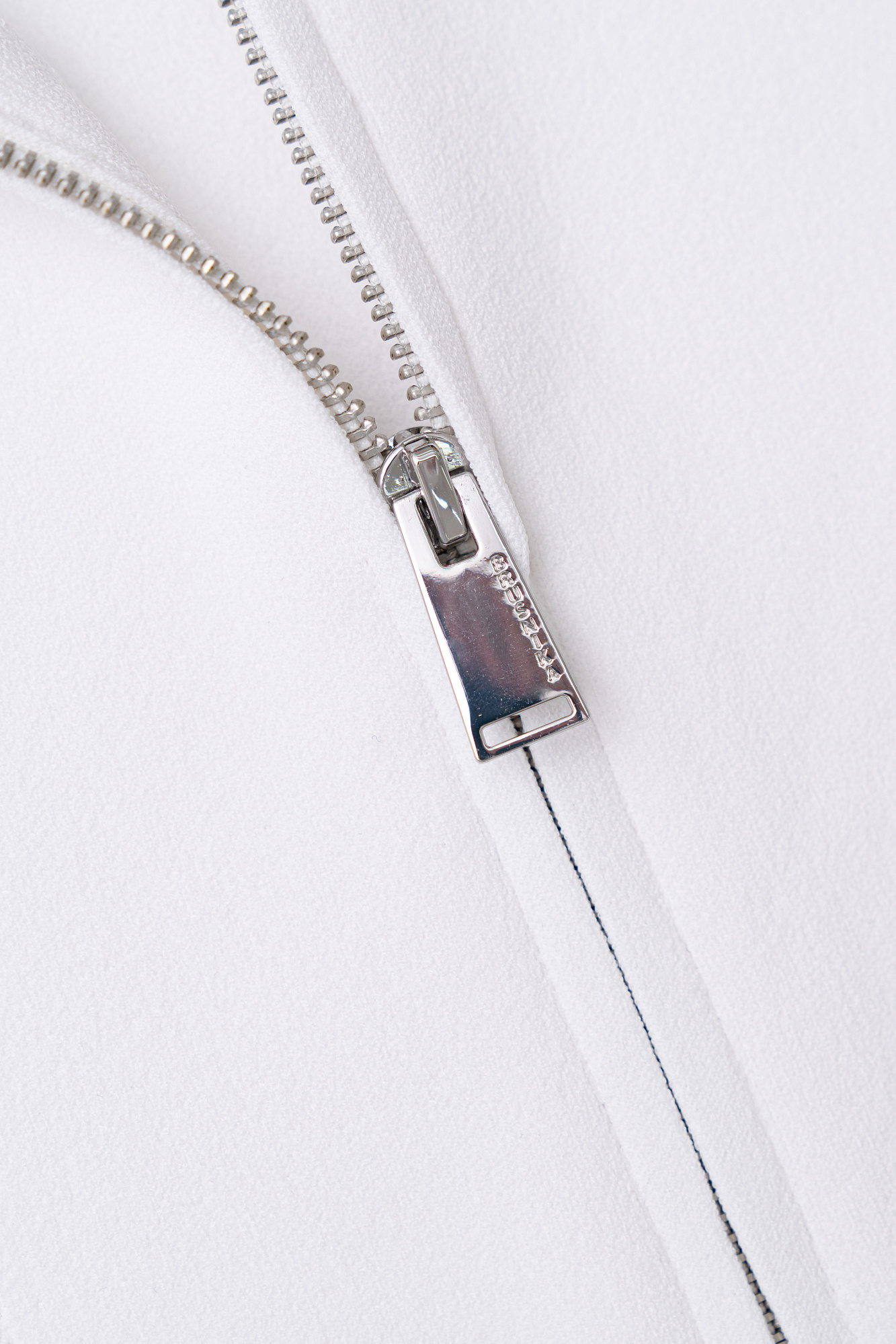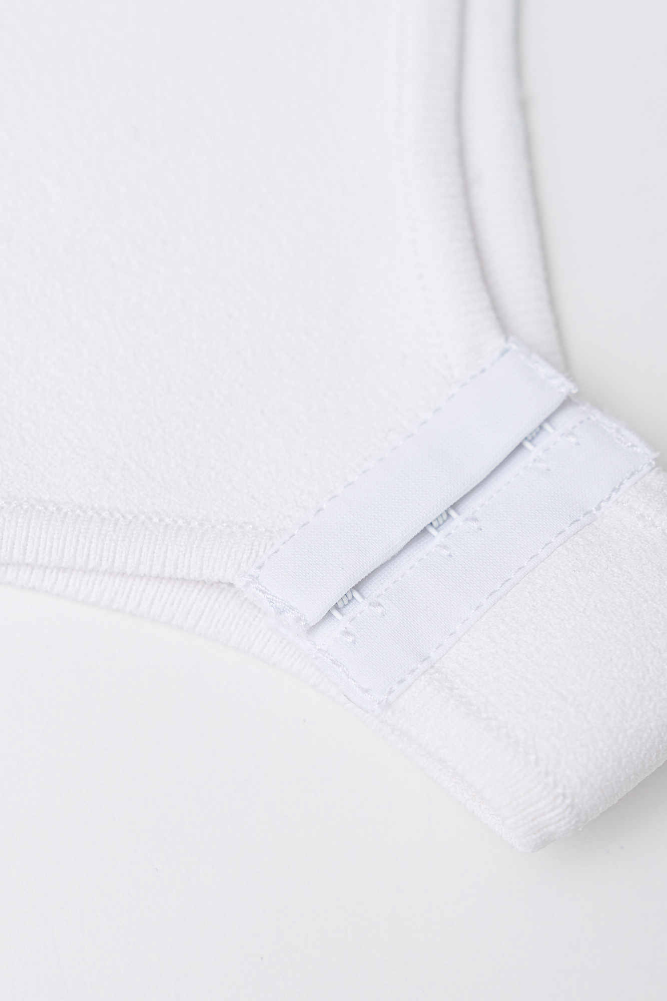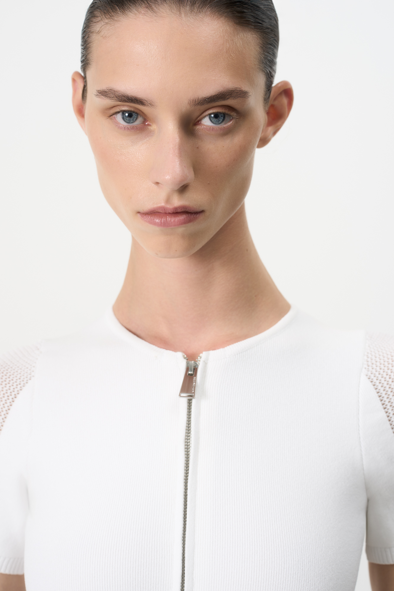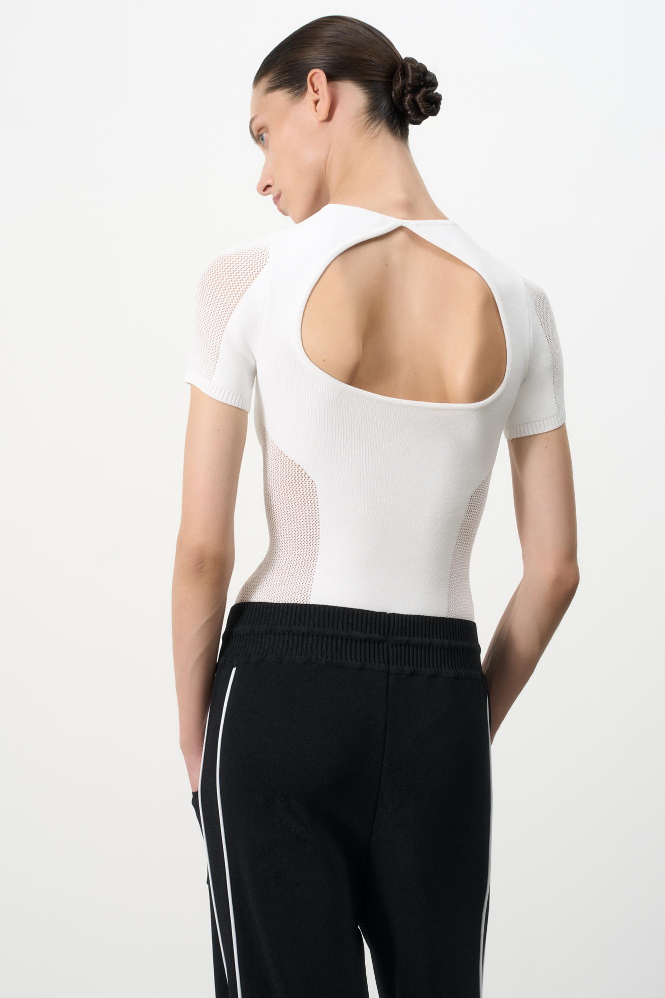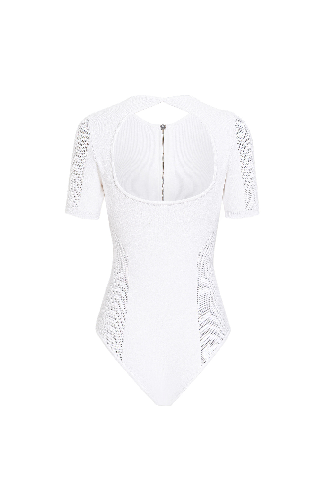 Трикотажное боди из вискозы. Модель с короткими рукавами, застежкой на молнию спереди и вырезом на спине. При изготовлении изделия используется комбинированная вязка: гладью в мелкий рубчик и сетку. Застежка на бельевые крючки.