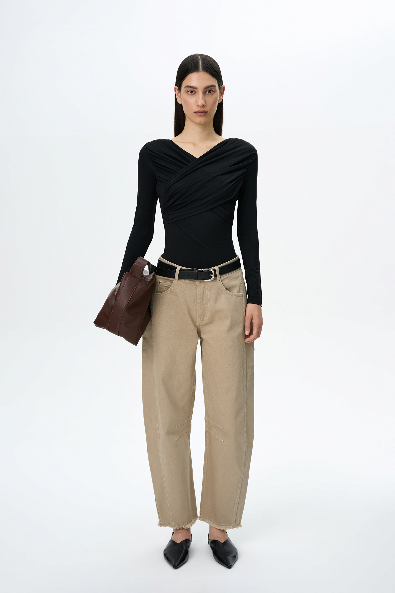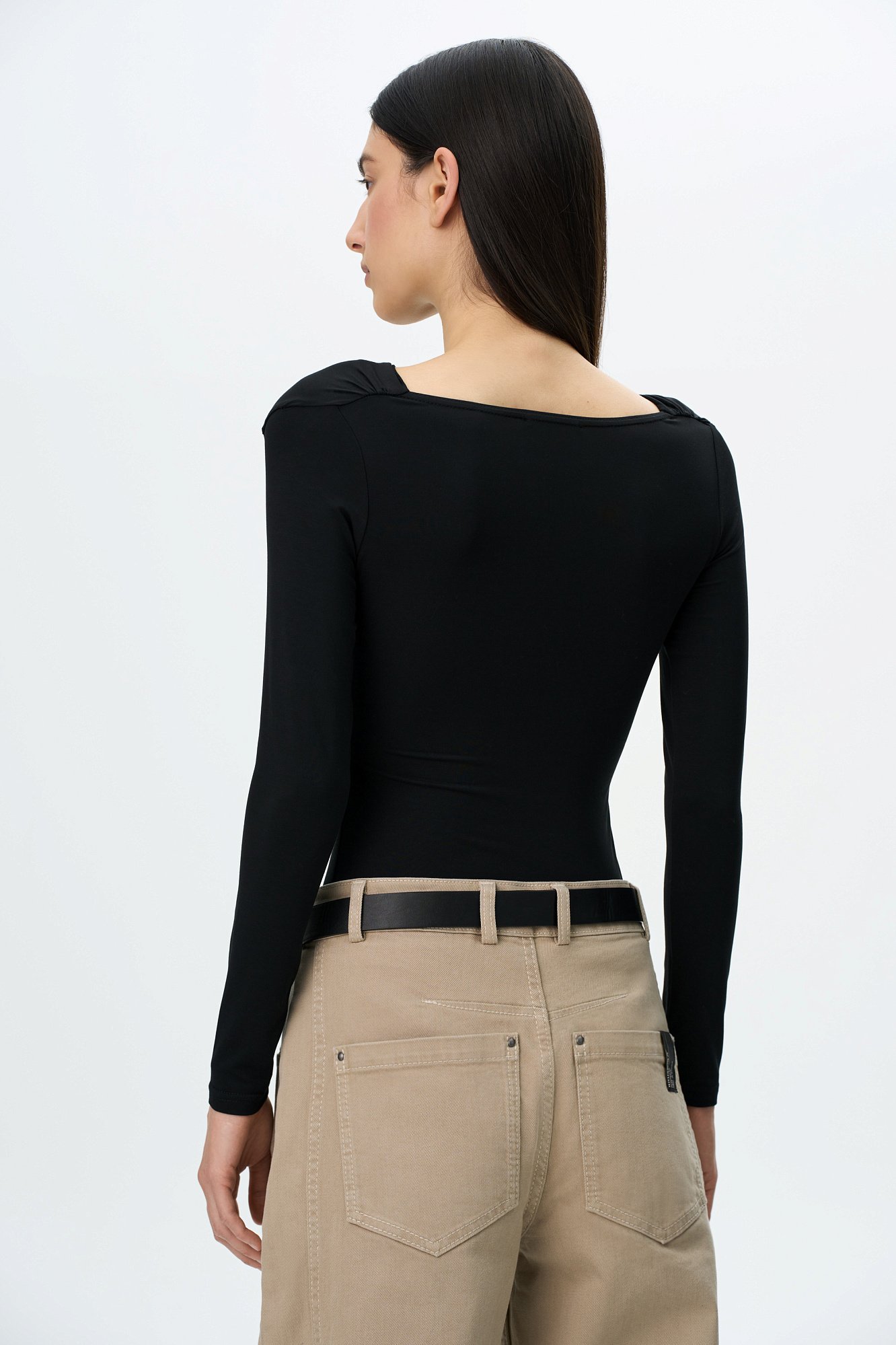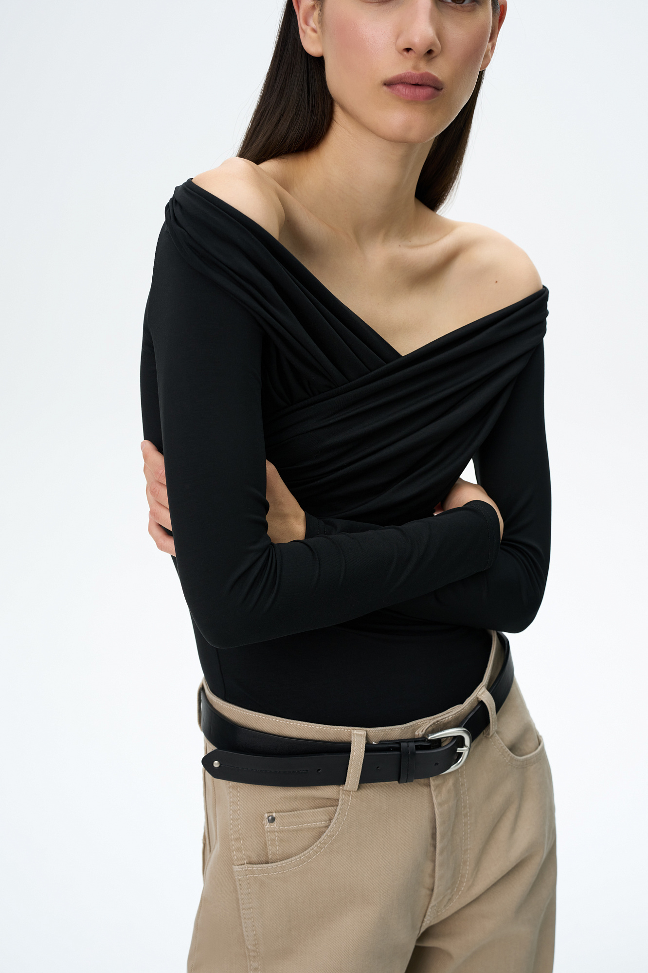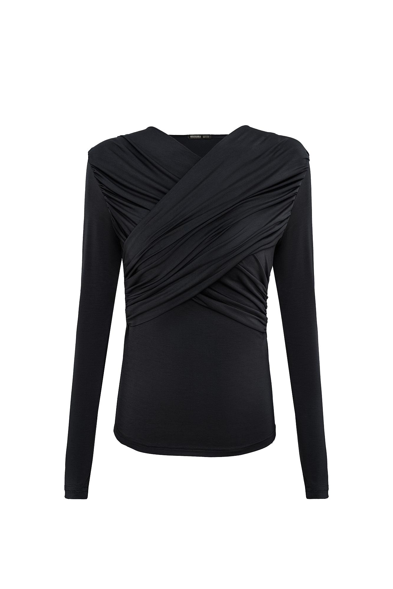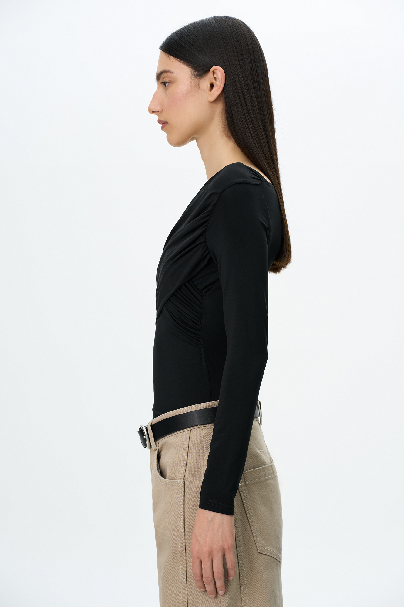 Удлиненный топ с драпировкой на груди. Модель приталенного силуэта с длинным рукавом, выполнена из мягкой и шелковистой ткани.
