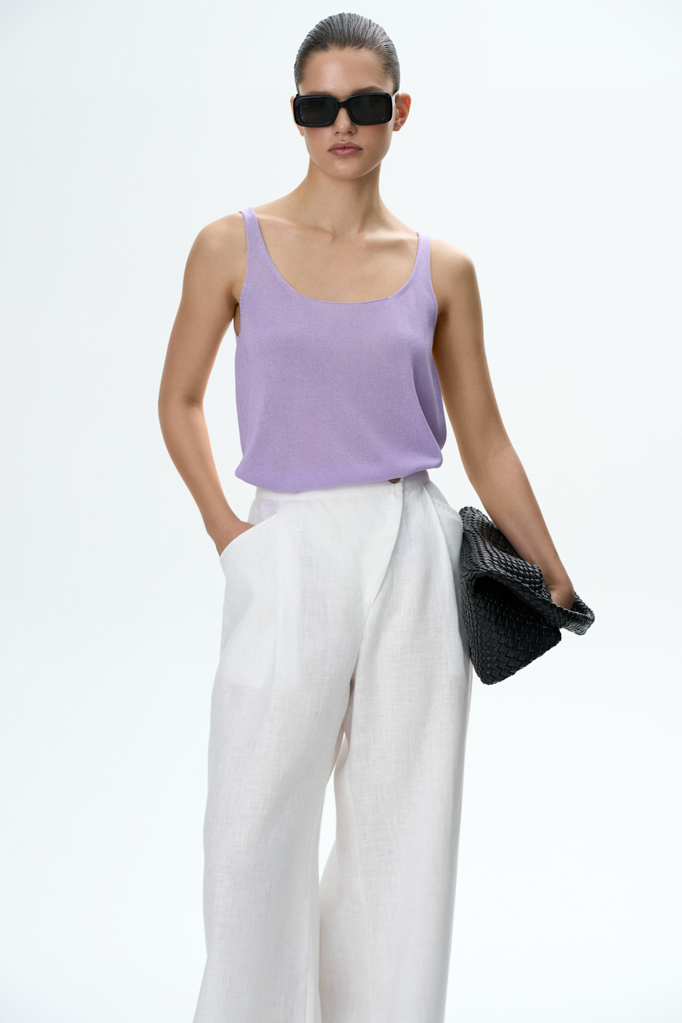 Цельновязаная полупрозрачная майка из вискозы. Круглый вырез и тонкие бретели.